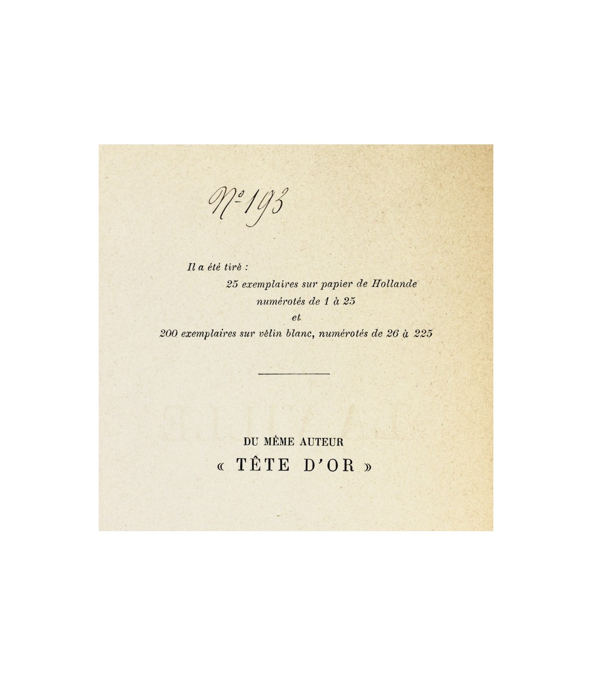 Édition originale. Elle parut anonymement, tout comme Tête d'or (1890) qui est simplement annoncé «du même auteur». Un des 200 exemplaires numérotés sur vélin blanc, celui-ci n°193.