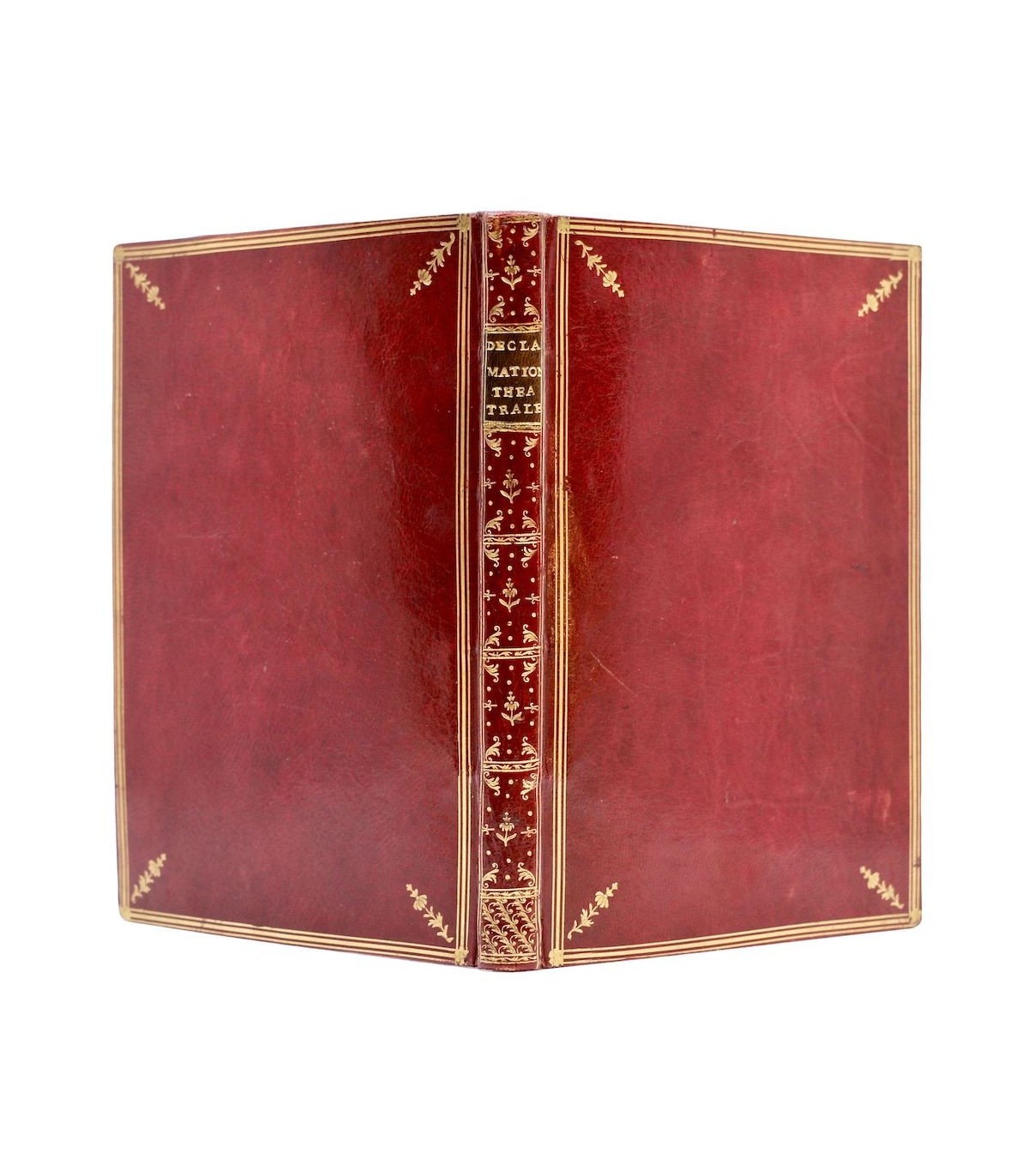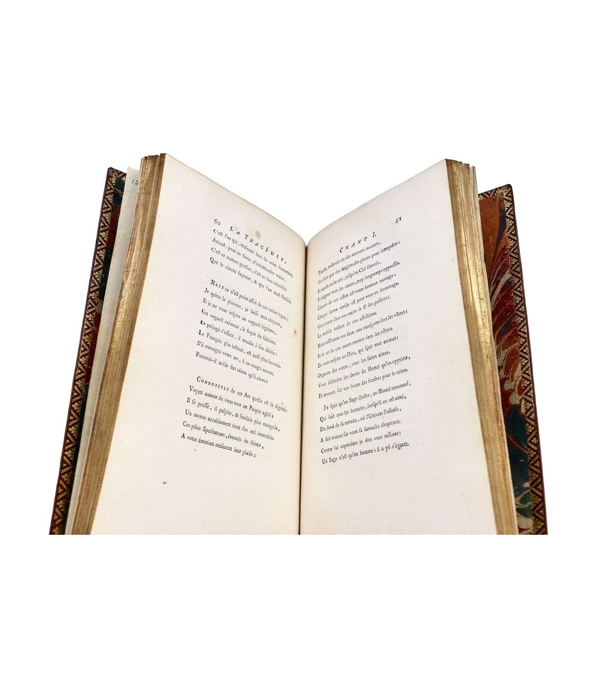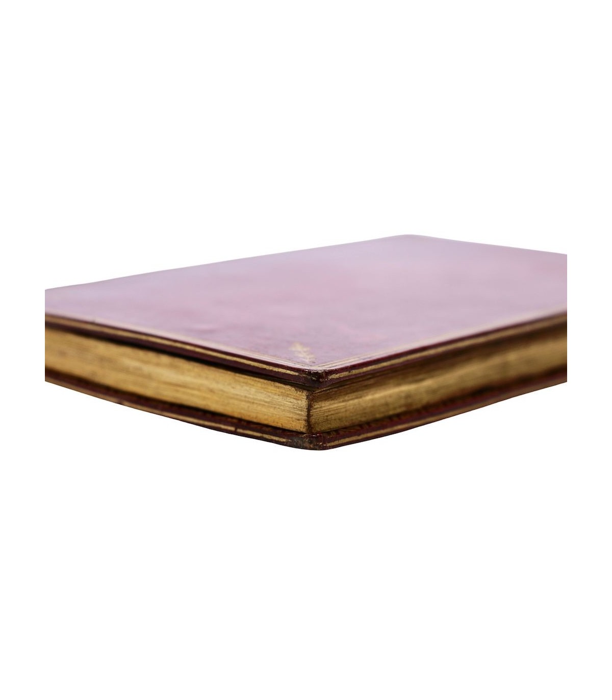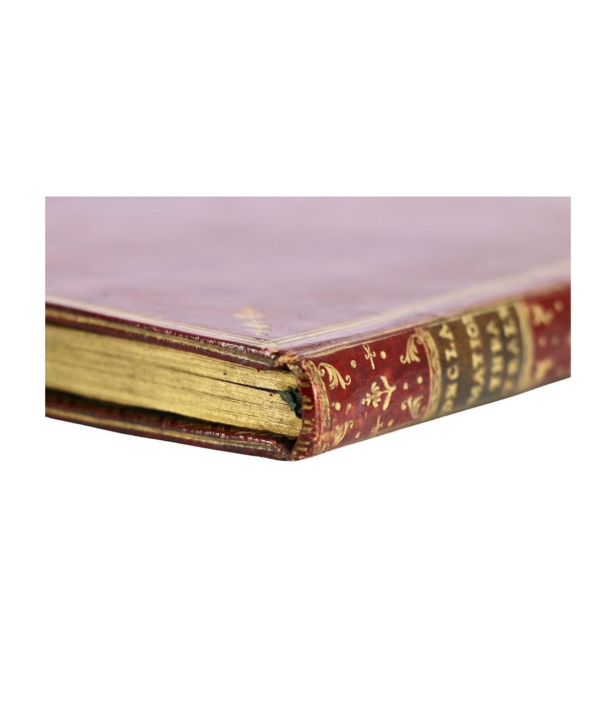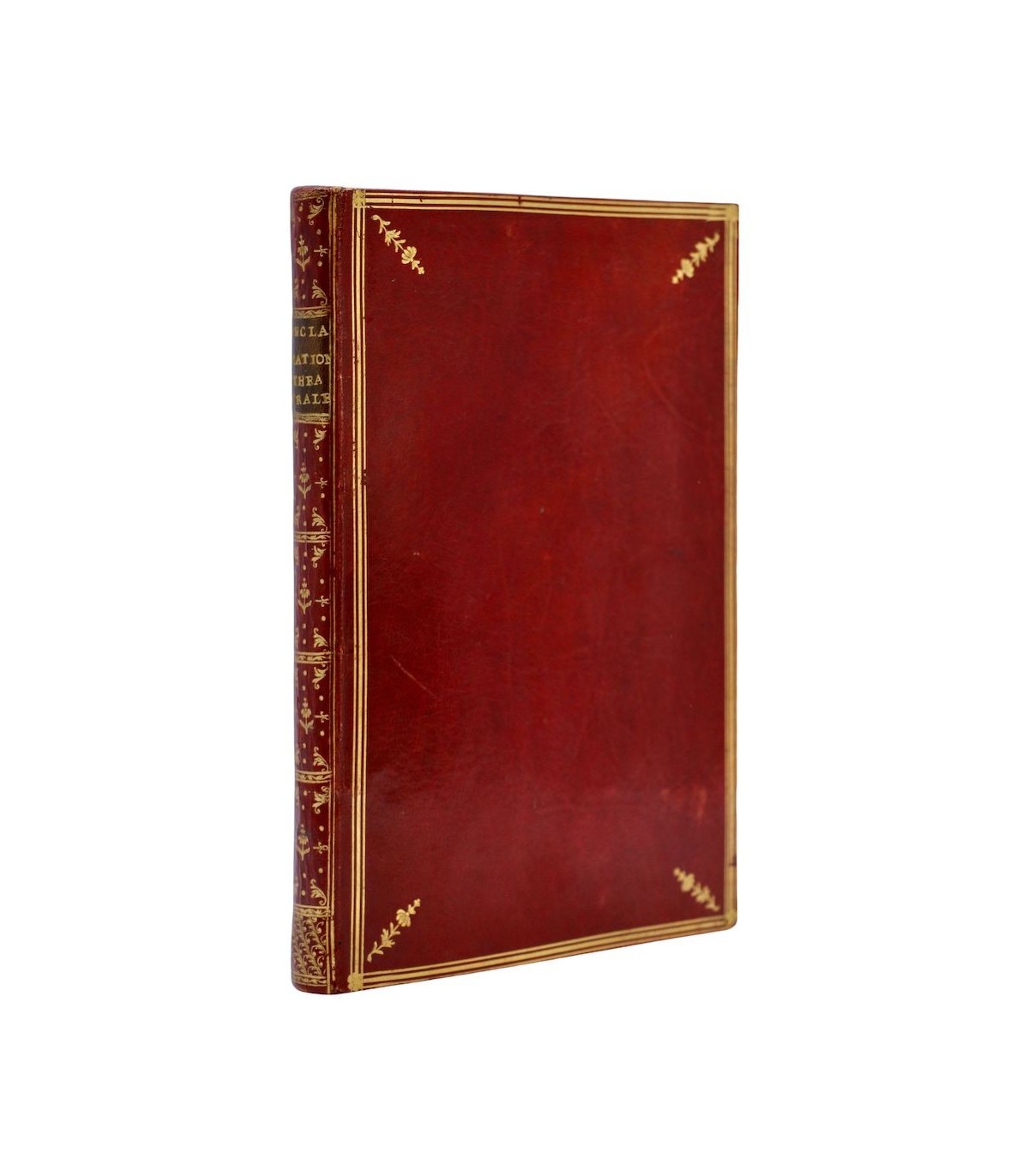 In-8 (20,7cm x 14,2cm) de 128pp. Plein maroquin rouge, dos lisse orné de fleurons dorés, pièce de titre de maroquin vert, plats décorés d’un encadrement de filets dorés et de 4 fleurons aux angles, coiffes guillochées, filet doré parcourant les coupes, frise dorée en bordure des contreplats, tranches dorées, doublures et gardes de papier marbré (reliure d’époque).