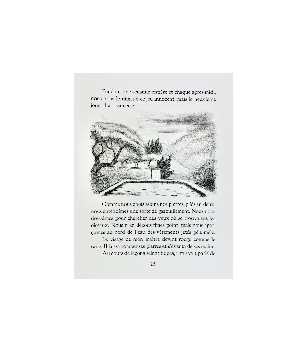 Édition originale illustrée de 26 pointes sèches par Charles Picart Le Doux, dont le frontispice, 16 hors-texte et 9 in-texte. Un des exemplaires numérotés, celui-ci n°VI, enrichi de 2 dessins originaux au crayon et à l’encre de chine signés, repris pour les illustrations hors-texte gravées des pages 51 et 66.