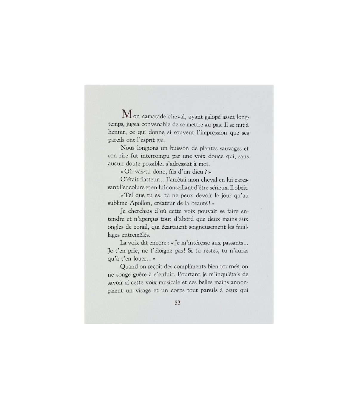 In-4 (32cm x 25,5cm) de 120-[2]pp. Tirage unique limité à 135 exemplaires numérotés sur vélin de Rives. En feuilles sous couverture imprimée à rabats, chemise et étui.