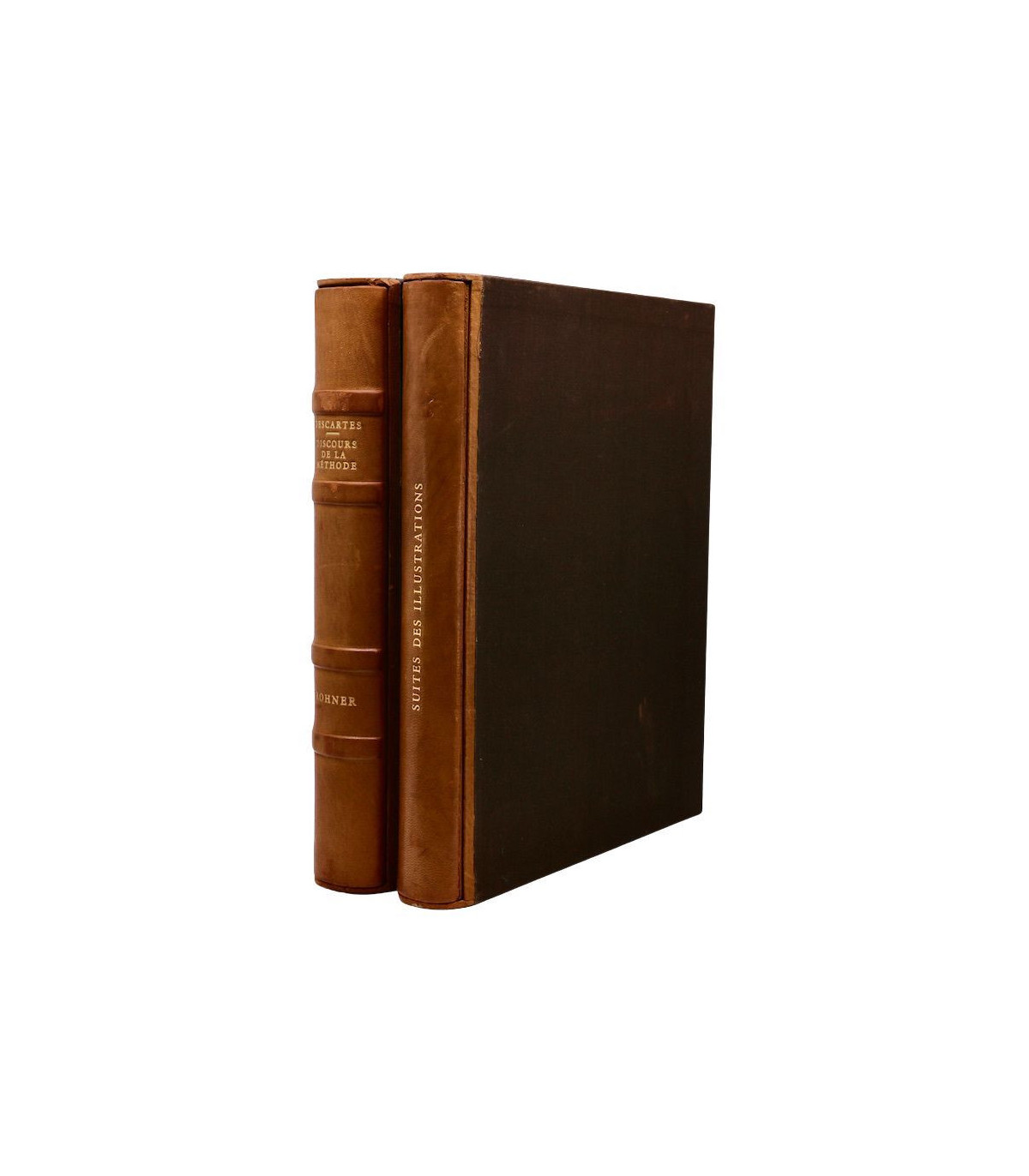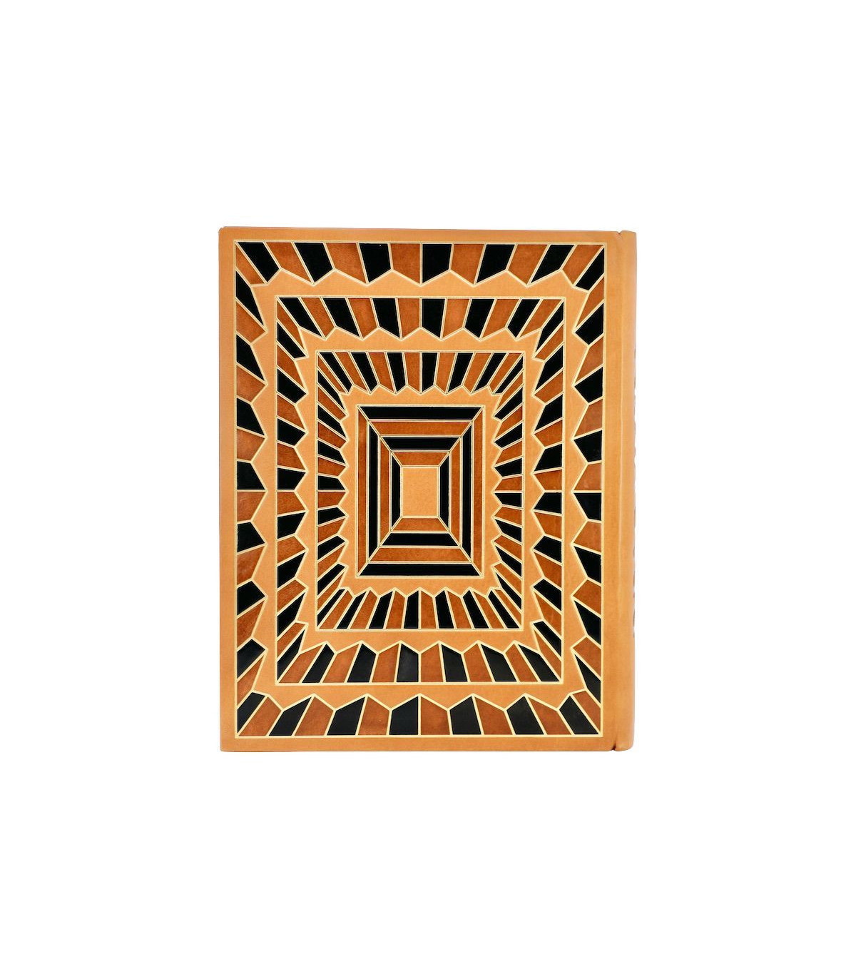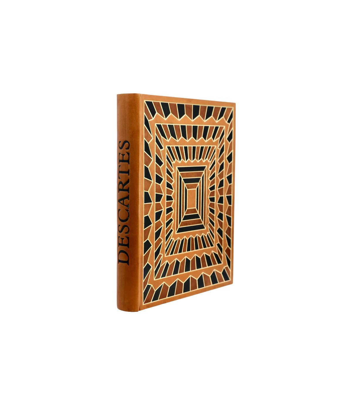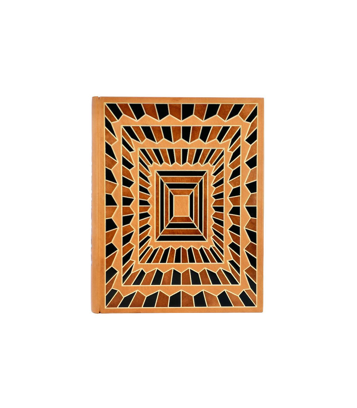 Plein cuir havane, dos lisse orné de l’auteur en lettres noires, plats décorés d'une composition géométrique mosaïquée de box marron et noir rehaussée de filets dorés, doublures et gardes de papier tissé marron, tête dorée, sous chemise demi-cuir havane à rabats et étui bordé (reliure éditeur).