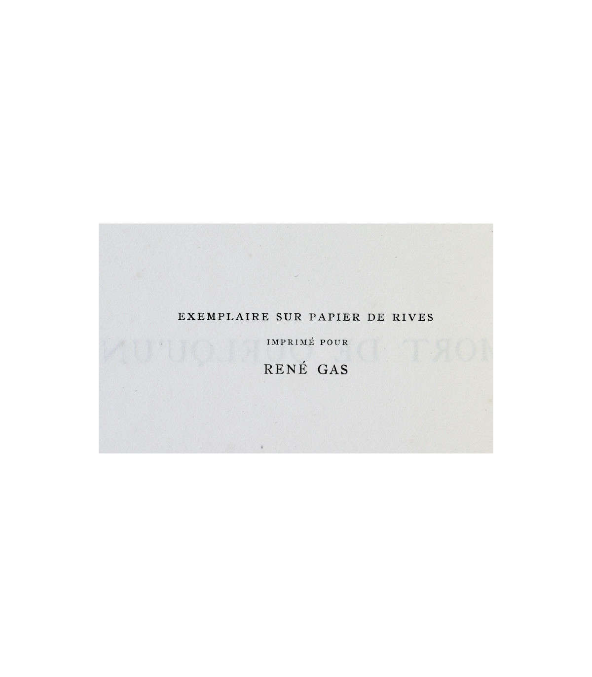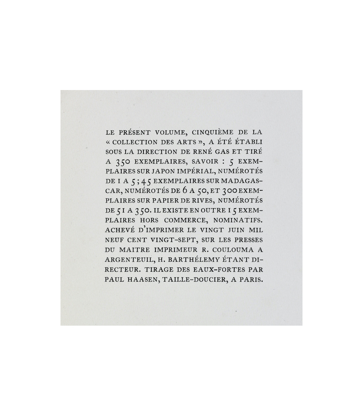 In-8 (22,4cm x 19,6cm) de [8]-172-[1]pp. Tirage à 365 exemplaires numérotés, dont 5 ex. sur Japon impérial, 45 ex. sur Madagascar et 300 ex. sur papier de Rives et 15 ex. hors-commerce. Broché à couverture imprimée et rempliée, étui.