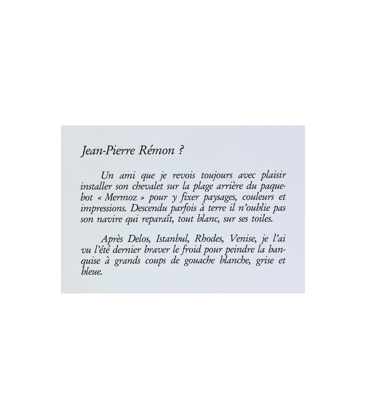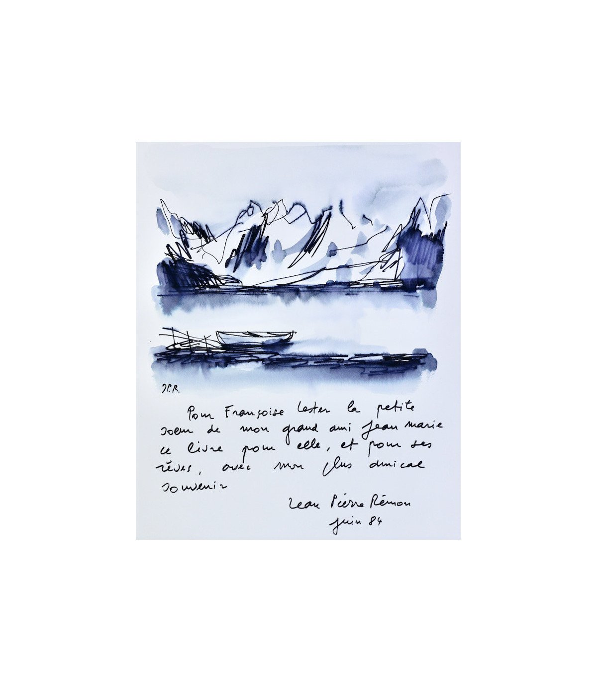 Ouvrage illustré de 15 aquarelles rehaussées en couleurs à la main par Jean-Pierre Rémon, dont 10 in-texte, 4 hors-texte et une double page. Exemplaire non justifié, enrichi d’une aquarelle originale (21cm x 18cm) accompagnée d’un envoi autographe daté et signé de l’artiste.