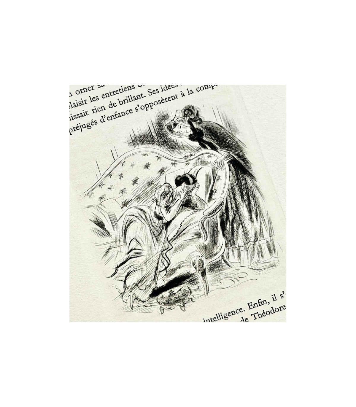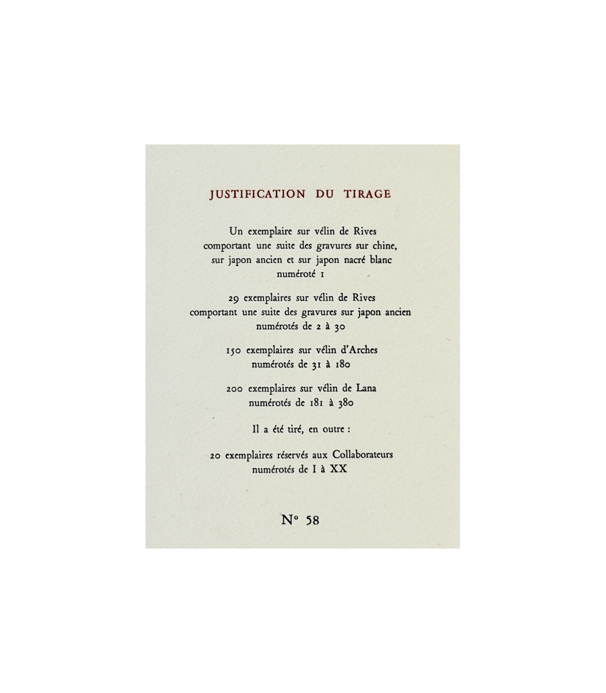 Ouvrage illustré de 13 gravures à l’eau-forte par Jacques Boullaire, dont le frontispice, une vignette de titre et 11 in-texte. Un des 150 exemplaires numérotés sur vélin d’Arches, celui-ci n°58.