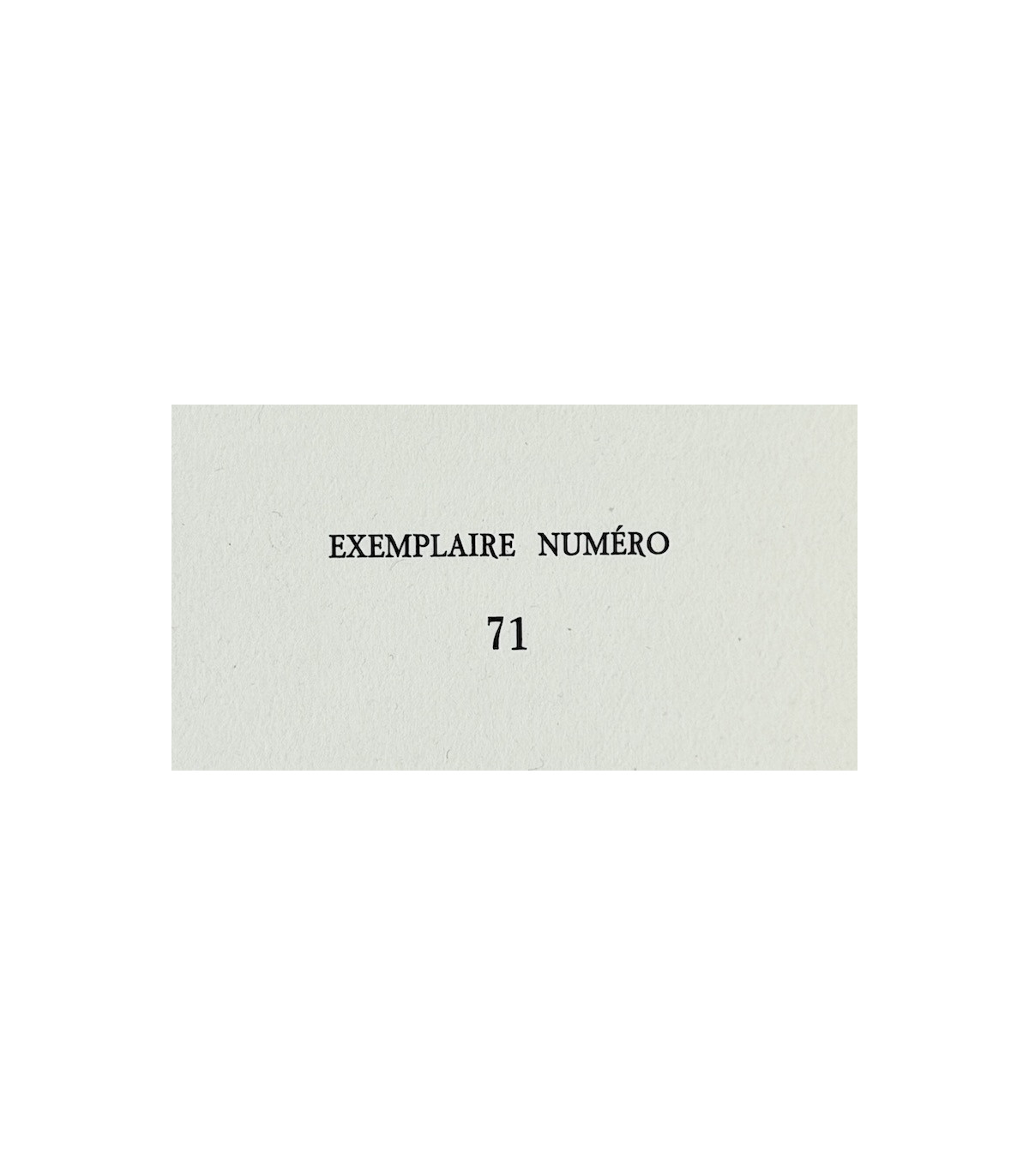 In-8 (26cm x 16,5cm) de [2]-80-[5]pp. Tirage limité à 200 exemplaires numérotés, dont 50 exemplaires sur vélin de Rives teinté et 150 exemplaires sur vélin de Lana.