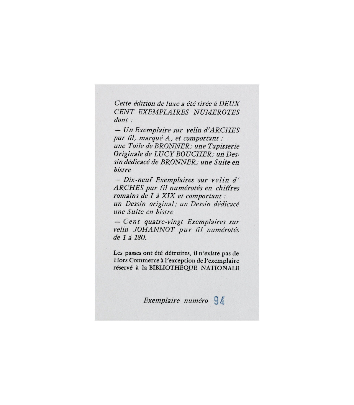 Ouvrage orné d'illustrations par Bronner et d'enluminures par Lucy Boucher. Un des 180 exemplaires numérotés sur vélin Johannot, celui-ci n°94.