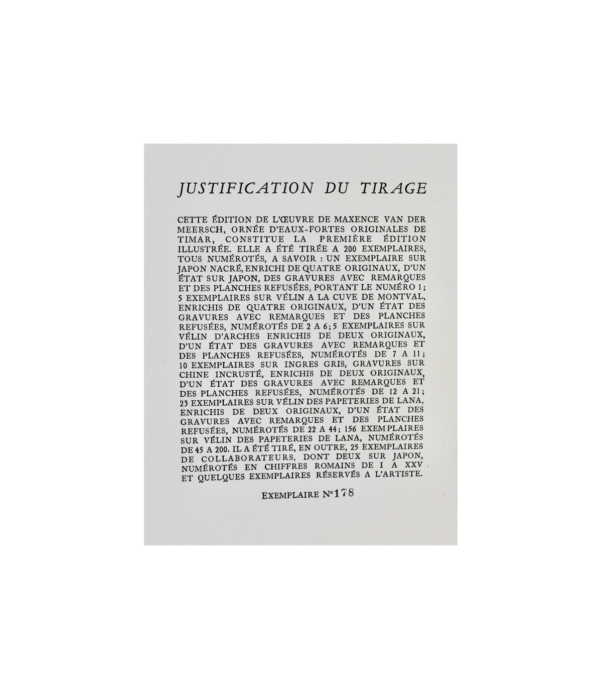 Première édition illustrée de gravures sur cuivre de Timar. Un des 156 exemplaires numérotés sur vélin de Lana, celui-ci n°178, enrichi d’un hommage de l’auteur sur la page de faux titre du tome 1.