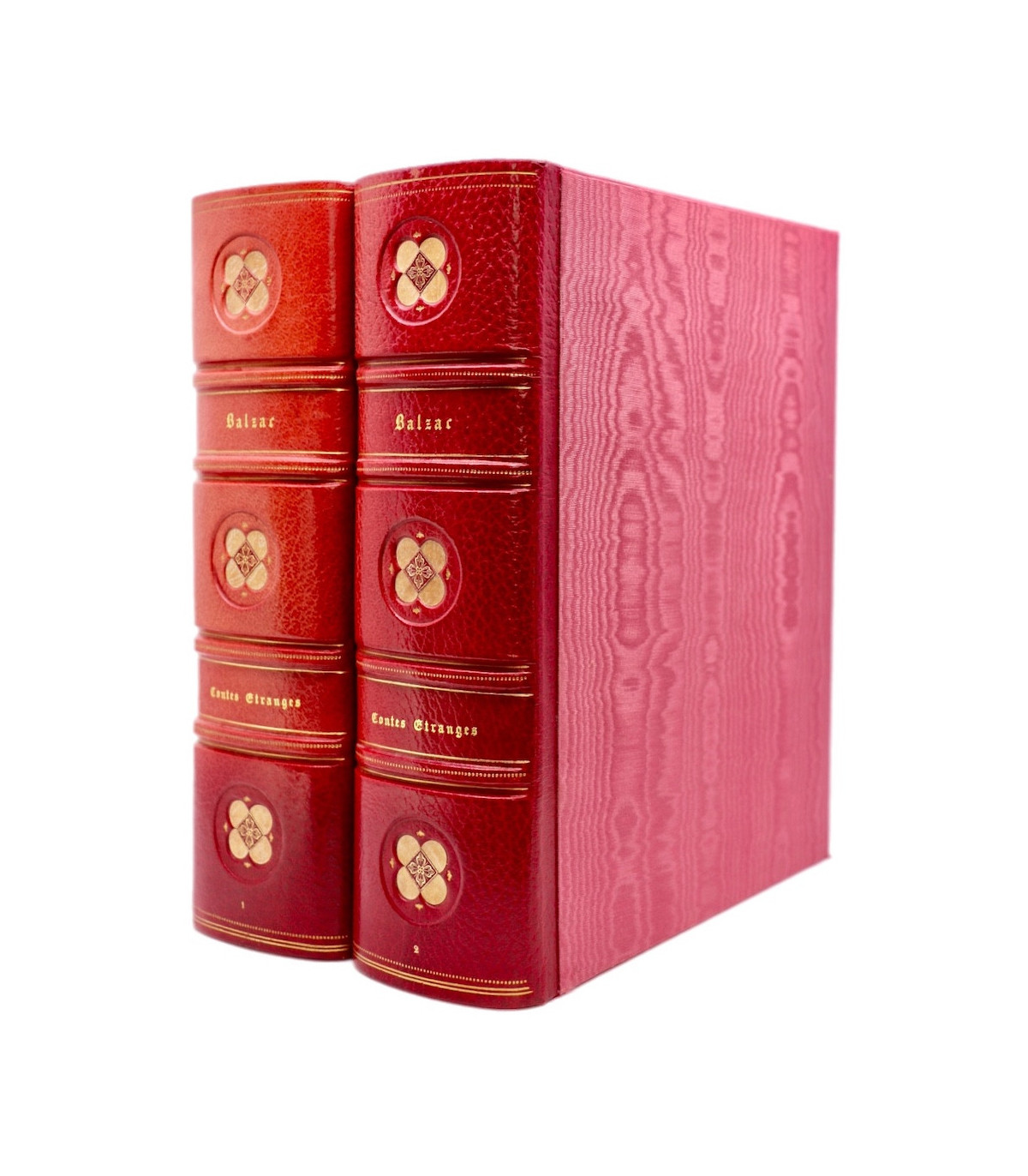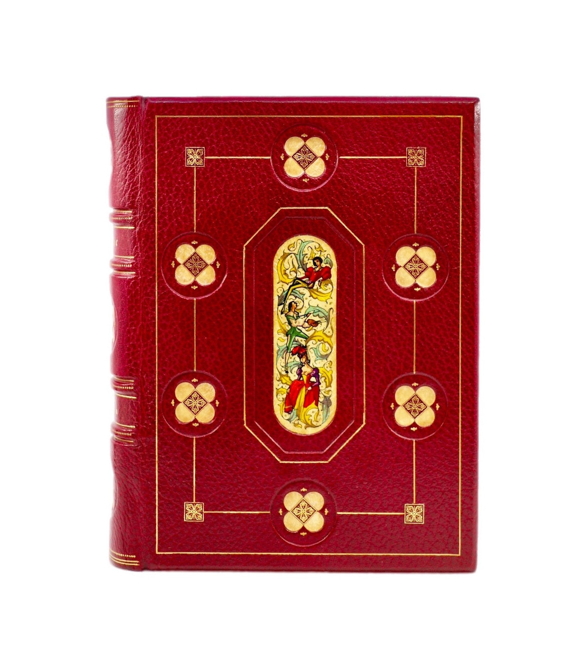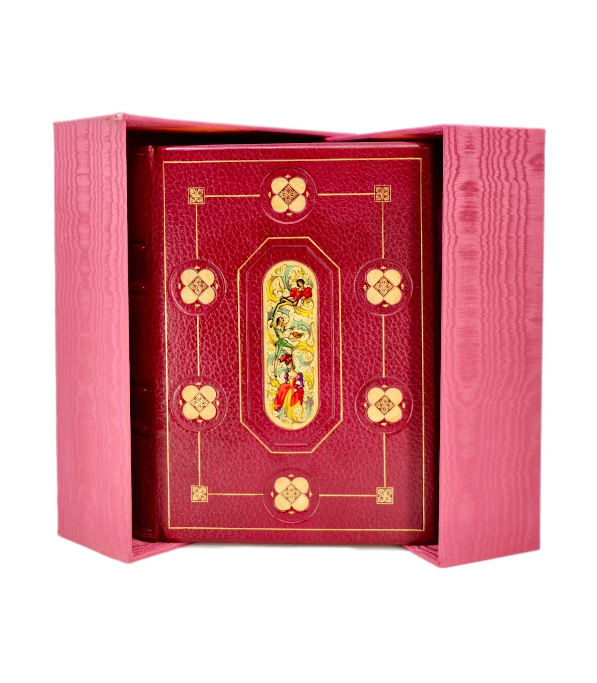 2 volumes in-4 (28cm x 22cm) de 272-[1]pp. & 254-[6]pp. Tirage à 1900 exemplaires numérotés sur vélin de Lana. Plein cuir maroquiné bordeaux orné de décors mosaïqués et dorés, premier plat décoré au centre d’une composition peinte à la main (différente pour chaque volume), doublure et gardes de soie moirée framboise, tête dorée, emboitage (reliure éditeur).