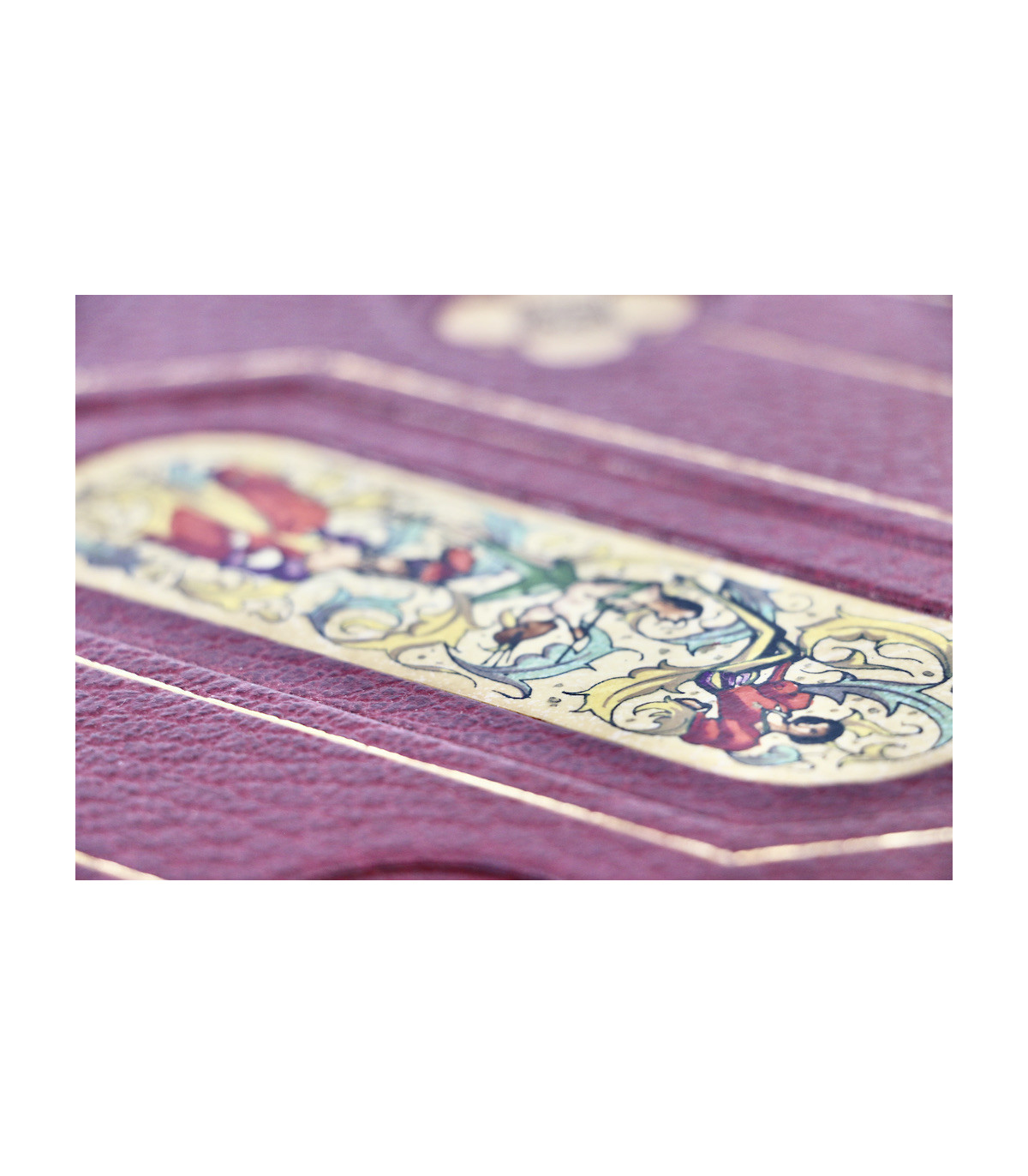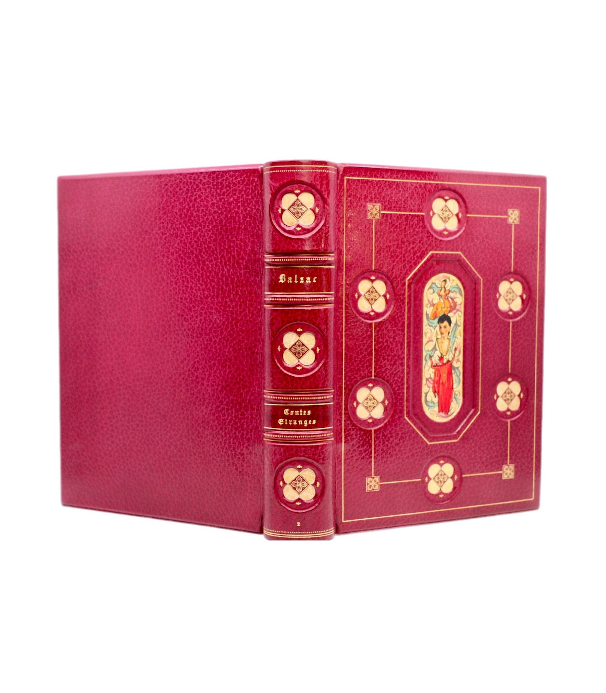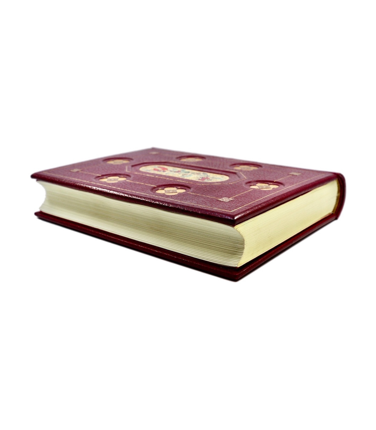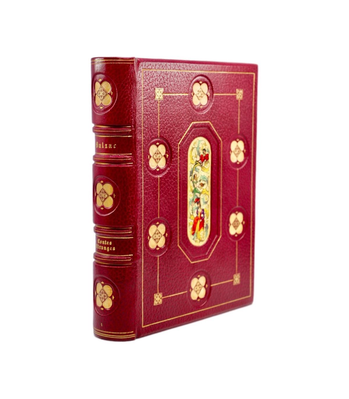 2 volumes in-4 (28cm x 22cm) de 272-[1]pp. & 254-[6]pp. Tirage à 1900 exemplaires numérotés sur vélin de Lana. Plein cuir maroquiné bordeaux orné de décors mosaïqués et dorés, premier plat décoré au centre d’une composition peinte à la main (différente pour chaque volume), doublure et gardes de soie moirée framboise, tête dorée, emboitage (reliure éditeur).