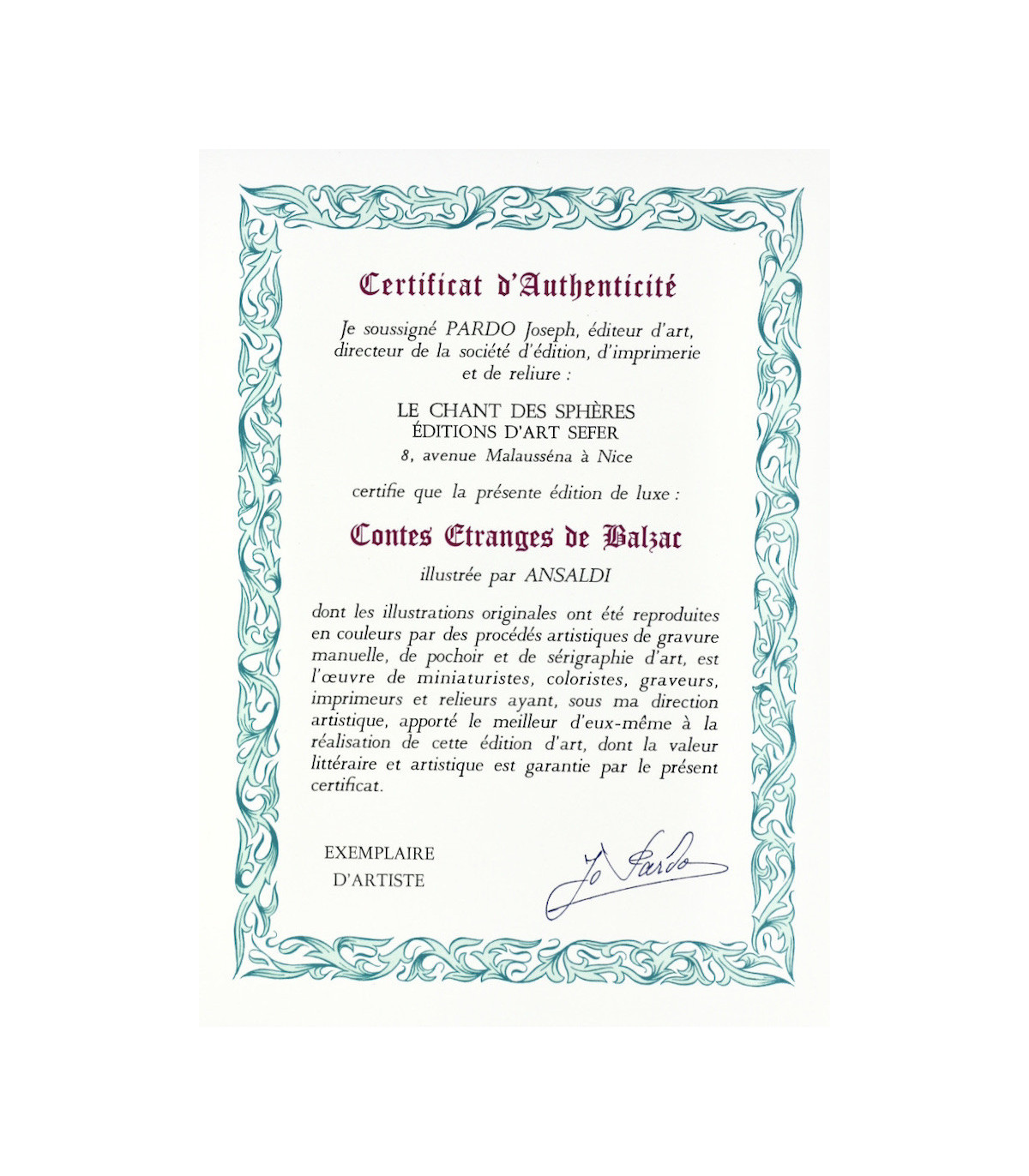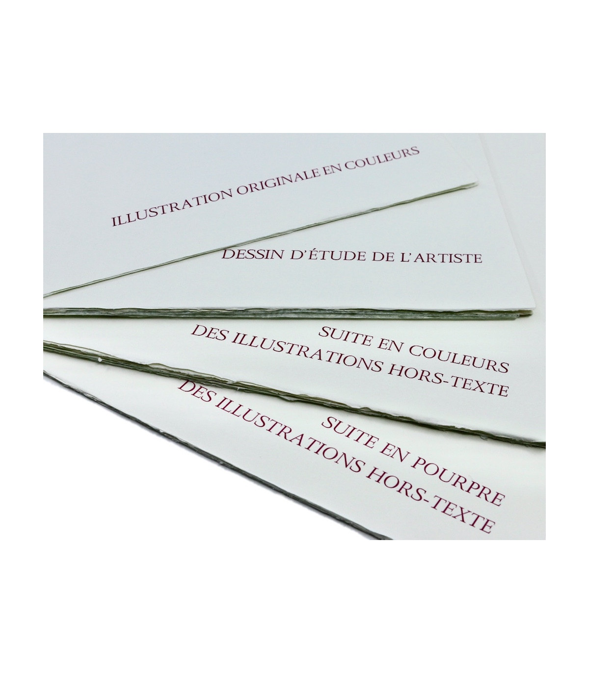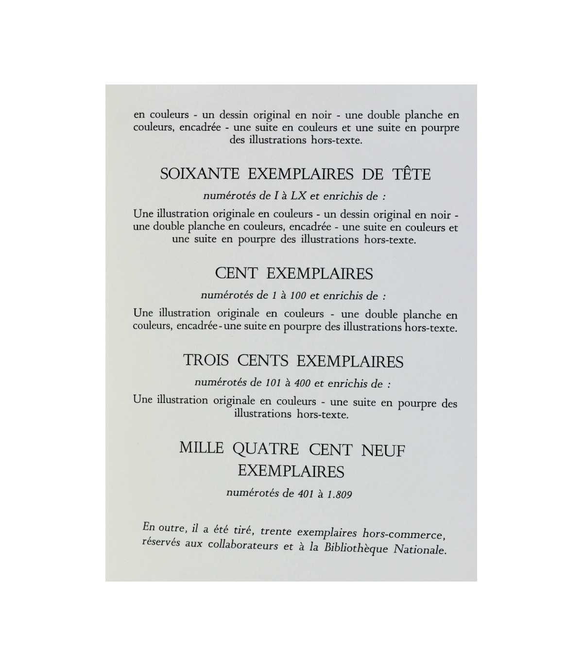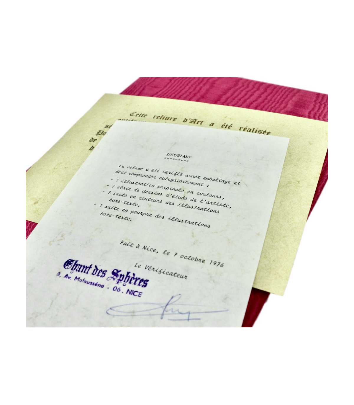 Ouvrage illustré par Arnaud Ansaldi de nombreuses compositions reproduites en couleurs au pochoir. Un des 3 exemplaires d’artiste comportant, pour chaque volume, une illustration originale en couleurs, 5 dessins d’étude de l’artiste, une suite en couleurs des hors-texte et une suite en pourpre des hors-texte, bien complet de son certificat d’authenticité. Il manque à cet exemplaire l’illustration originale en couleurs sur parchemin véritable encadrée annoncée à la justification.