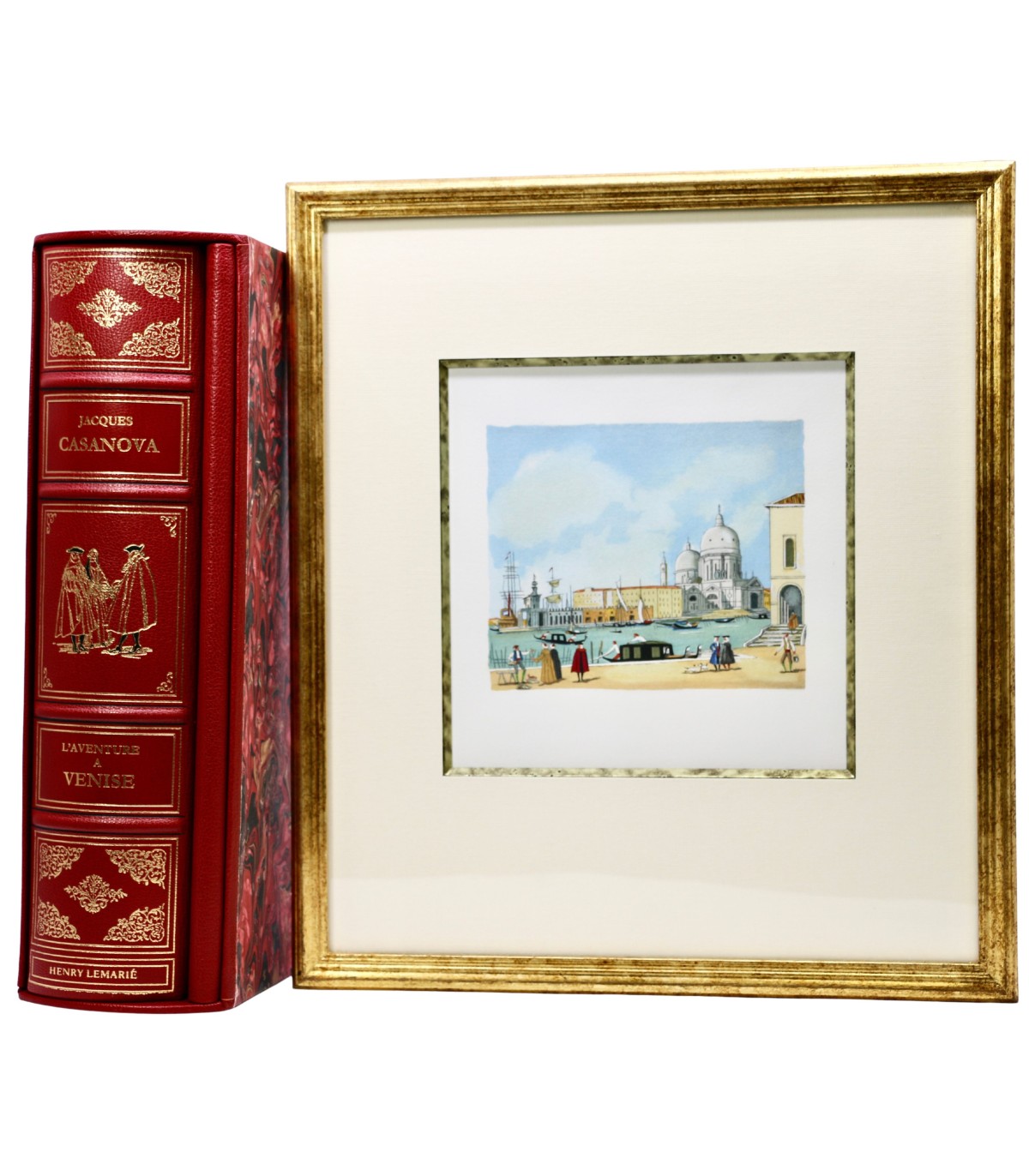 In-4 (30cm x 23,5cm) de 302-[9]pp. Tirage à 700 exemplaires numérotés sur vélin d’Arches pur chiffon. Plein maroquin rouge, dos à 4 faux nerfs orné, auteur, titre et illustrateur frappés or, plats encadrés d’un double filet doré et de 4 fleurons aux angles, premier plat décoré au centre d’un médaillon en creux figurant des masques vénitiens, roulette dorée encadrant les contreplats, doublures et gardes de soie moirée crème, tête dorée, étui bordé (reliure éditeur).