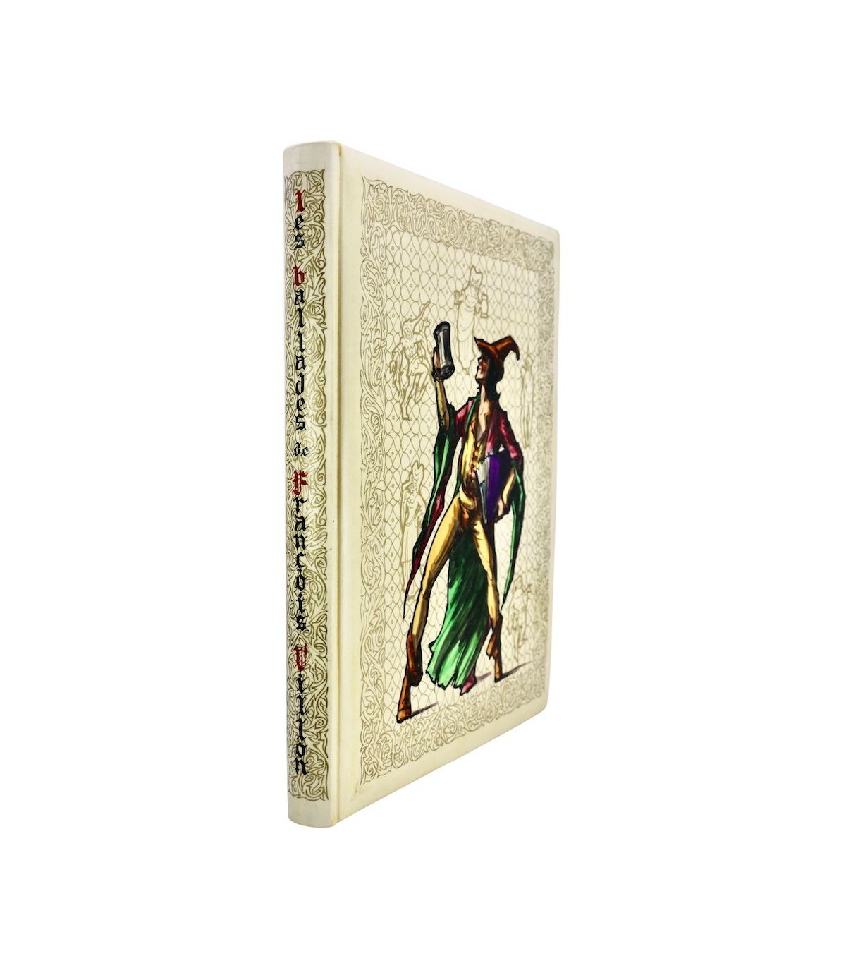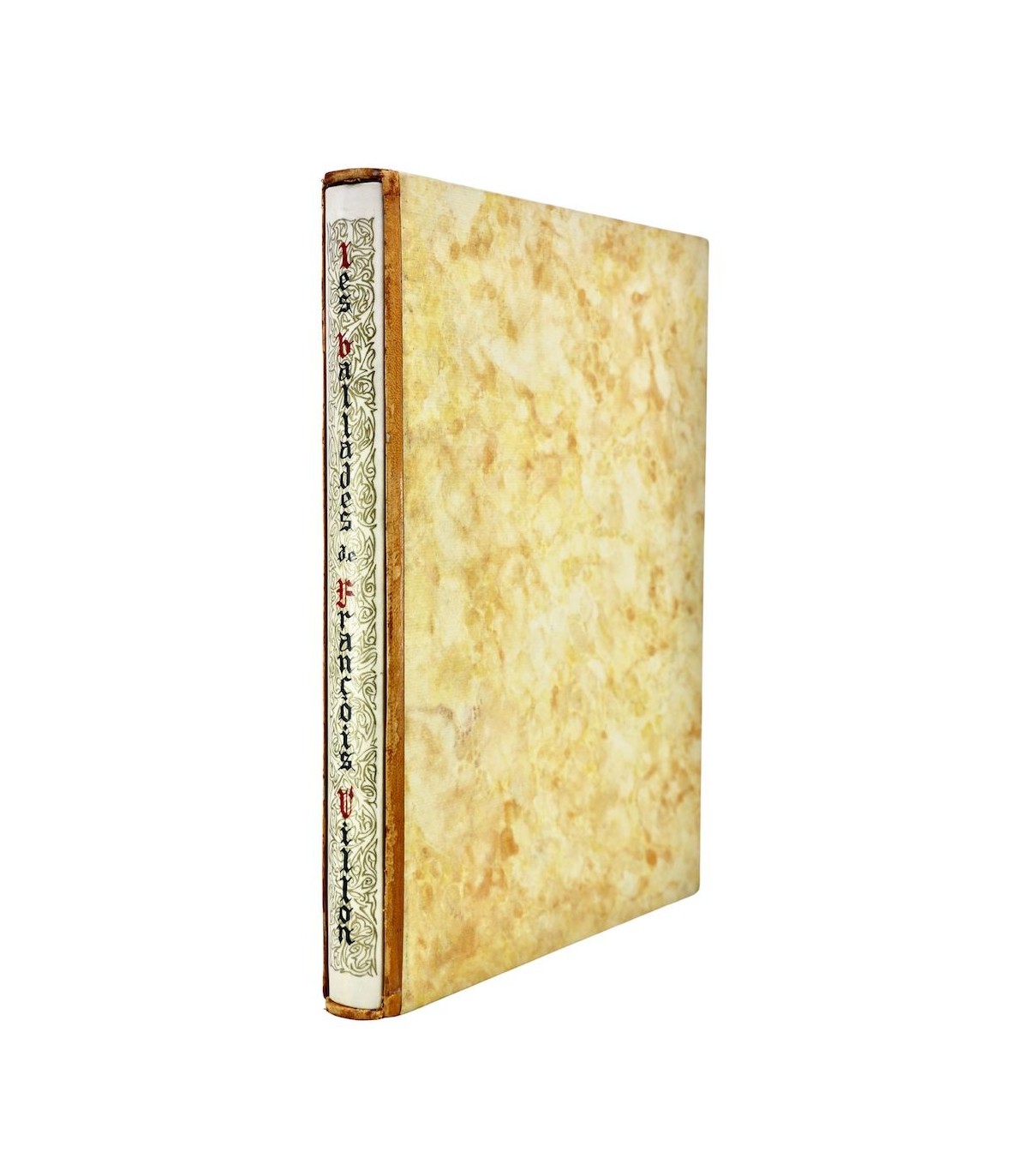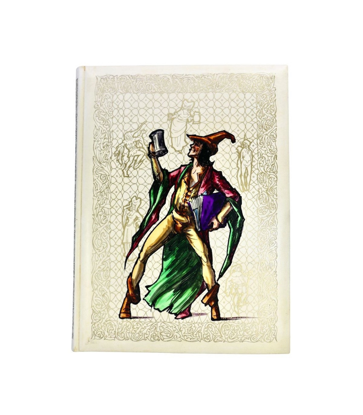 Plein vélin, dos lisse orné de motifs dorés et du titre en noir et rouge en long, premier plat décoré d’une grande composition peinte à la main sur un fond de motifs dorés, tête dorée, étui.