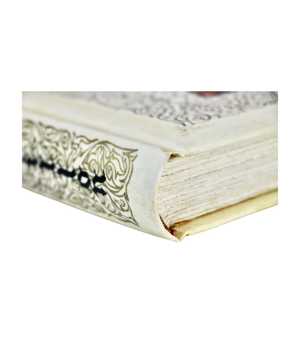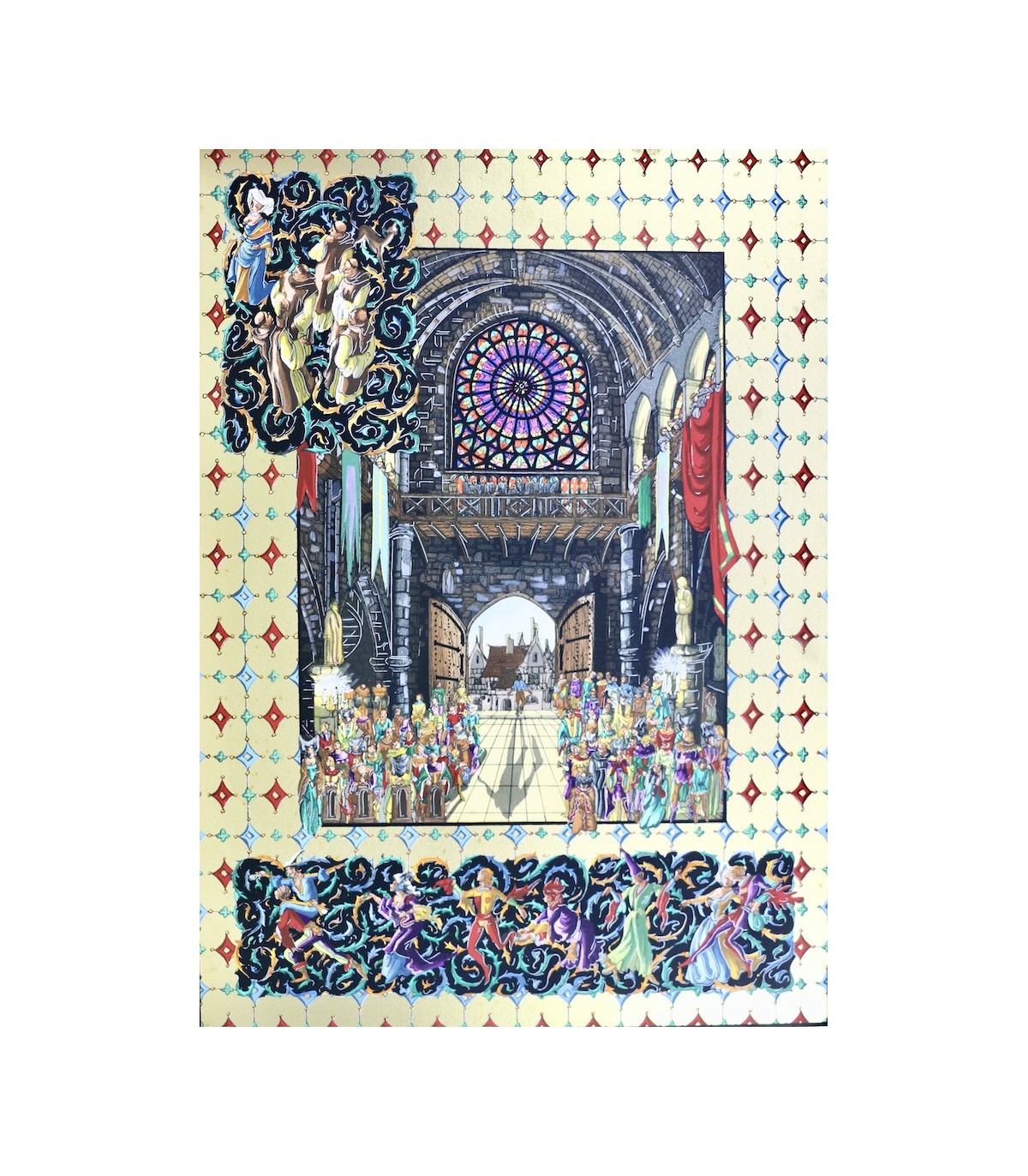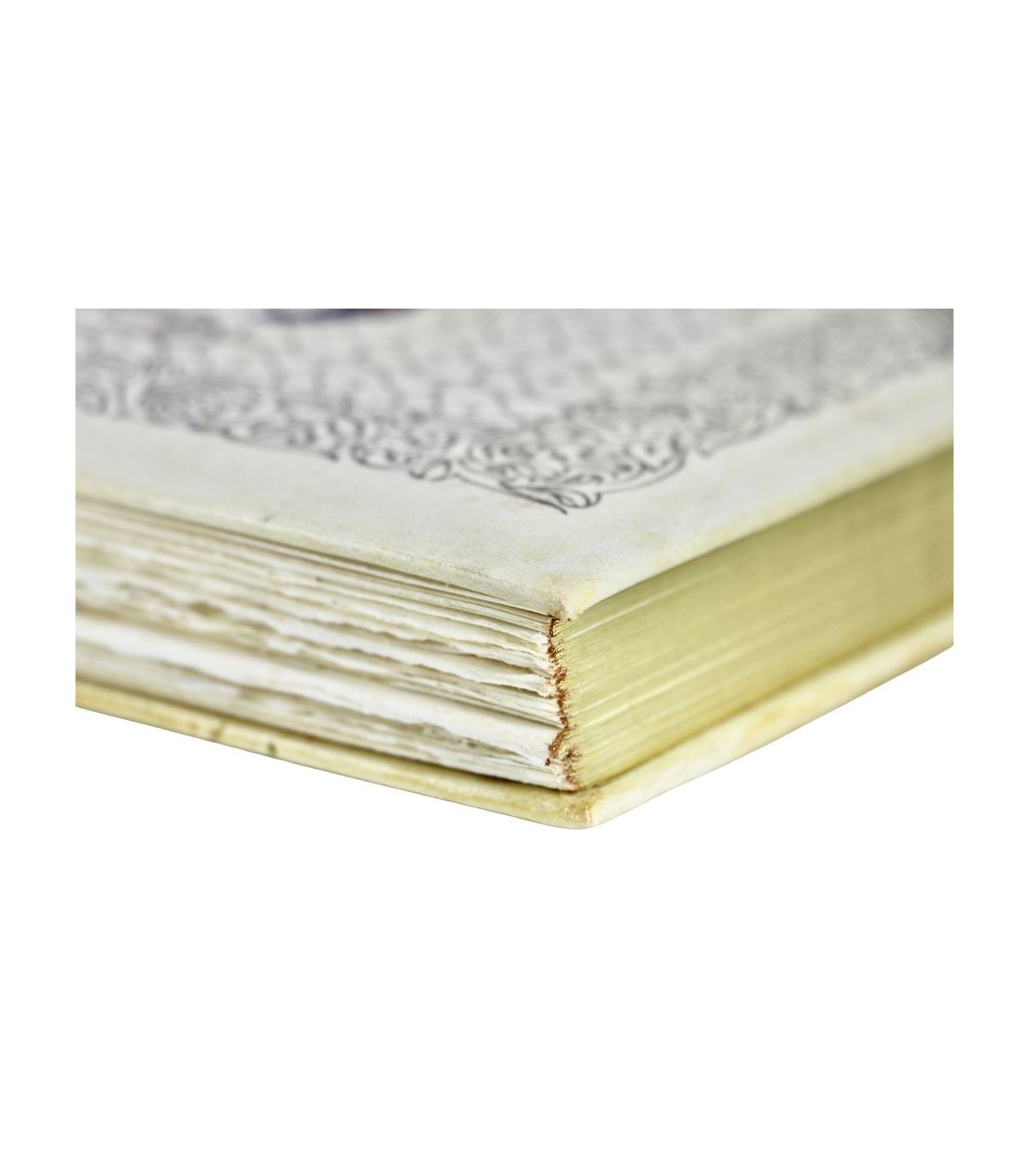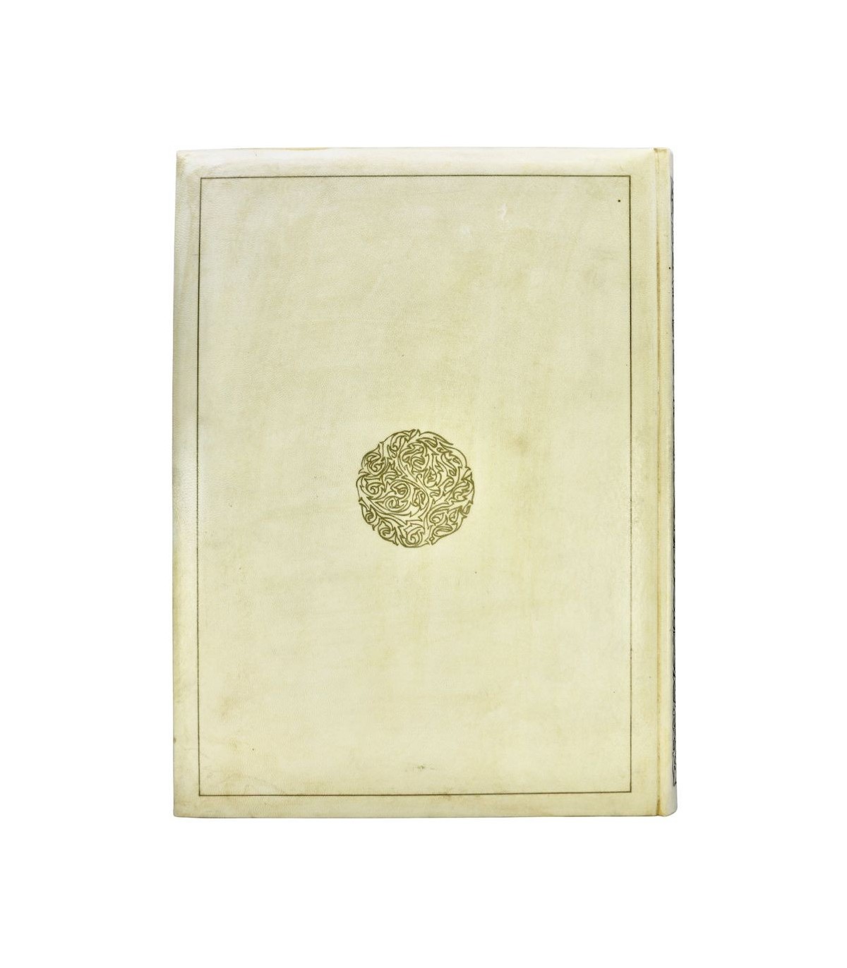 Plein vélin, dos lisse orné de motifs dorés et du titre en noir et rouge en long, premier plat décoré d’une grande composition peinte à la main sur un fond de motifs dorés, tête dorée, étui.