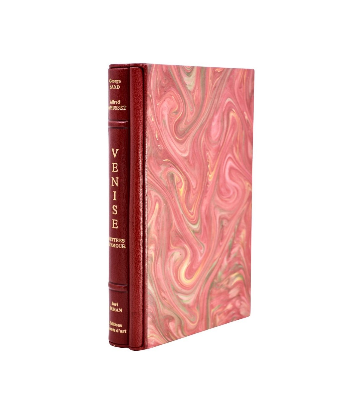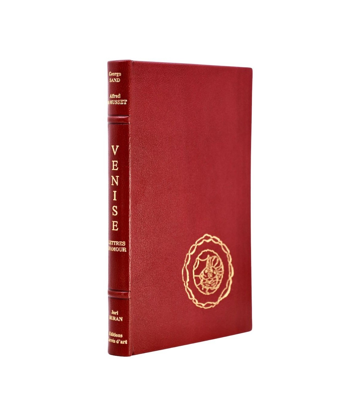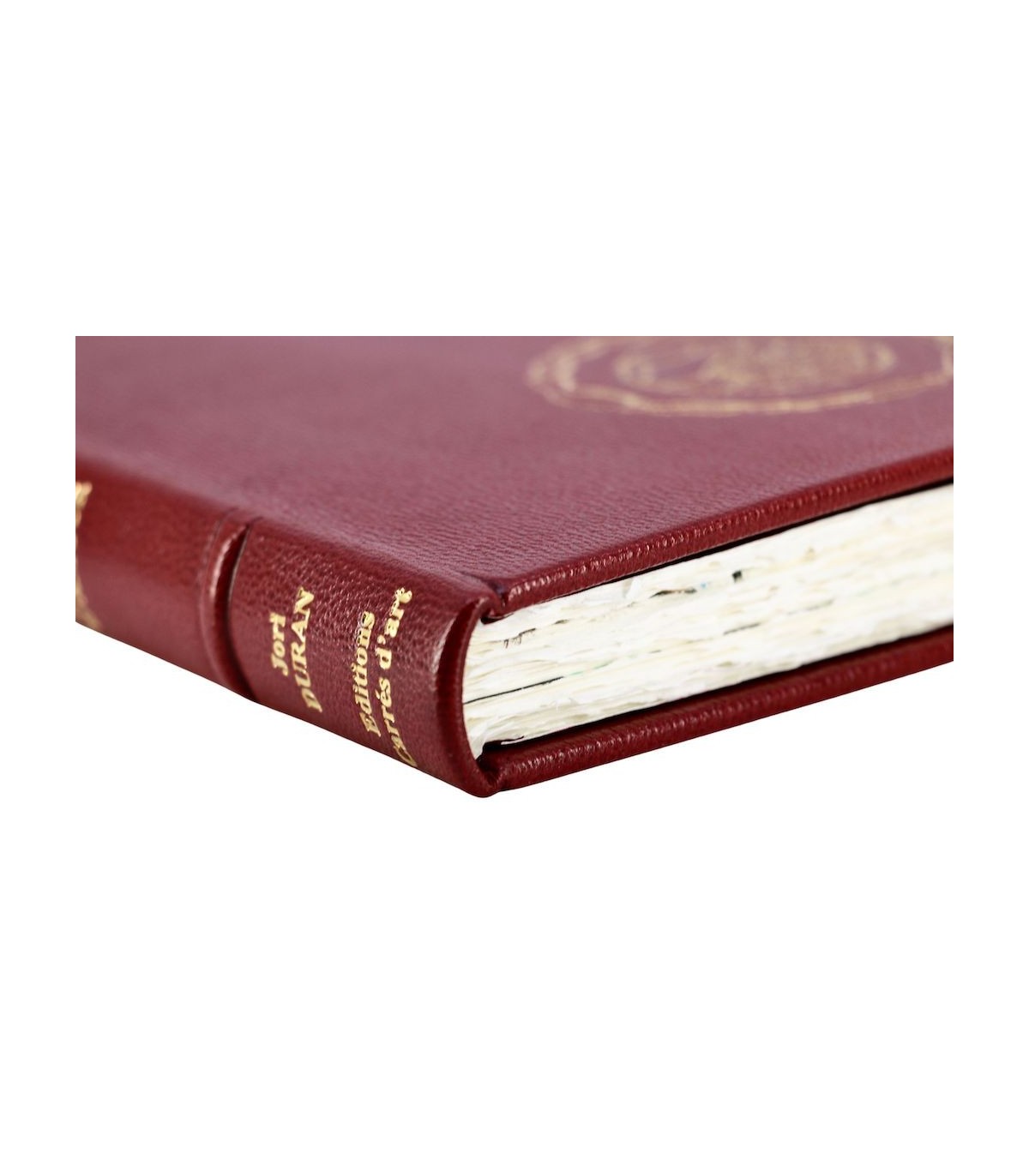 Plein chagrin bordeaux, dos à 2 nerfs titré or, premier plat orné d’une composition dorée, tête dorée, doublures et gardes de soie moirée framboise, étui bordé (reliure éditeur).