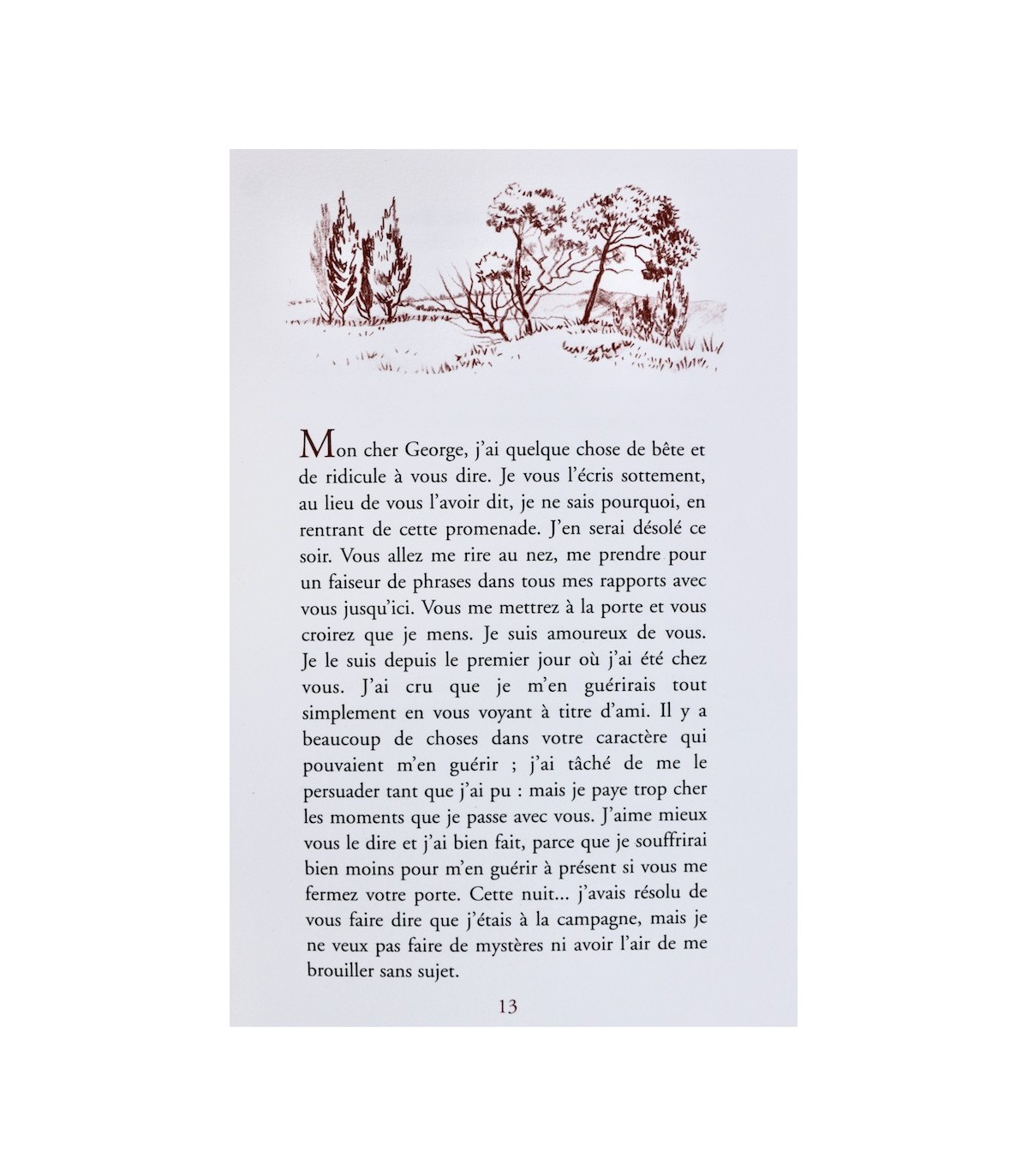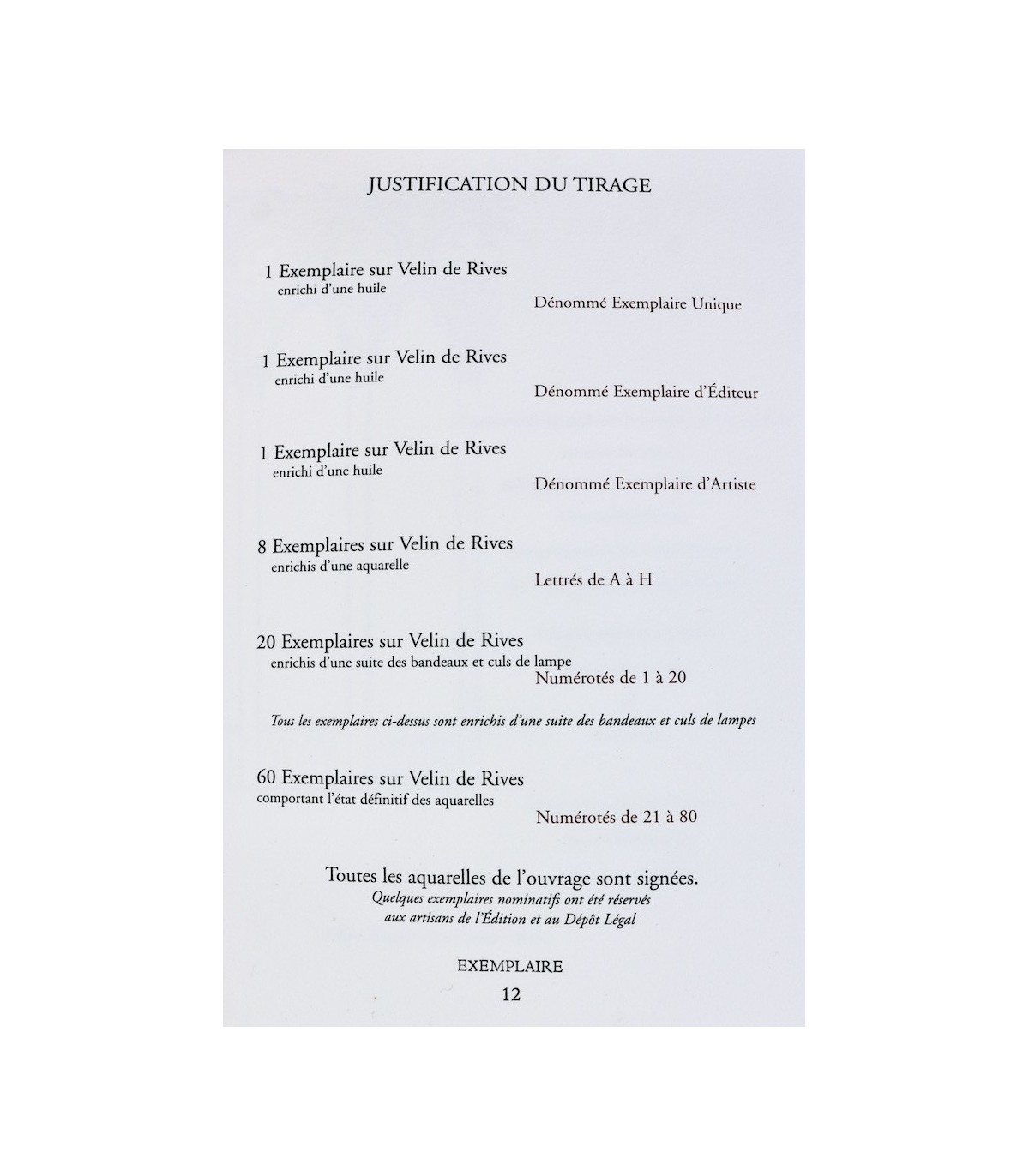 In-4 (28,5cm x 19,5cm) de 72-[7]pp. Tirage à 91 exemplaires numérotés sur vélin de Rives, dont 1 ex. unique, 1 ex. d’éditeur, 1 ex. d’artiste, 8 ex. avec une aquarelle, 20 ex. avec une suite des bandeaux et culs-de-lampe et 60 ex. avec l’état définitif des gravures.