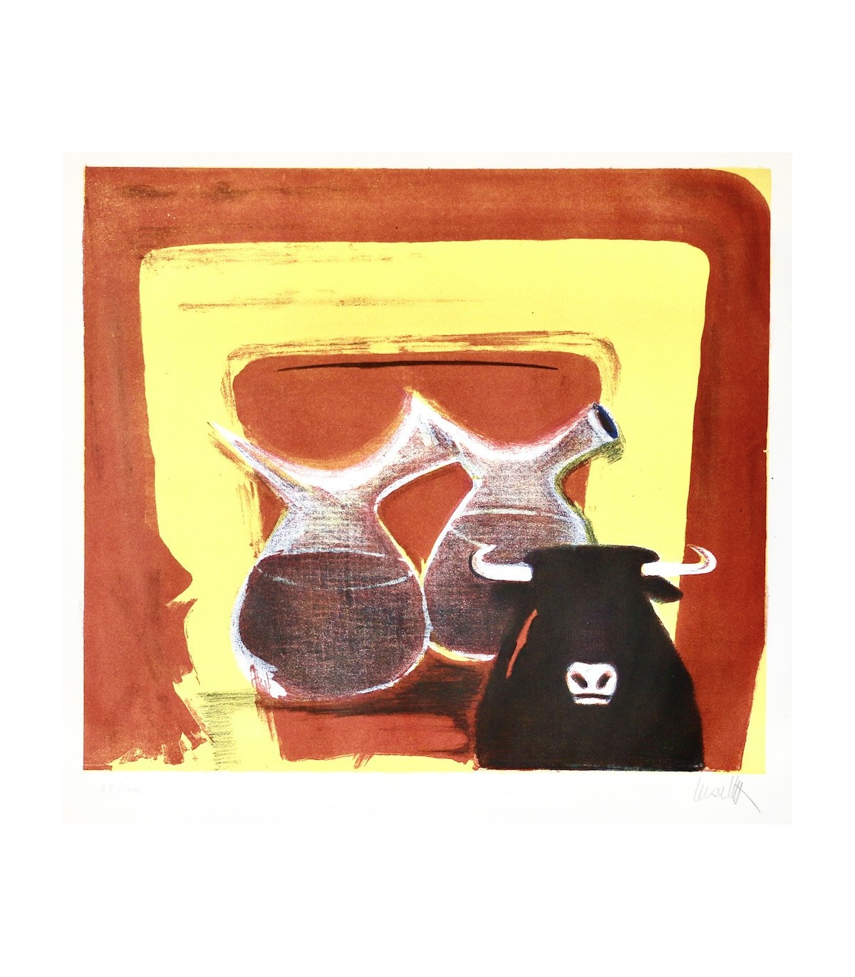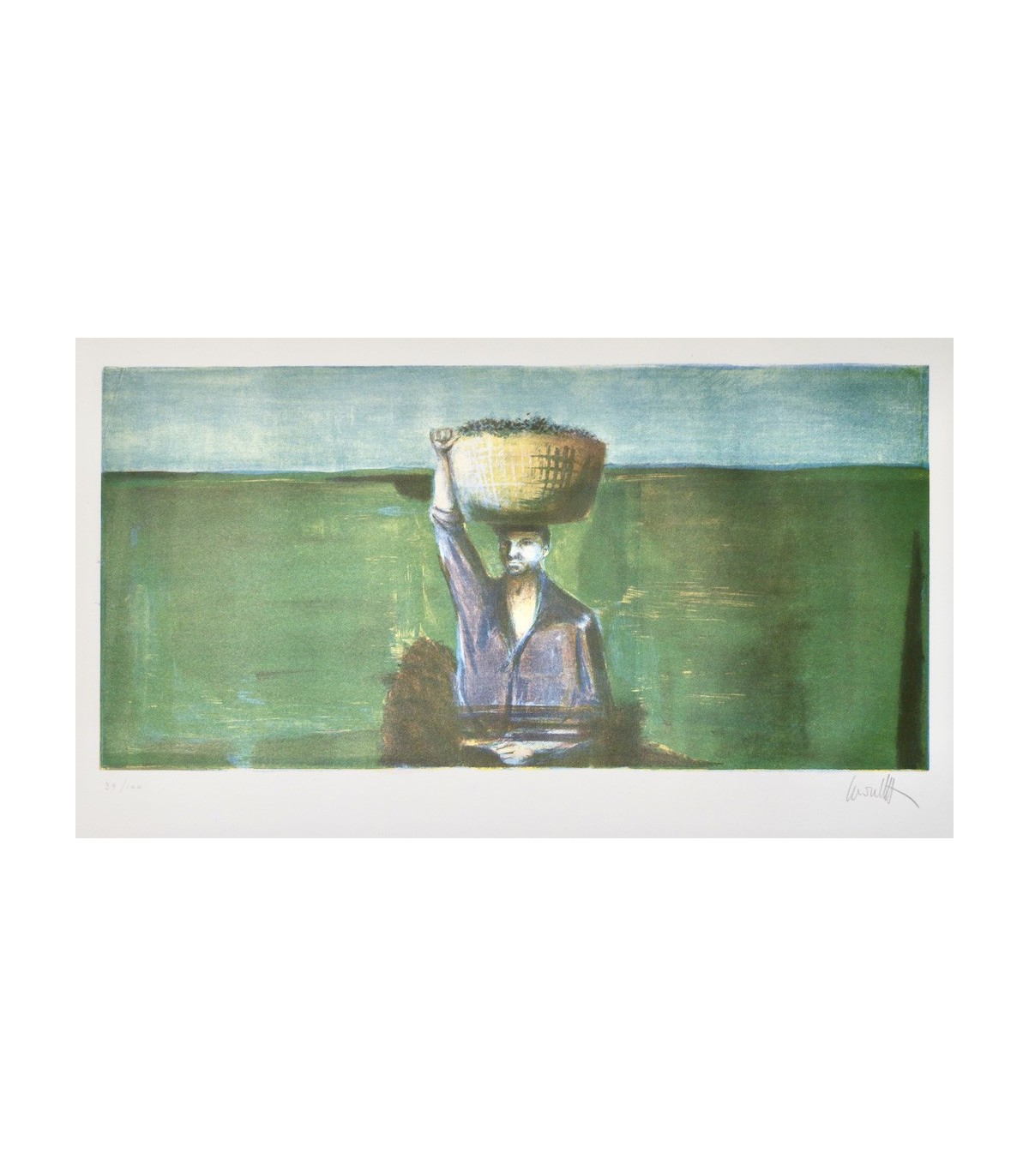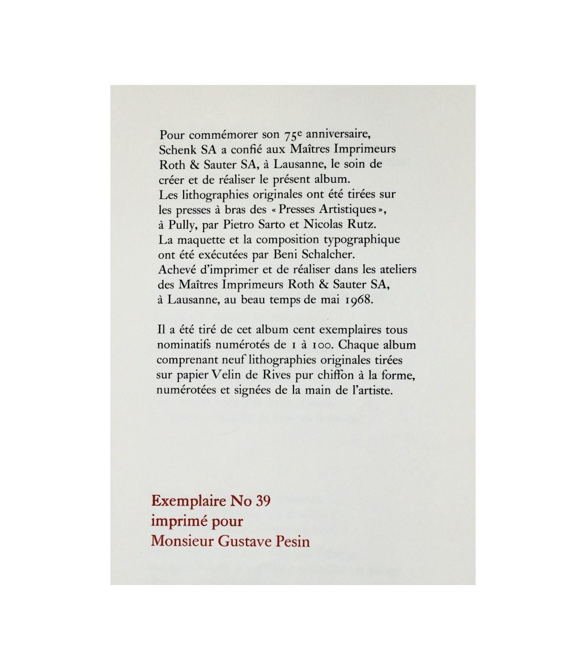 Œuvre poétique illustrée de 9 lithographies originales en couleurs numérotées et signées par 3 artistes vaudois : Jaques Berger, Jean Lecoultre et Charles Meystre, tirées sur papier vélin de Rives pur chiffon à la forme. Un des exemplaires numérotés, celui-ci n°39, imprimé pour Monsieur Gustave Pesin.