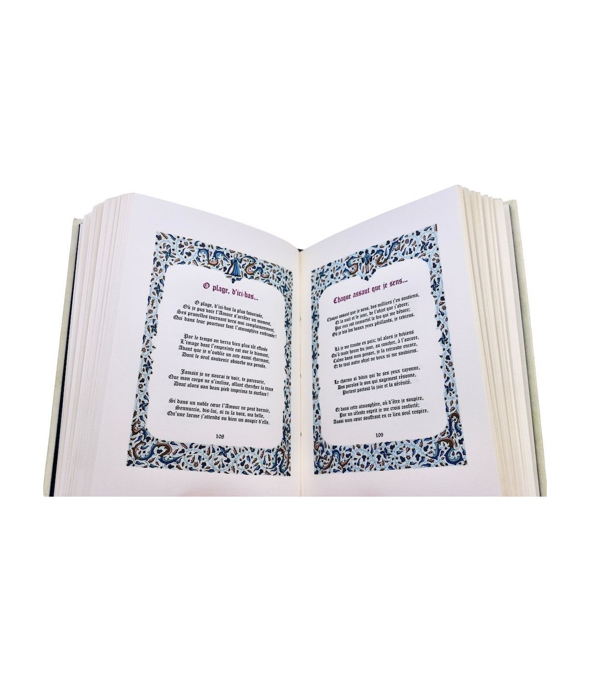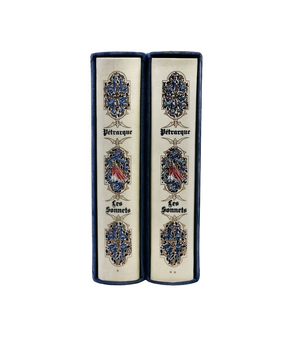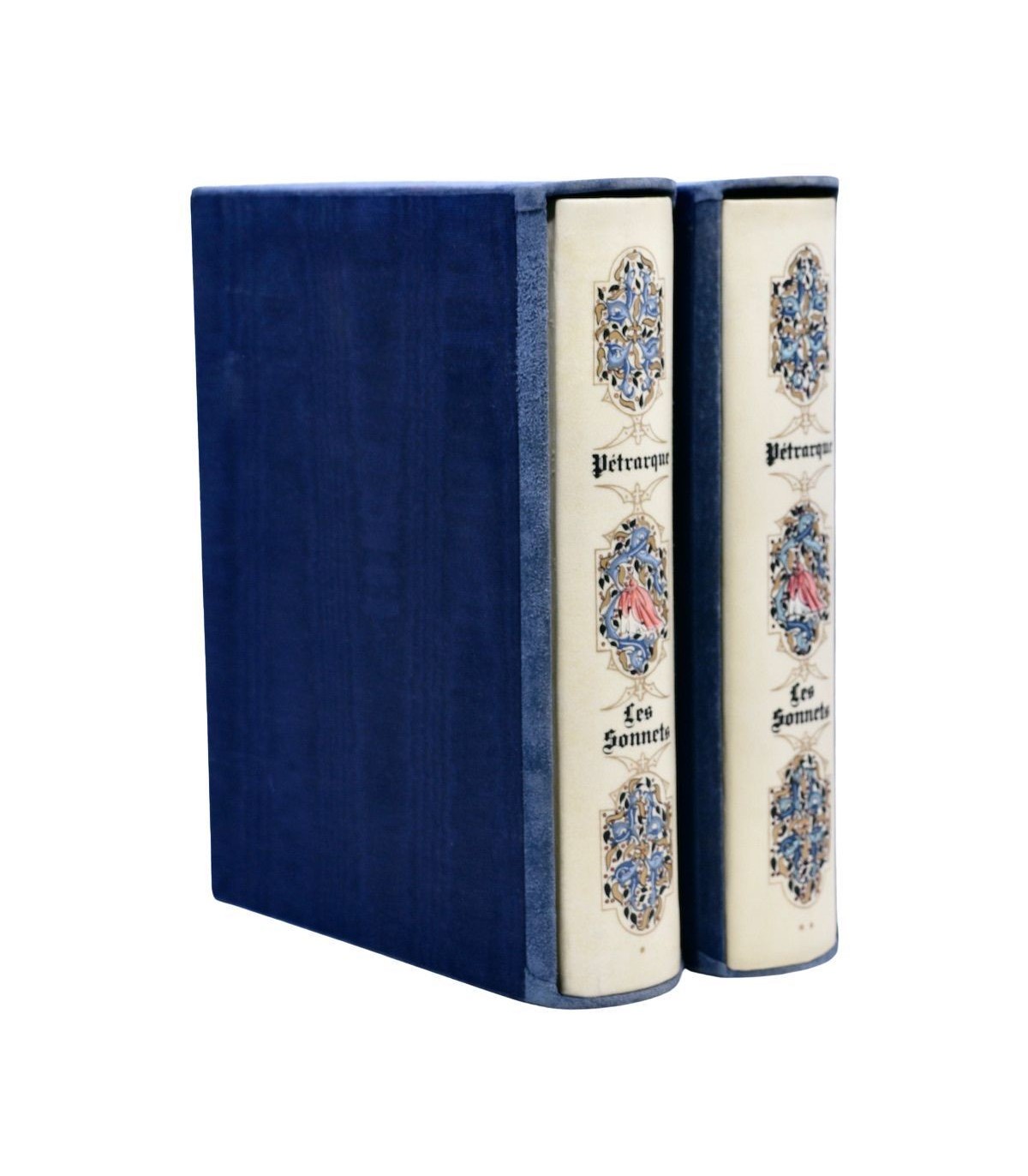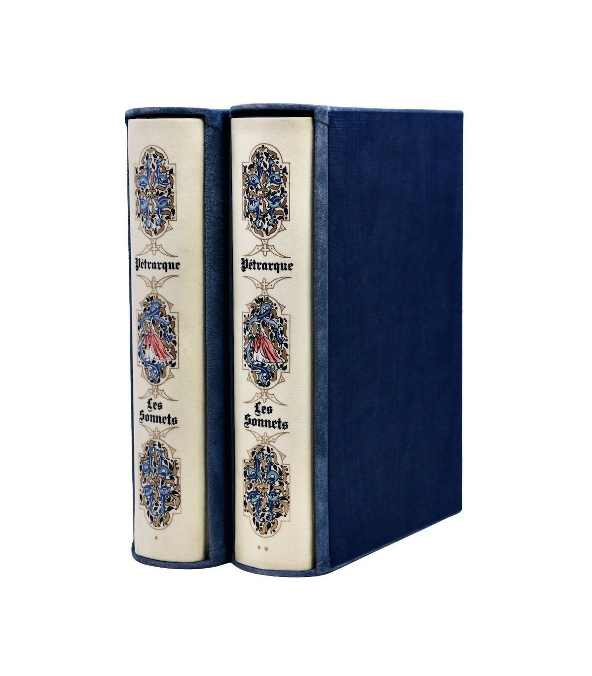 2 volumes petit in-4 (23,8cm x 18,2cm) de 186-[3]pp. & 195-[9]pp. Tirage à 1300 exemplaires numérotés sur vélin d'Arches. Plein vélin, dos et plats décorés de miniatures et ornements peints, plats biseautés, tête dorée, doublures et gardes de papier tissé bleu, étui.