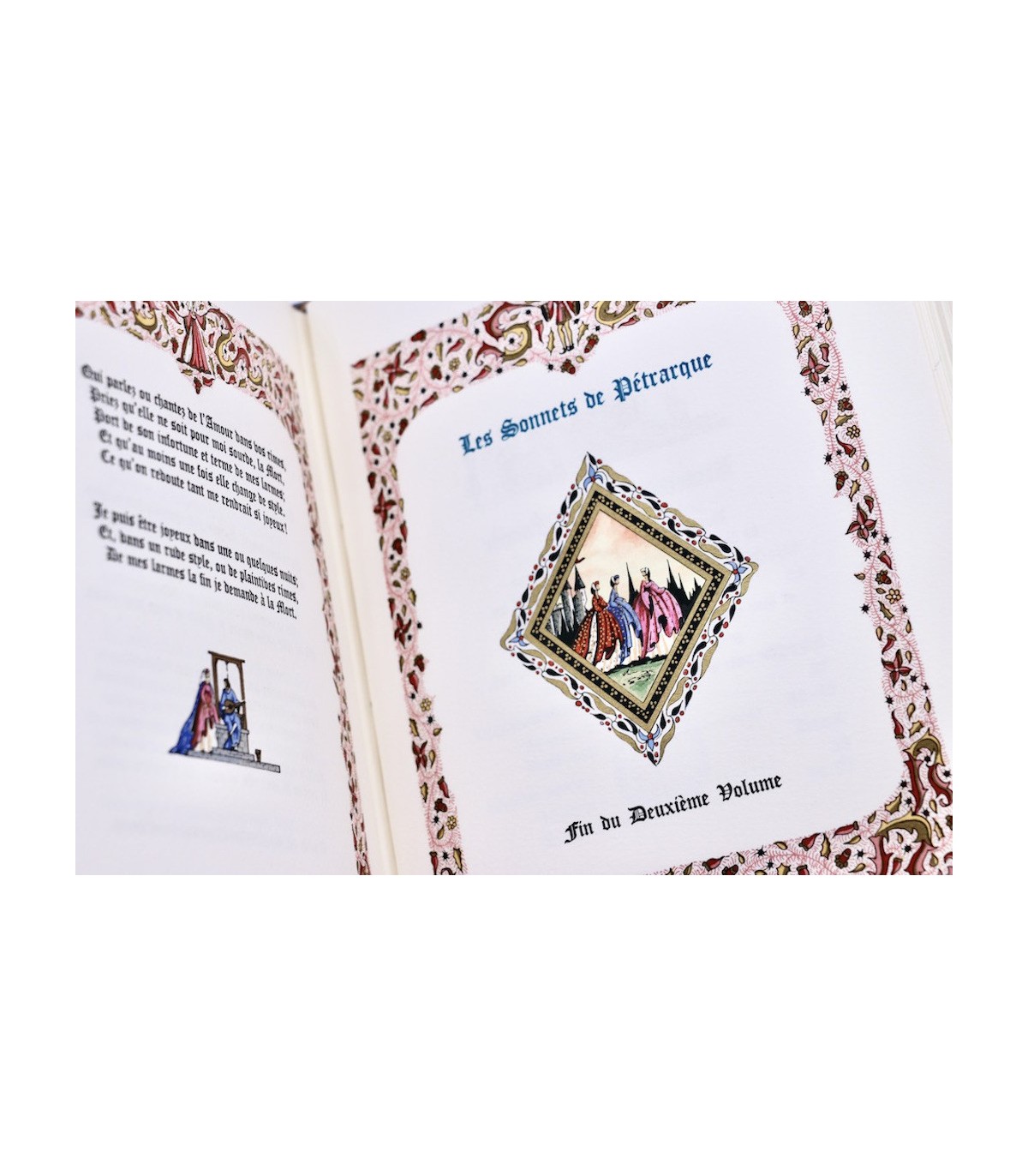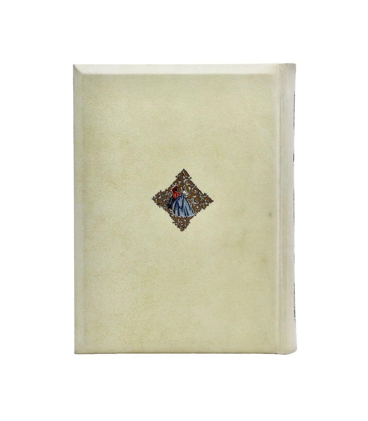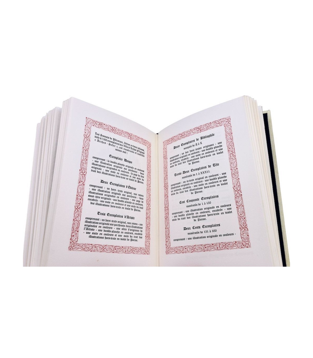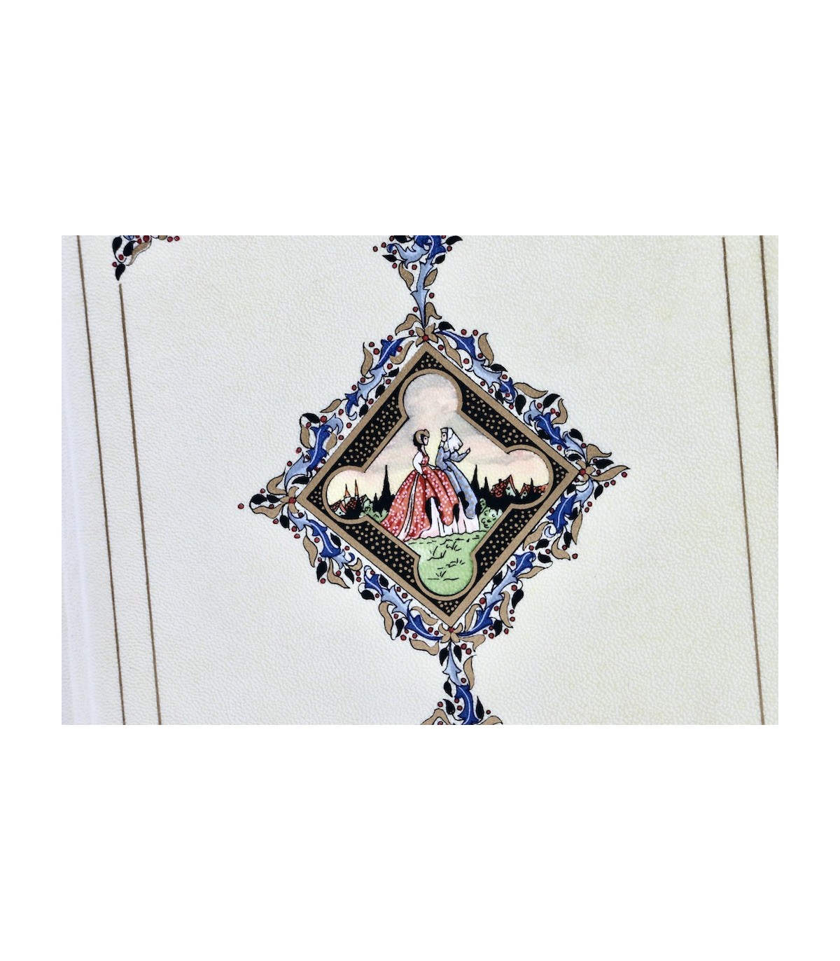 2 volumes petit in-4 (23,8cm x 18,2cm) de 186-[3]pp. & 195-[9]pp. Tirage à 1300 exemplaires numérotés sur vélin d'Arches. Plein vélin, dos et plats décorés de miniatures et ornements peints, plats biseautés, tête dorée, doublures et gardes de papier tissé bleu, étui.