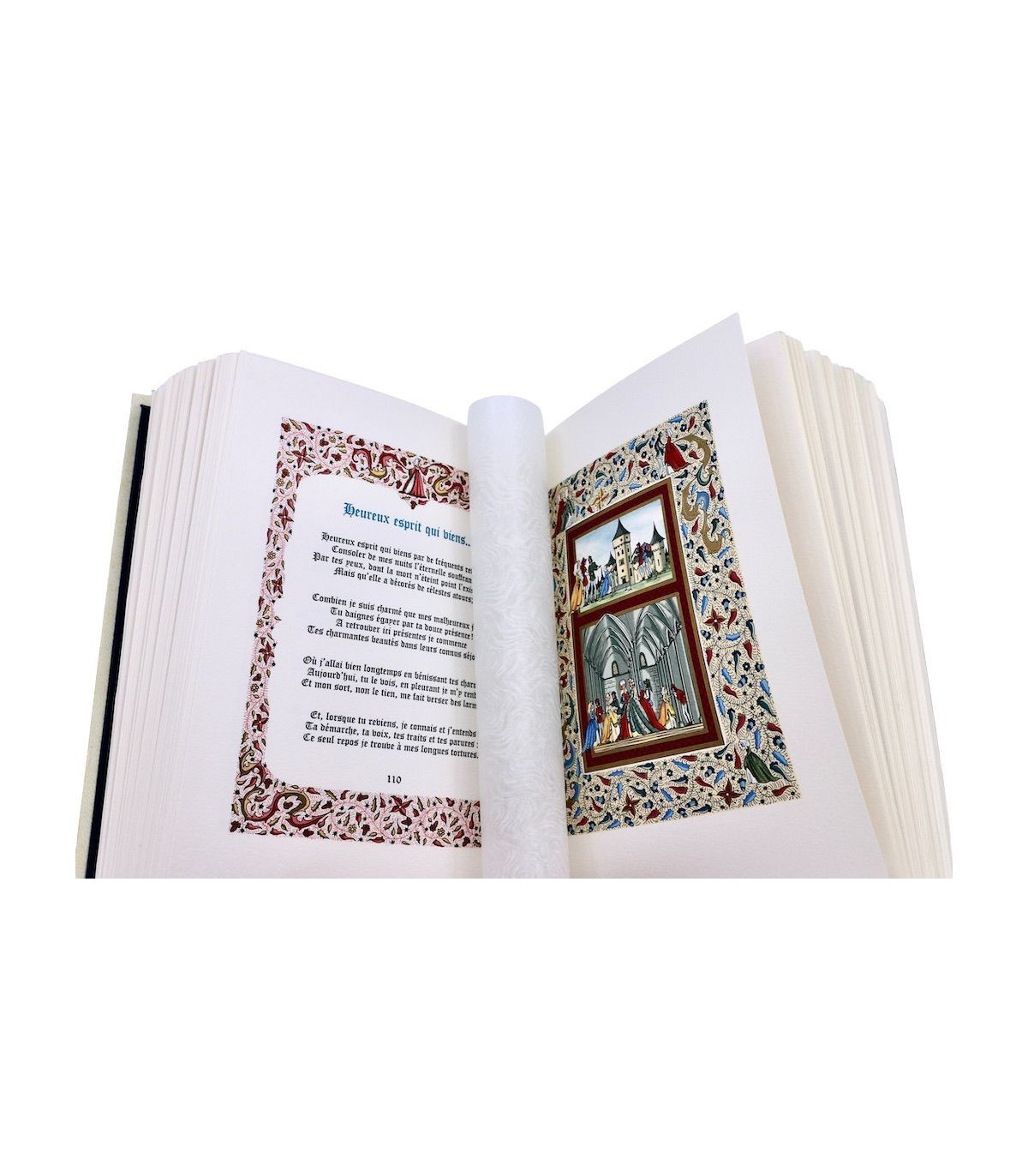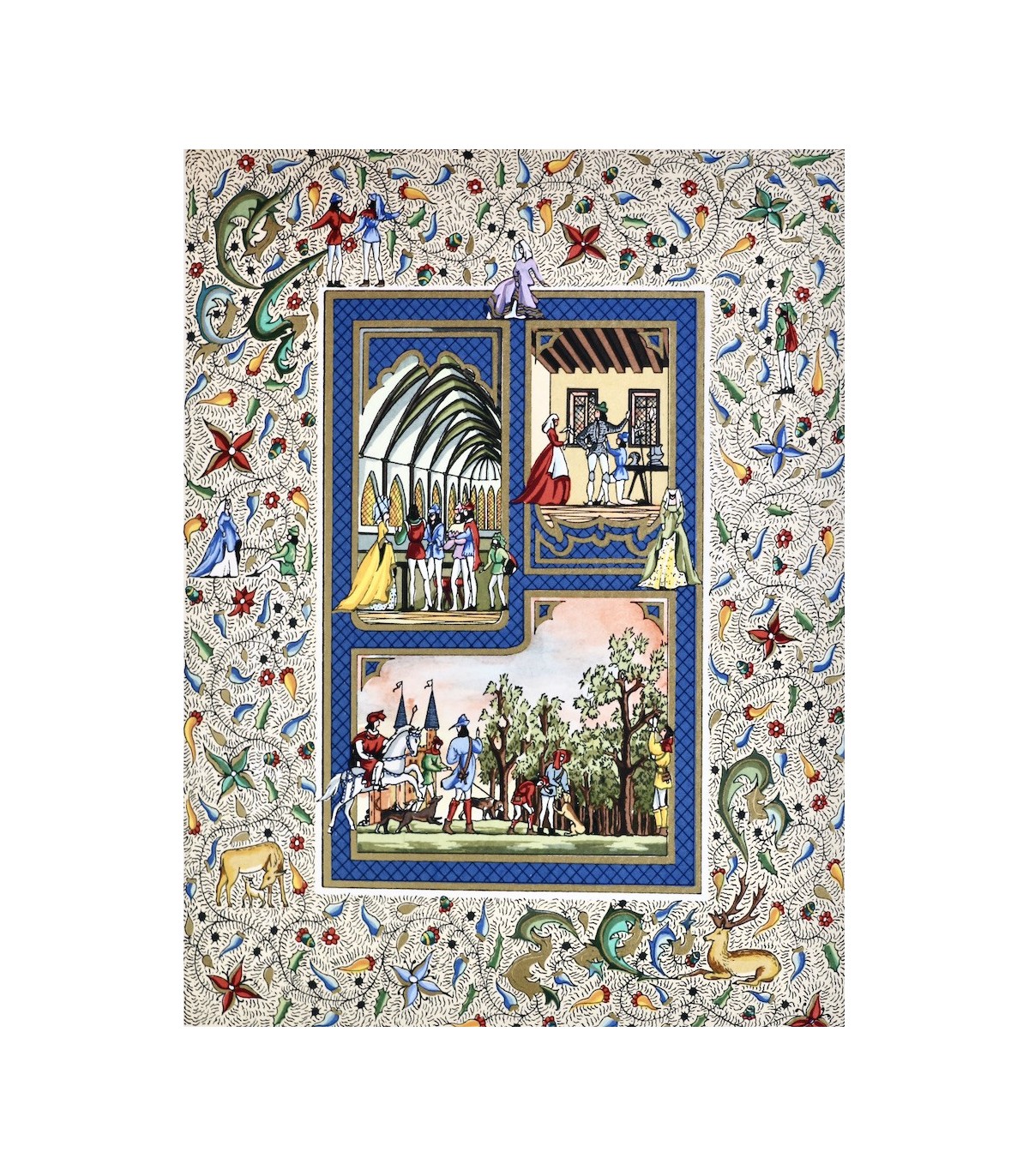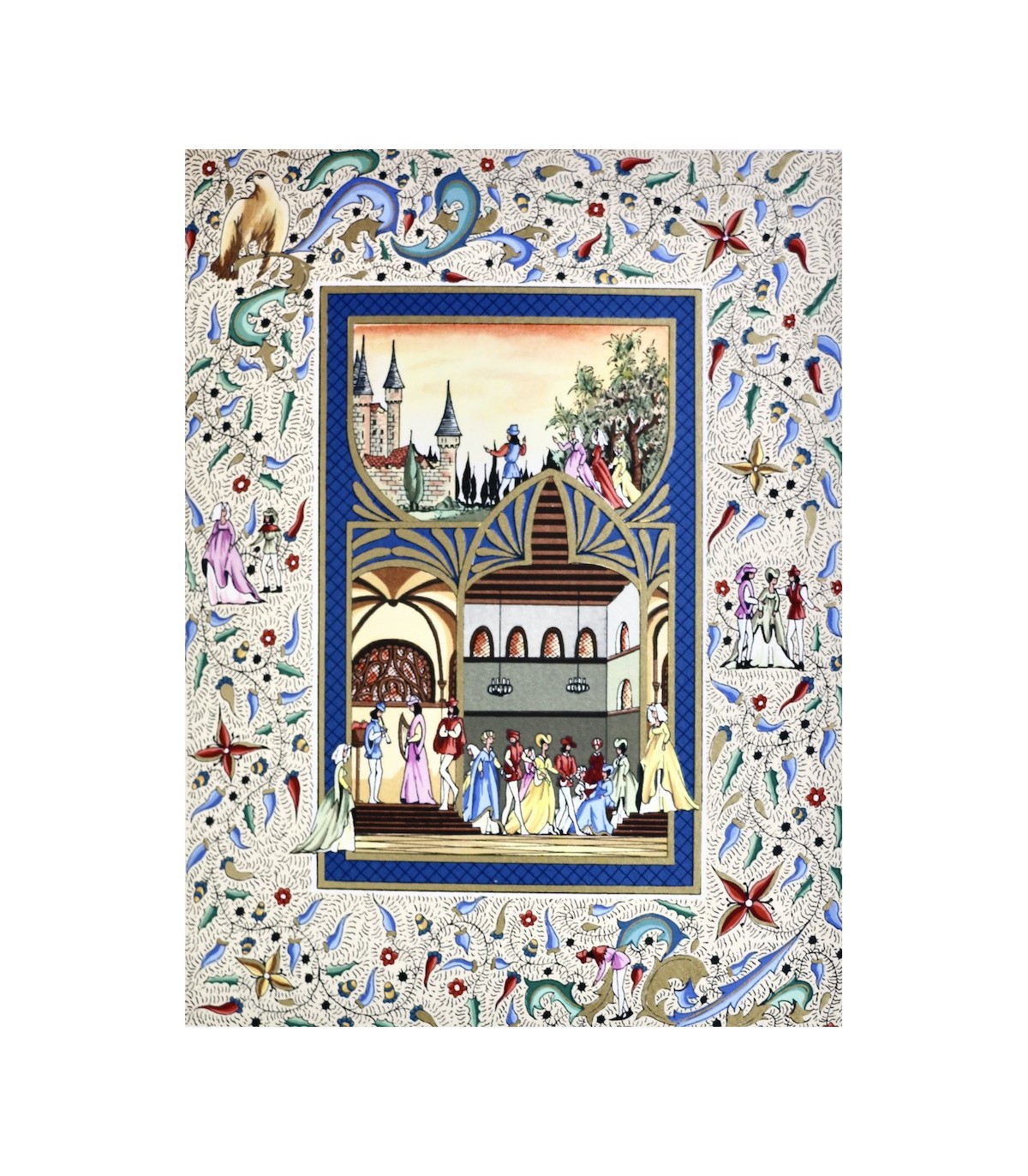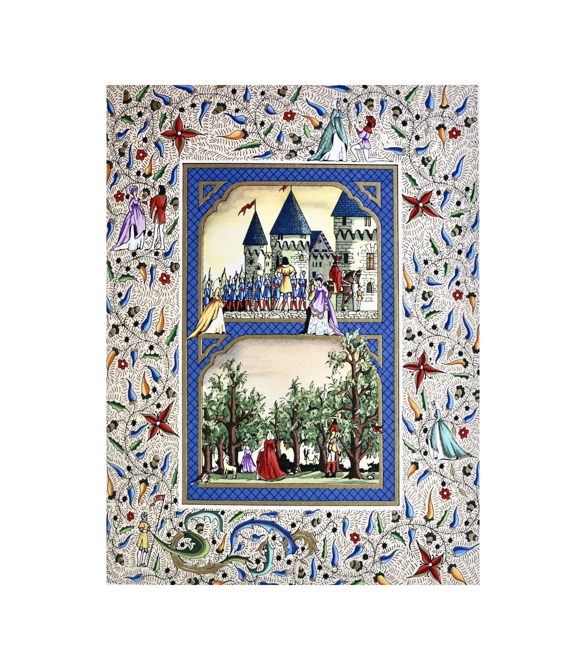 2 volumes petit in-4 (23,8cm x 18,2cm) de 186-[3]pp. & 195-[9]pp. Tirage à 1300 exemplaires numérotés sur vélin d'Arches. Plein vélin, dos et plats décorés de miniatures et ornements peints, plats biseautés, tête dorée, doublures et gardes de papier tissé bleu, étui.