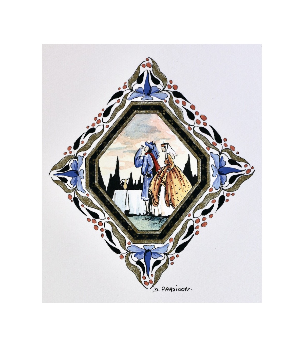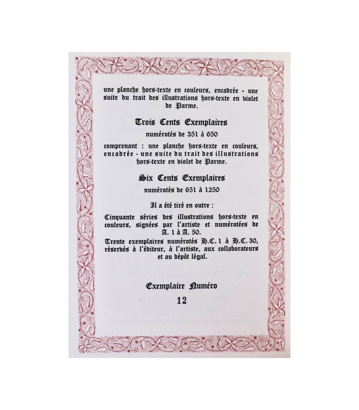 Ouvrage illustré de miniatures de Dominique Pardigon reproduites au pochoir, dont une double planche, 12 hors-texte et 8 chapitres ornés.