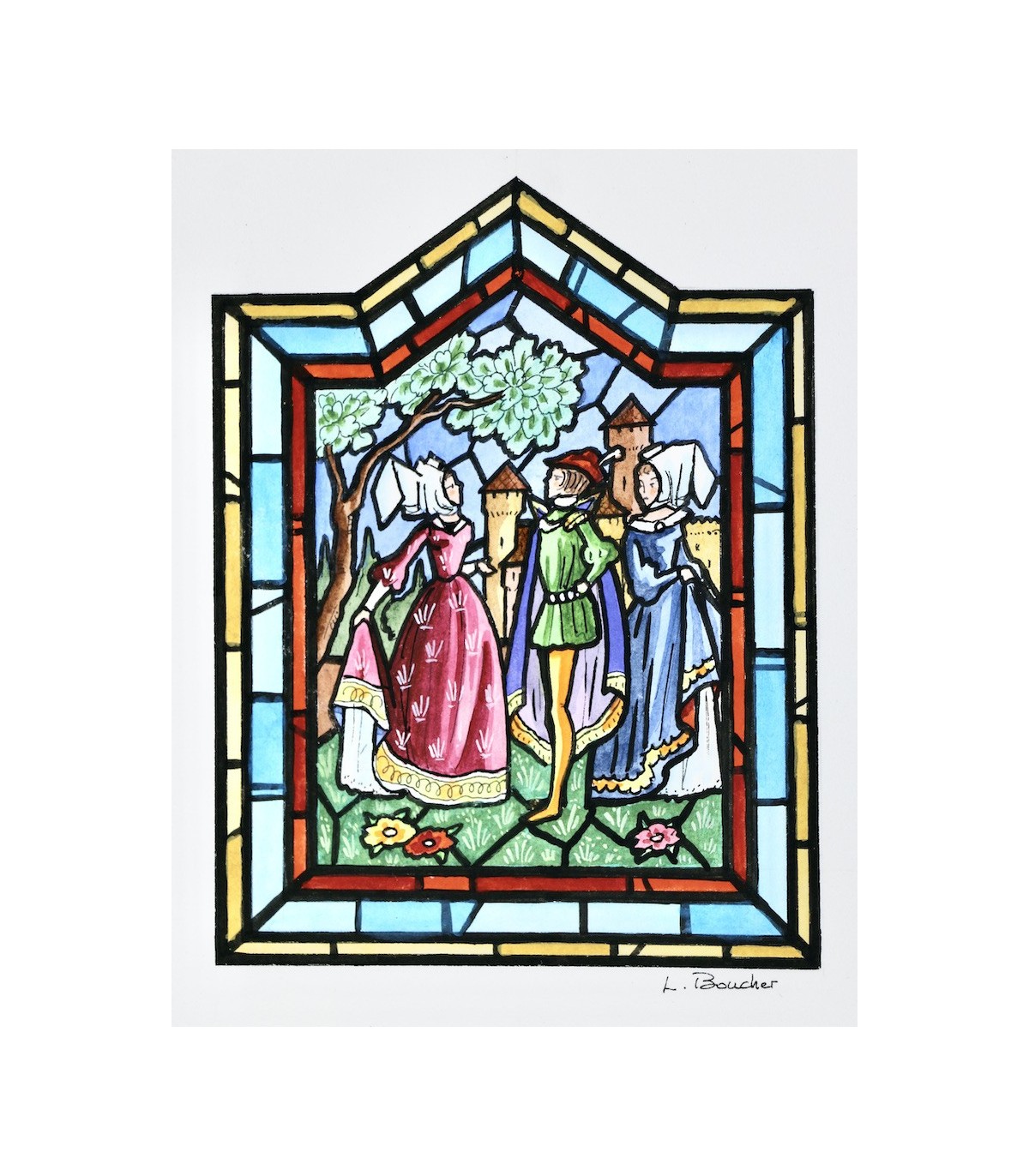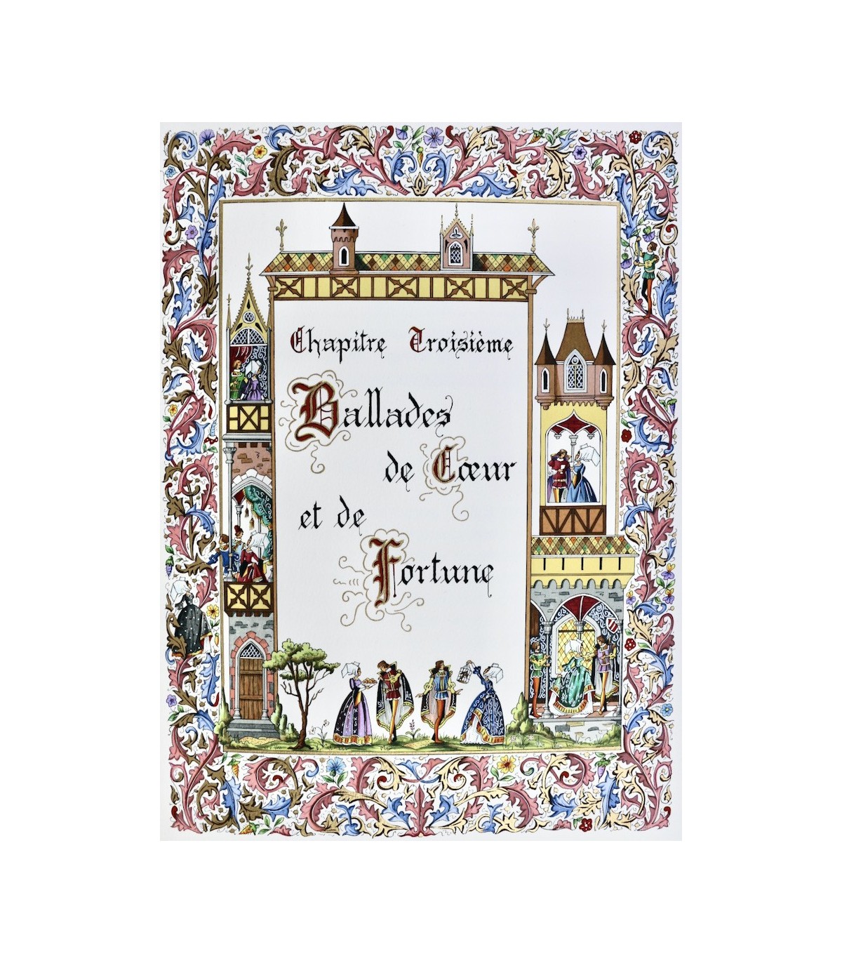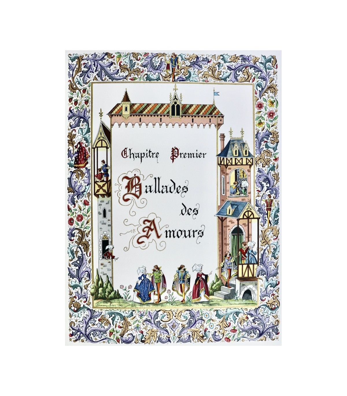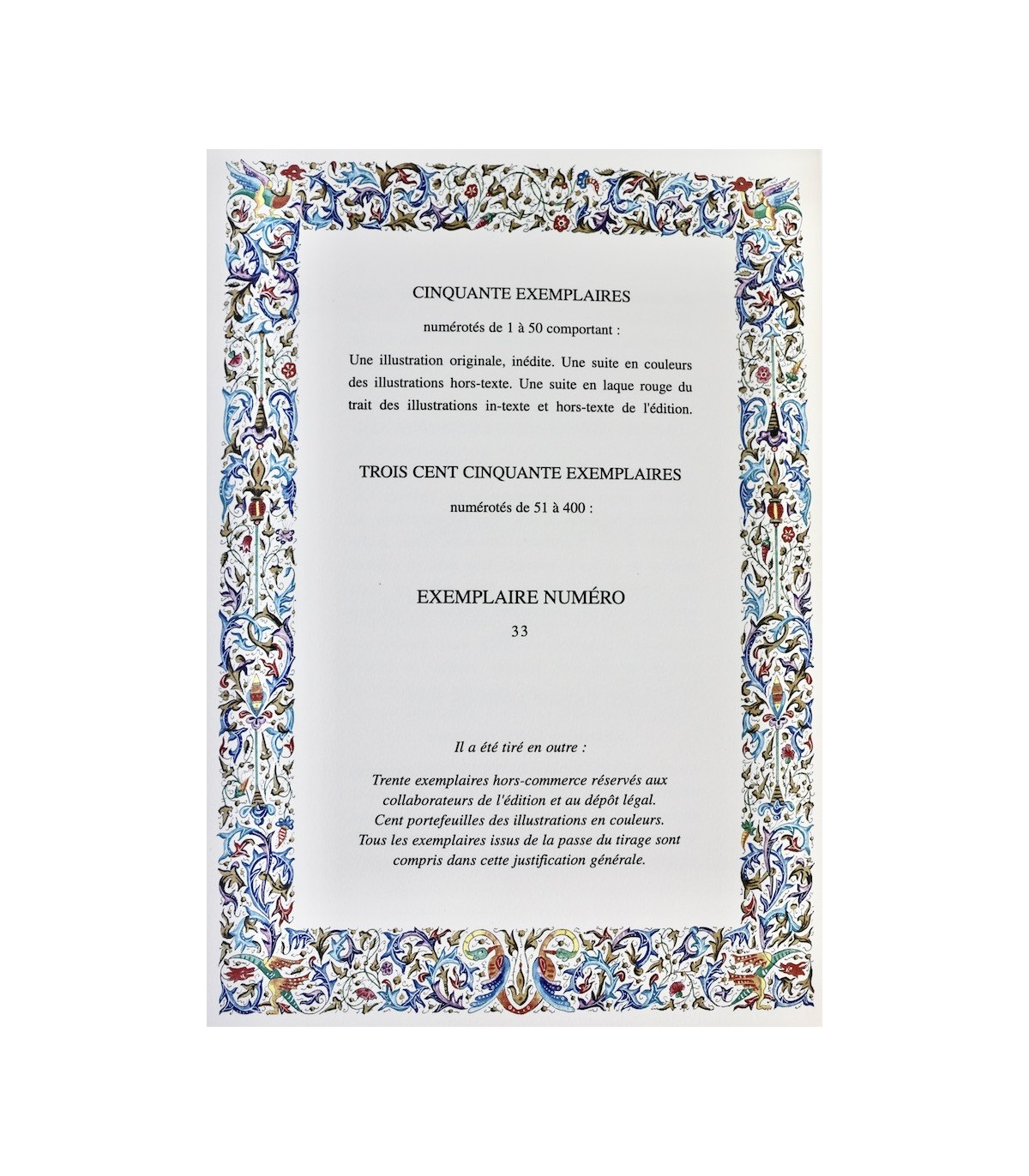 Ouvrage illustré par Lucy Boucher de compositions reproduites en couleurs au pochoir et en sérigraphie. Le texte est imprimé dans un encadrement d'enluminures. Un des 50 exemplaires numérotés comportant une illustration originale inédite signée, une suite en couleurs des hors-texte et une suite en laque rouge du trait des in-texte et hors-texte, celui-ci n°33, bien complet de son certificat d'authenticité.