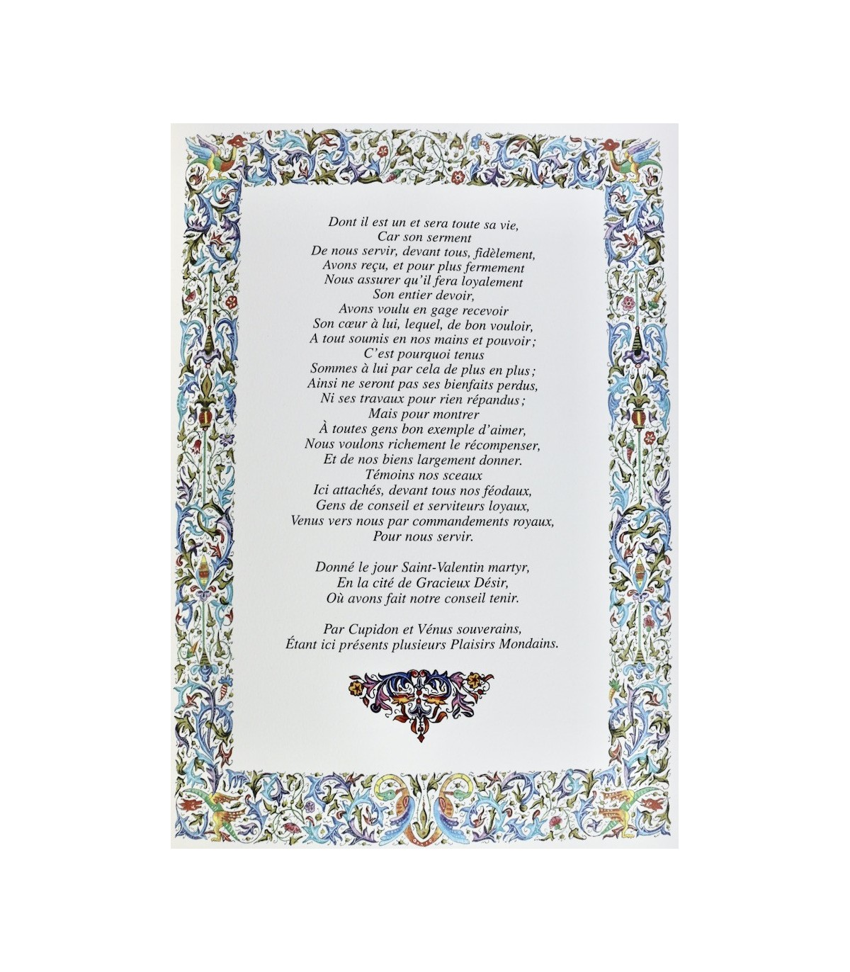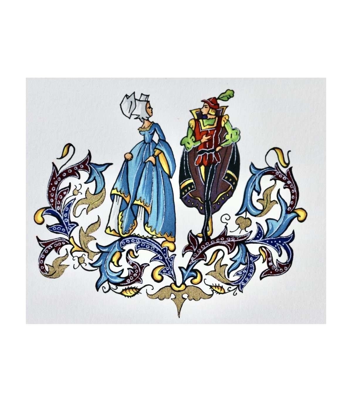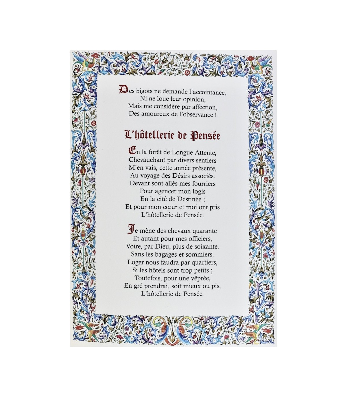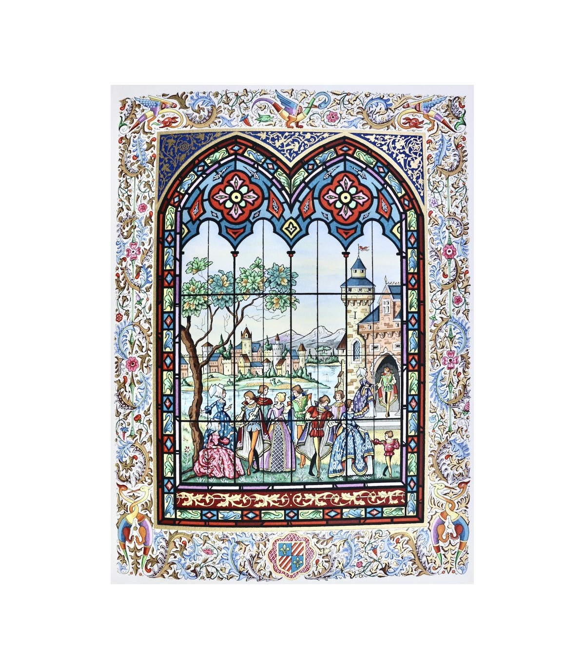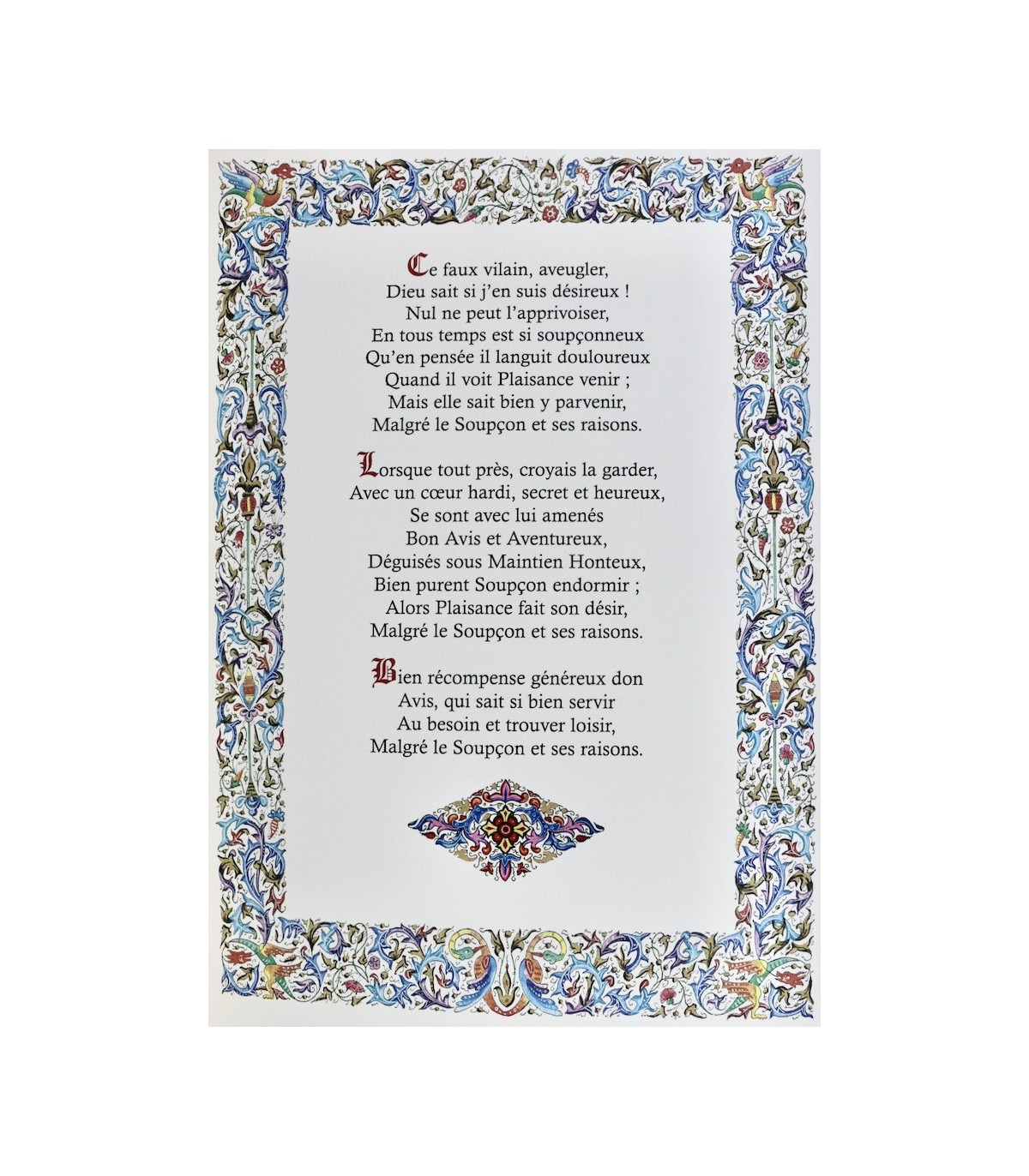 Ouvrage illustré par Lucy Boucher de compositions reproduites en couleurs au pochoir et en sérigraphie. Le texte est imprimé dans un encadrement d'enluminures. Un des 50 exemplaires numérotés comportant une illustration originale inédite signée, une suite en couleurs des hors-texte et une suite en laque rouge du trait des in-texte et hors-texte, celui-ci n°33, bien complet de son certificat d'authenticité.