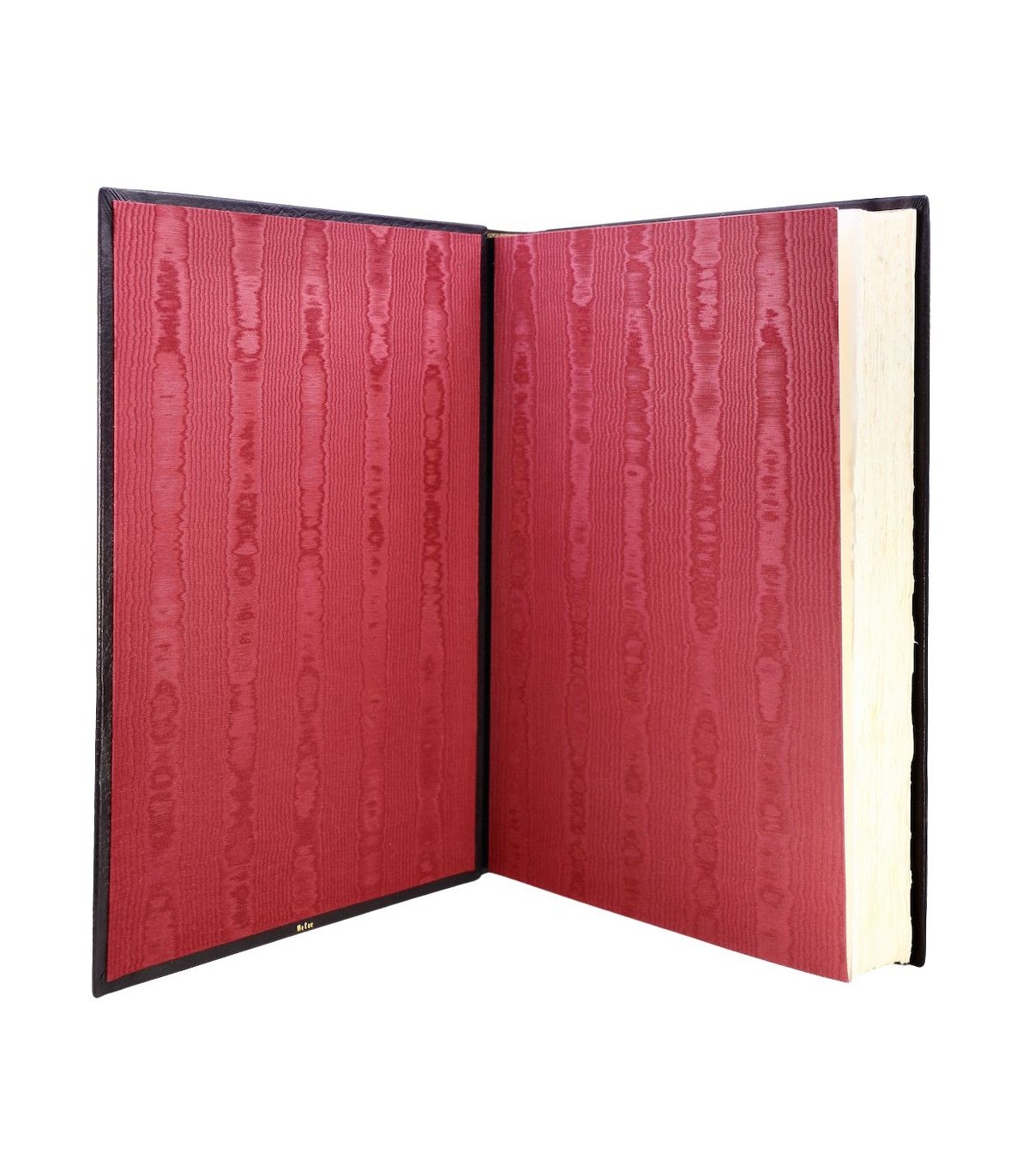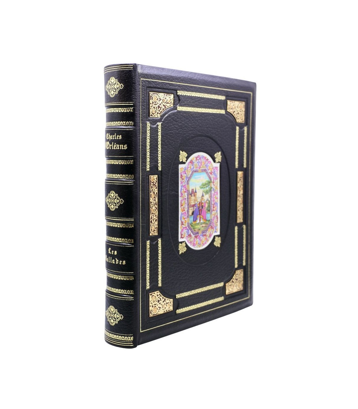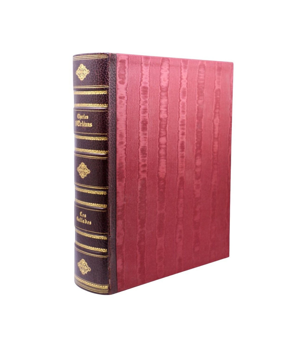 Plein cuir maroquiné violine, dos à nerfs orné de roulettes, filets et pointillés dorés, de 3 fers dorés, auteur et titre frappés or, premier plat encadré d’un filet doré et décoré de roulettes dorées, de plaques émaillées, d'un médaillon central polychrome par Lucy Boucher avec 4 petits fers dorés aux angles, tête dorée, doublures et gardes de tissu moiré lie-de-vin, emboitage de tissu moiré lie-de-vin avec un dos à nerfs en cuir violine (reliure éditeur).