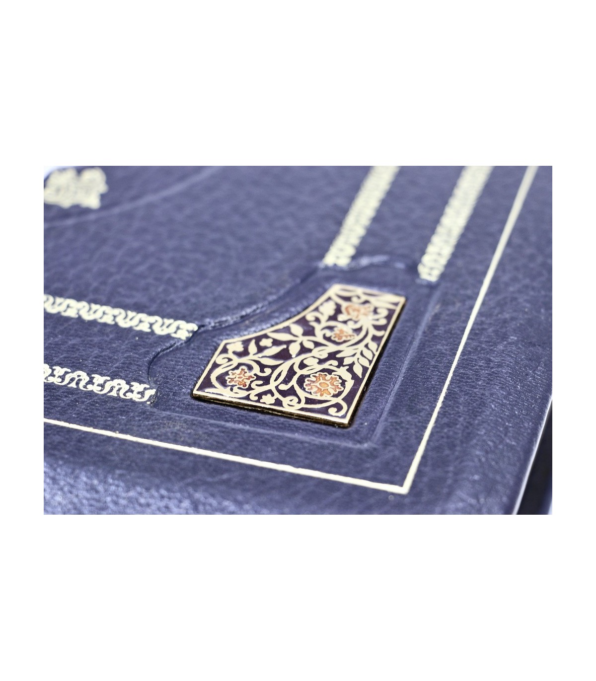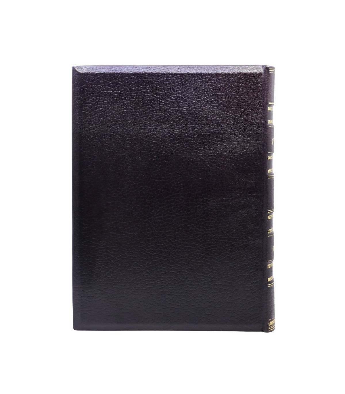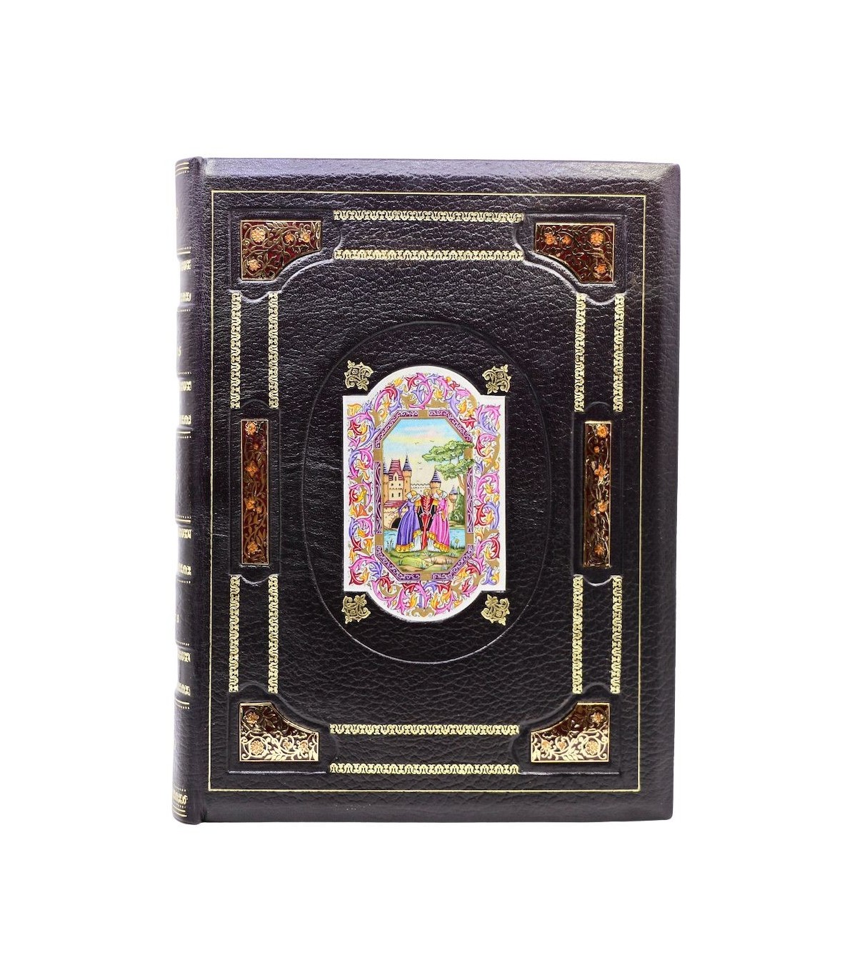 Plein cuir maroquiné violine, dos à nerfs orné de roulettes, filets et pointillés dorés, de 3 fers dorés, auteur et titre frappés or, premier plat encadré d’un filet doré et décoré de roulettes dorées, de plaques émaillées, d'un médaillon central polychrome par Lucy Boucher avec 4 petits fers dorés aux angles, tête dorée, doublures et gardes de tissu moiré lie-de-vin, emboitage de tissu moiré lie-de-vin avec un dos à nerfs en cuir violine (reliure éditeur).