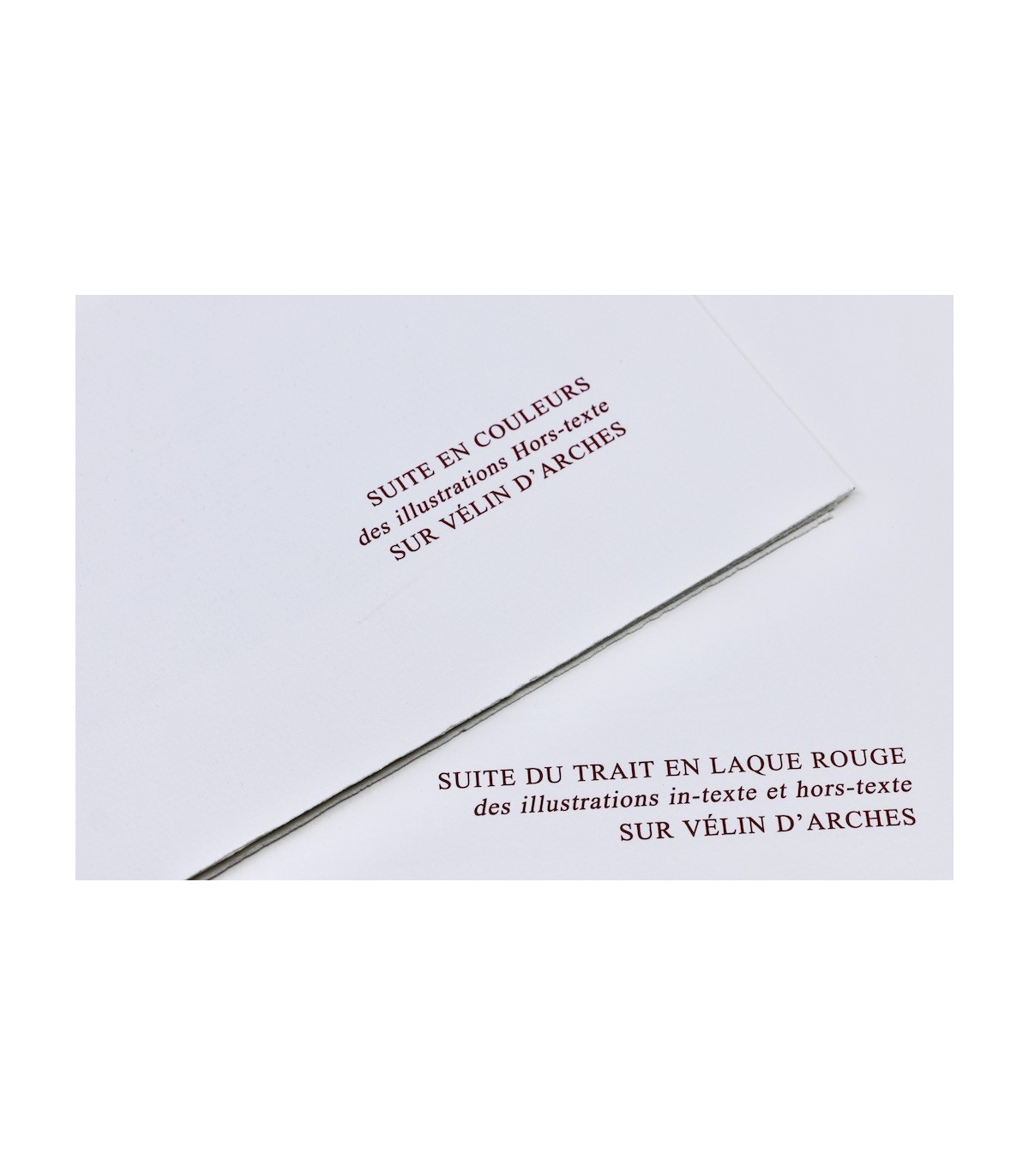 In-folio (38,4cm x 29,5cm) de 168-[10]-pp. Tirage à 415 exemplaires numérotés sur vélin d’Arches, dont 1 ex. unique, 1 ex d’éditeur, 1 ex. d’artiste, 4 ex. de bibliophile, 8 ex. de tête, 50 ex. avec un original et 2 suites et 350 ex. non enrichis.