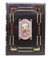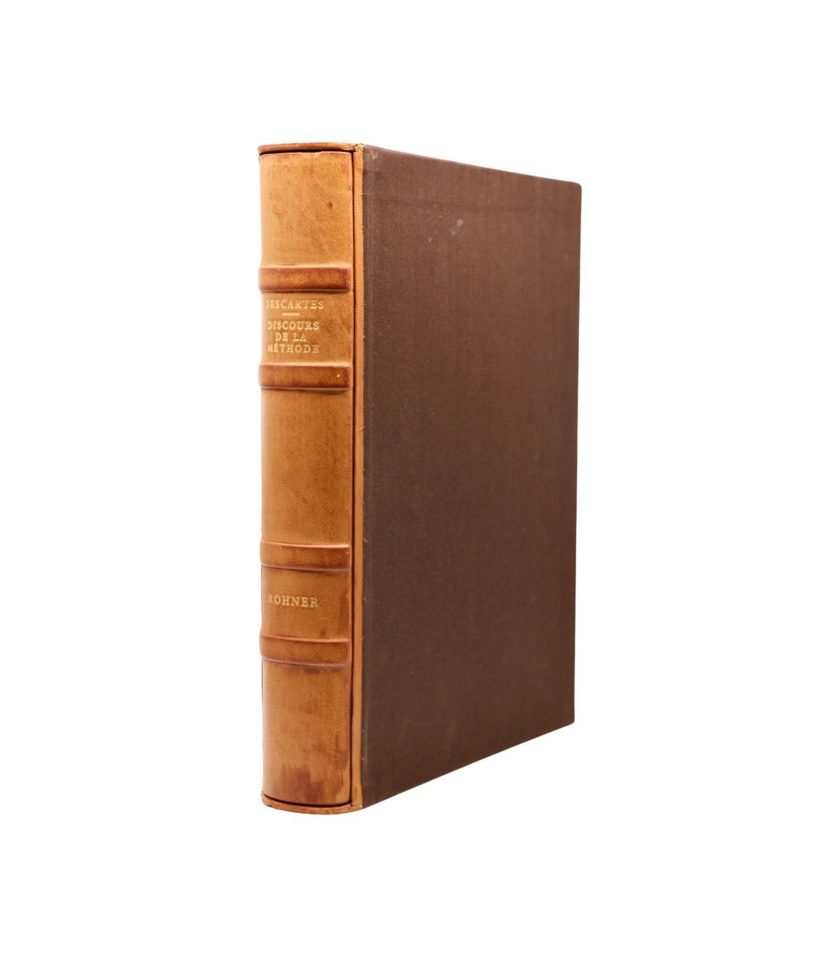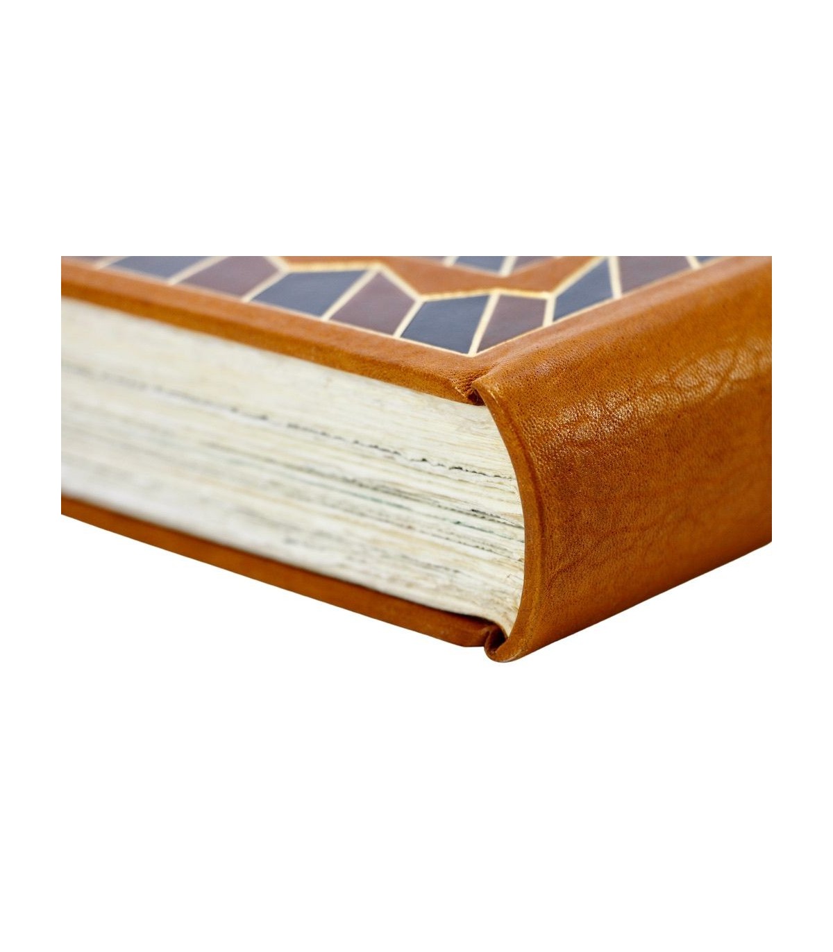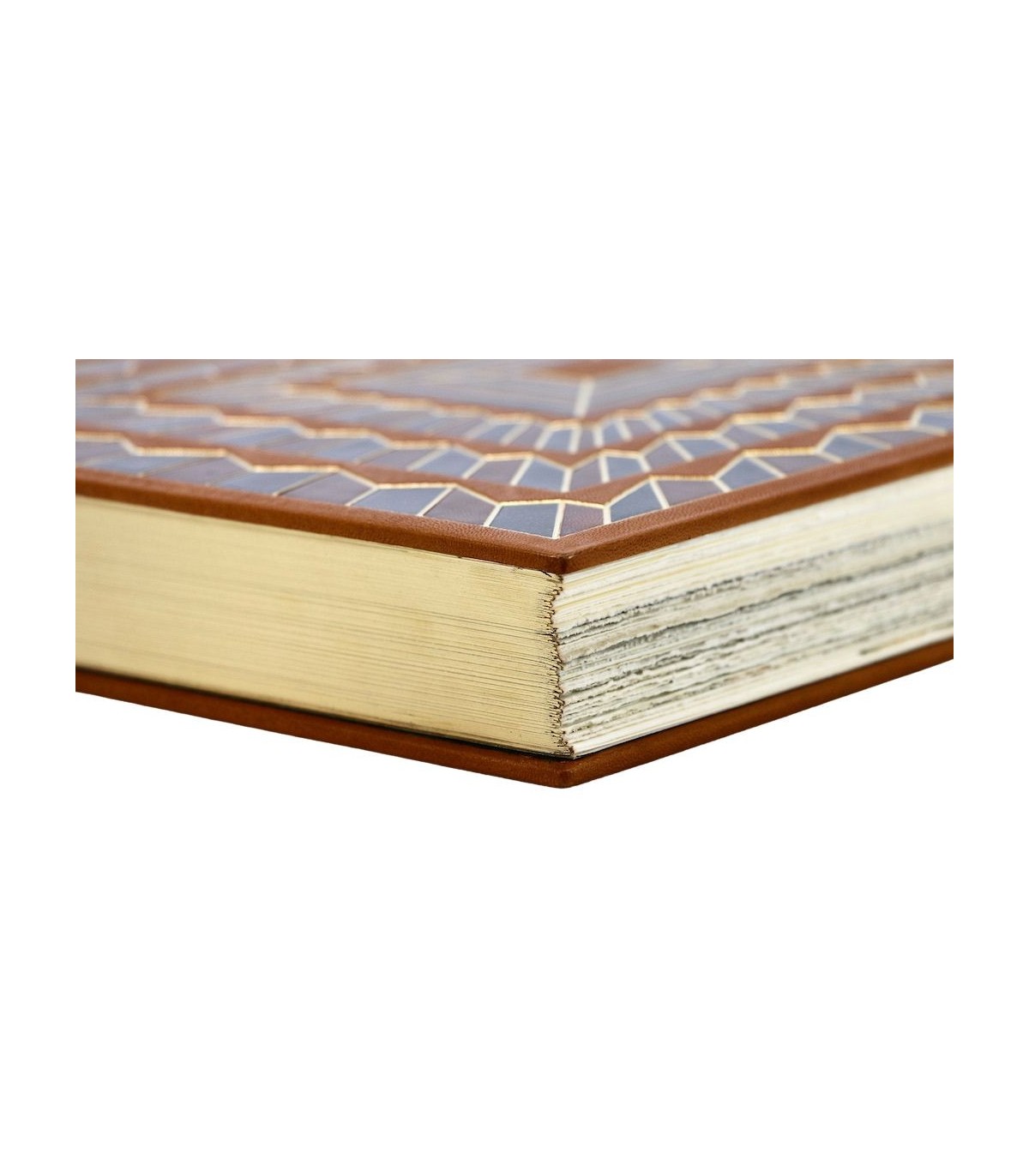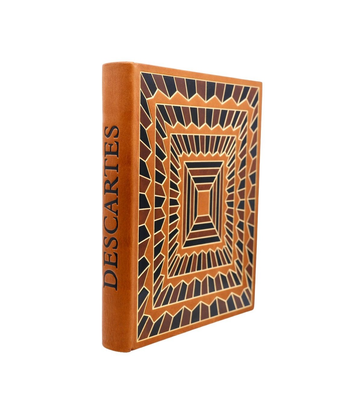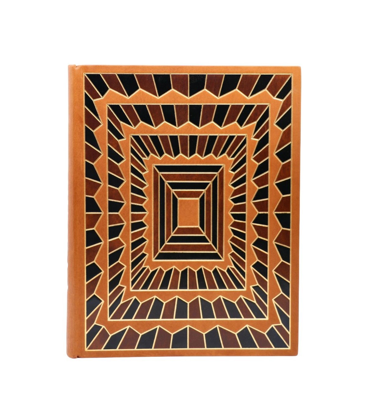 Plein cuir havane, dos lisse orné de l’auteur en lettres noires, plats décorés d'une composition géométrique mosaïquée de box marron et noir rehaussée de filets dorés, doublures et gardes de papier tissé marron, tête dorée, sous chemise demi-cuir havane à rabats et étui bordé (reliure éditeur).