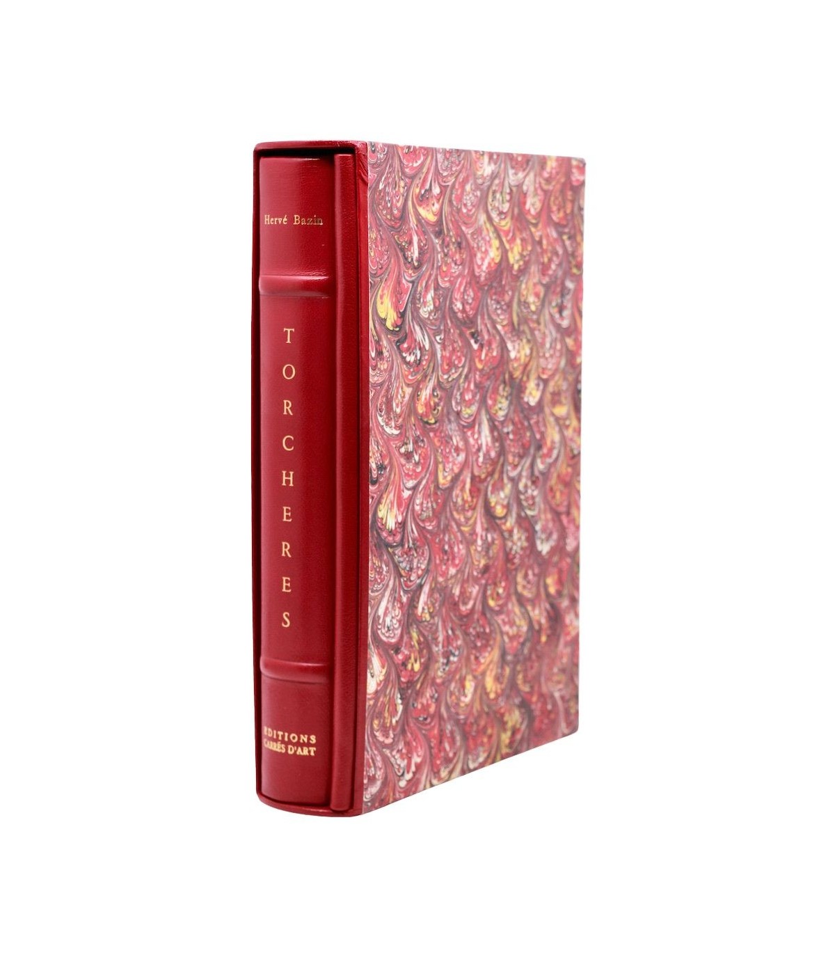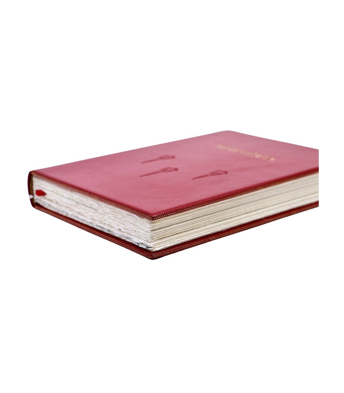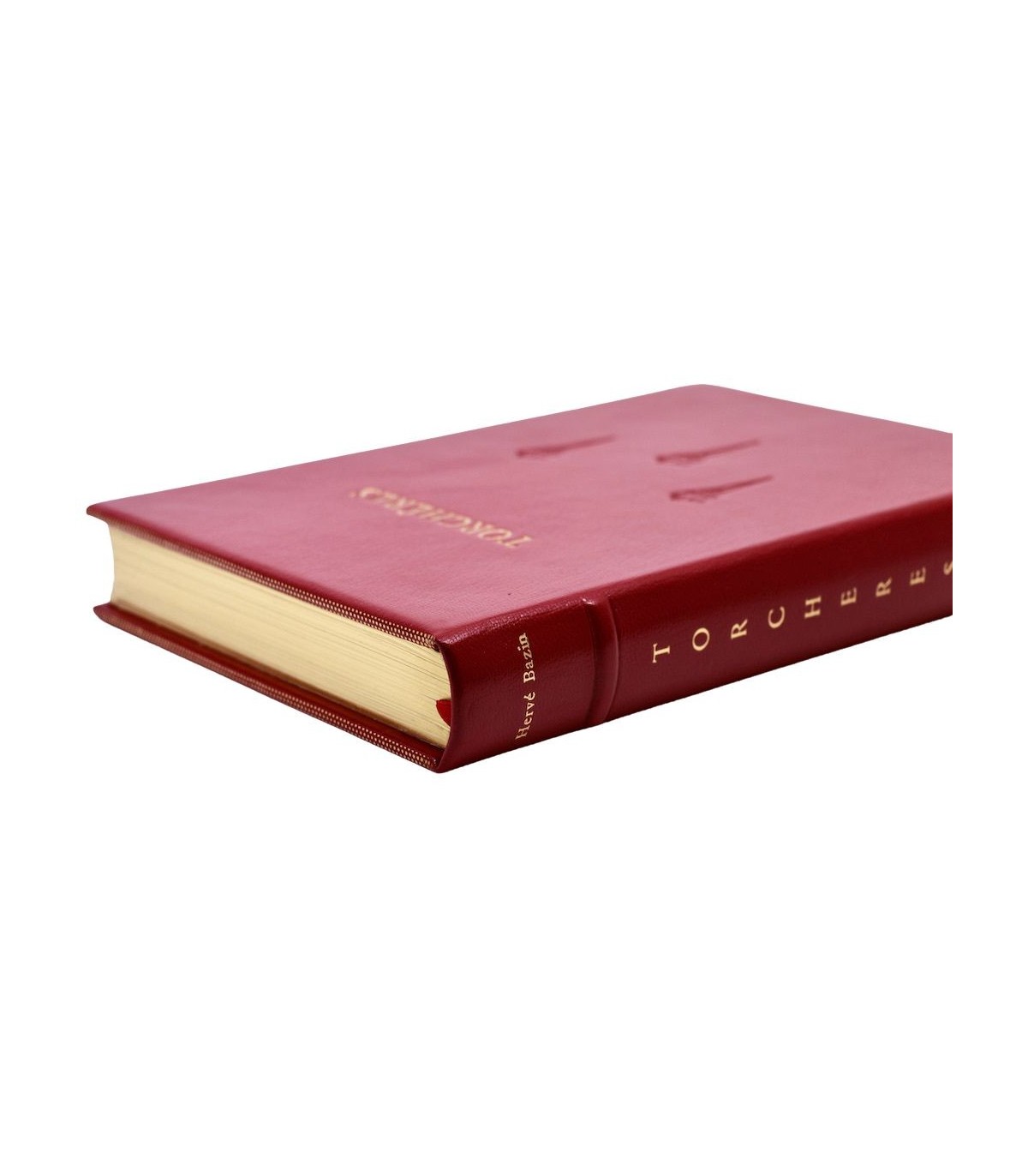 Plein cuir moderne rouge, dos à 2 faux nerfs, auteur, titre et éditeur frappés or, premier plat orné de 3 torchères à froid et du titre en lettres dorées, pointillés dorés parcourant les coupes, doublures et gardes de soie moirée crème, tête dorée, étui bordé (reliure éditeur).
