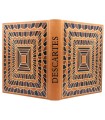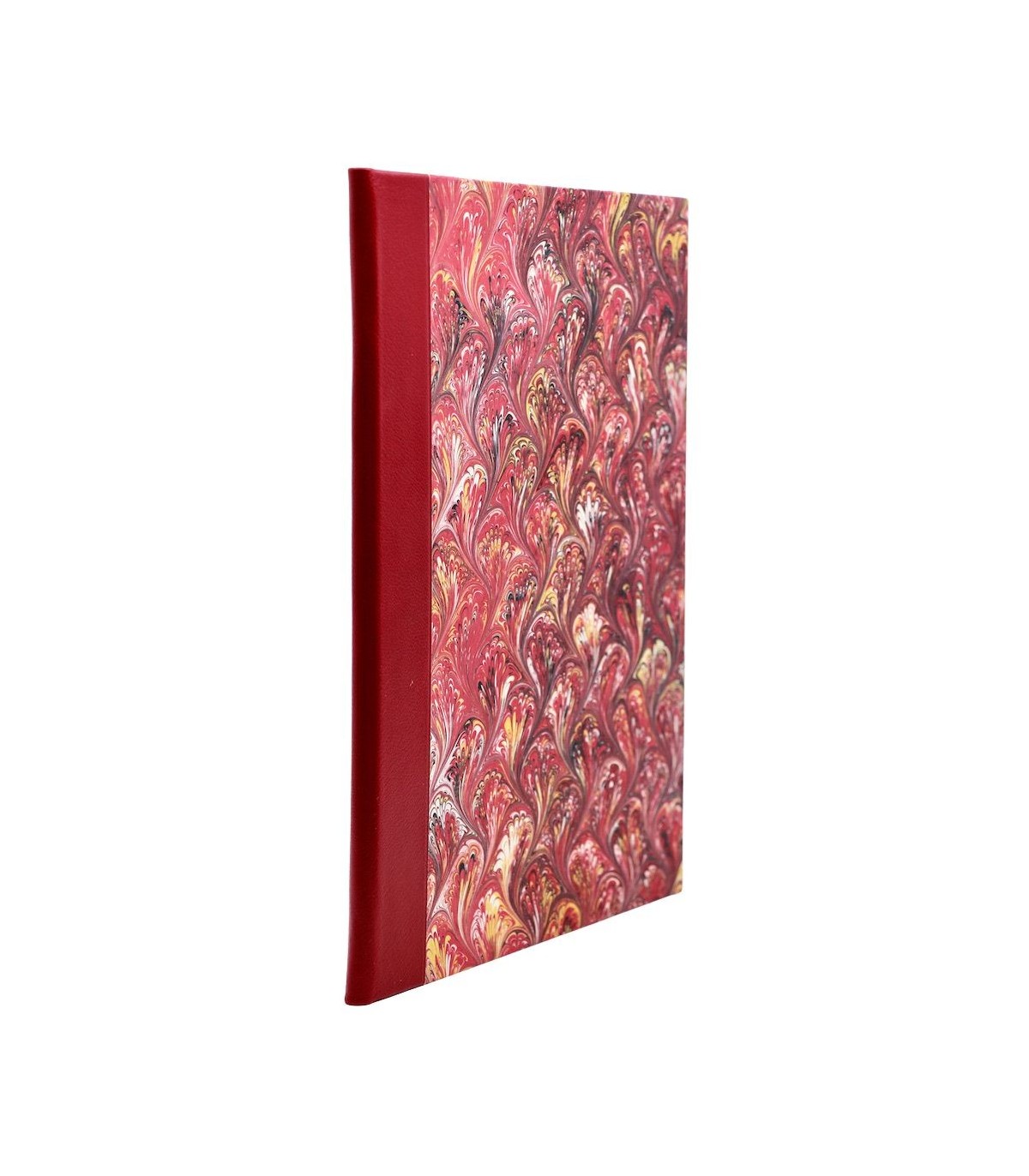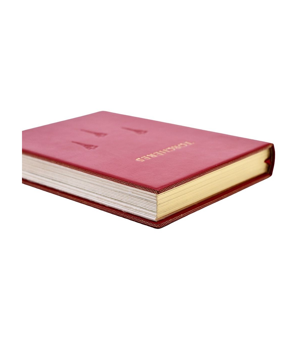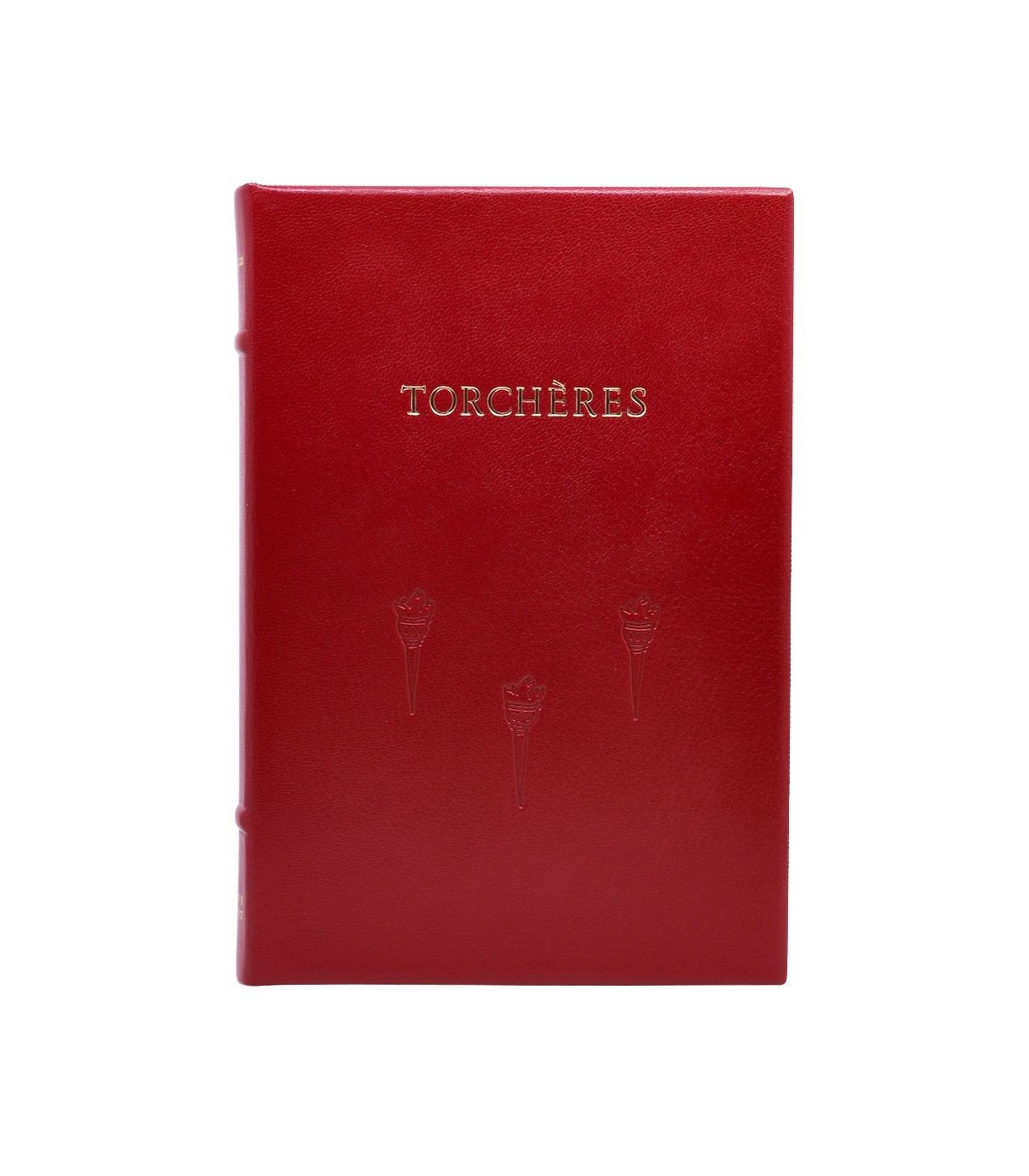 Plein cuir moderne rouge, dos à 2 faux nerfs, auteur, titre et éditeur frappés or, premier plat orné de 3 torchères à froid et du titre en lettres dorées, pointillés dorés parcourant les coupes, doublures et gardes de soie moirée crème, tête dorée, étui bordé (reliure éditeur).