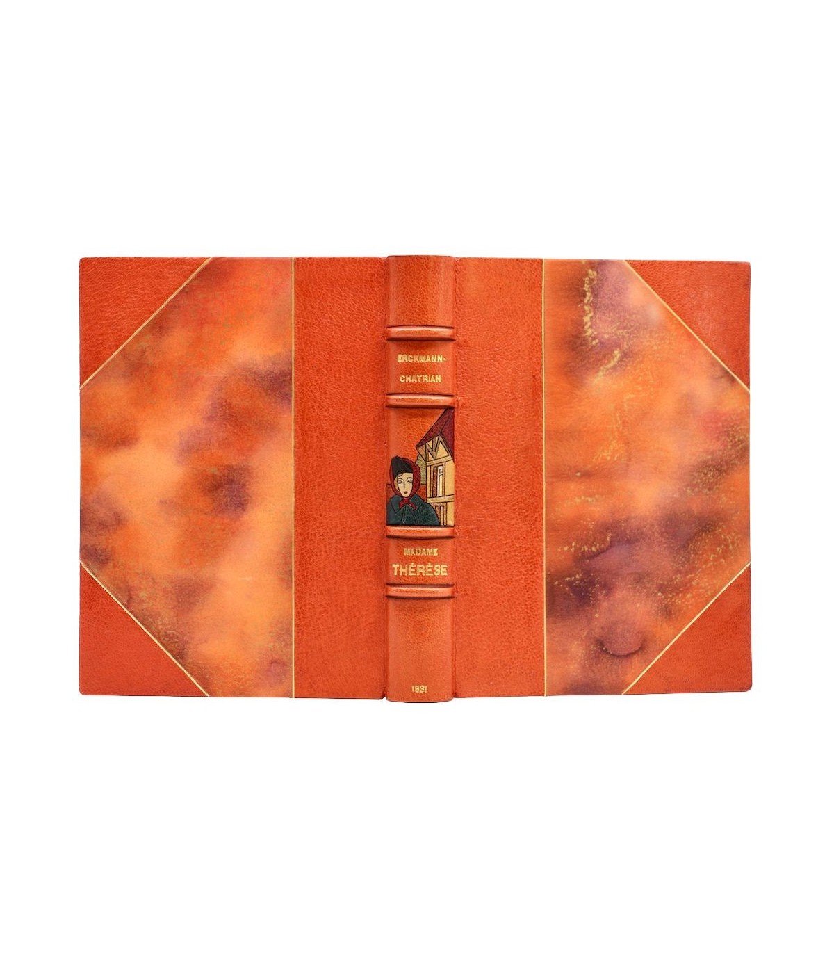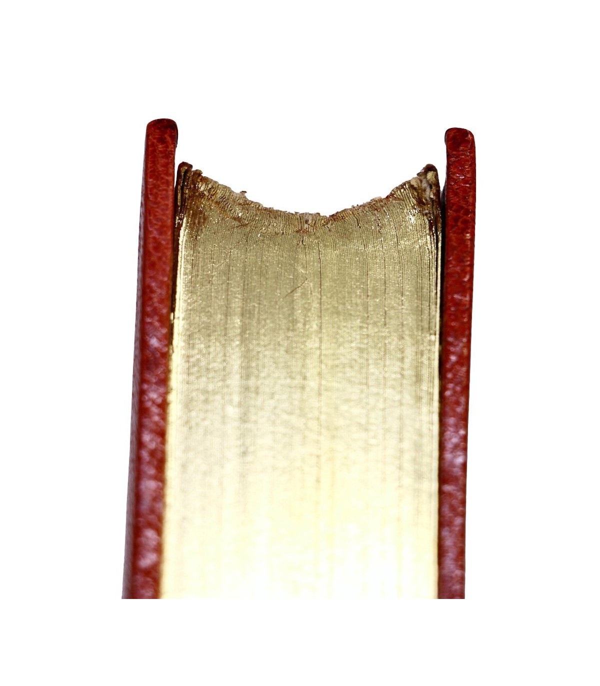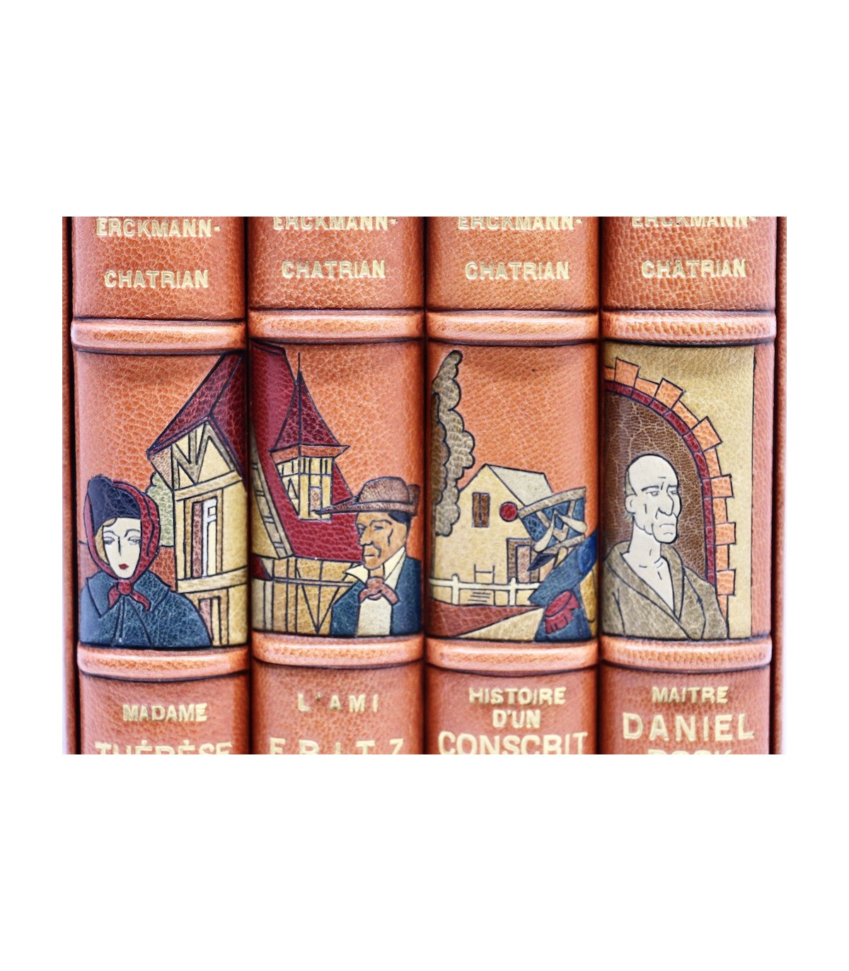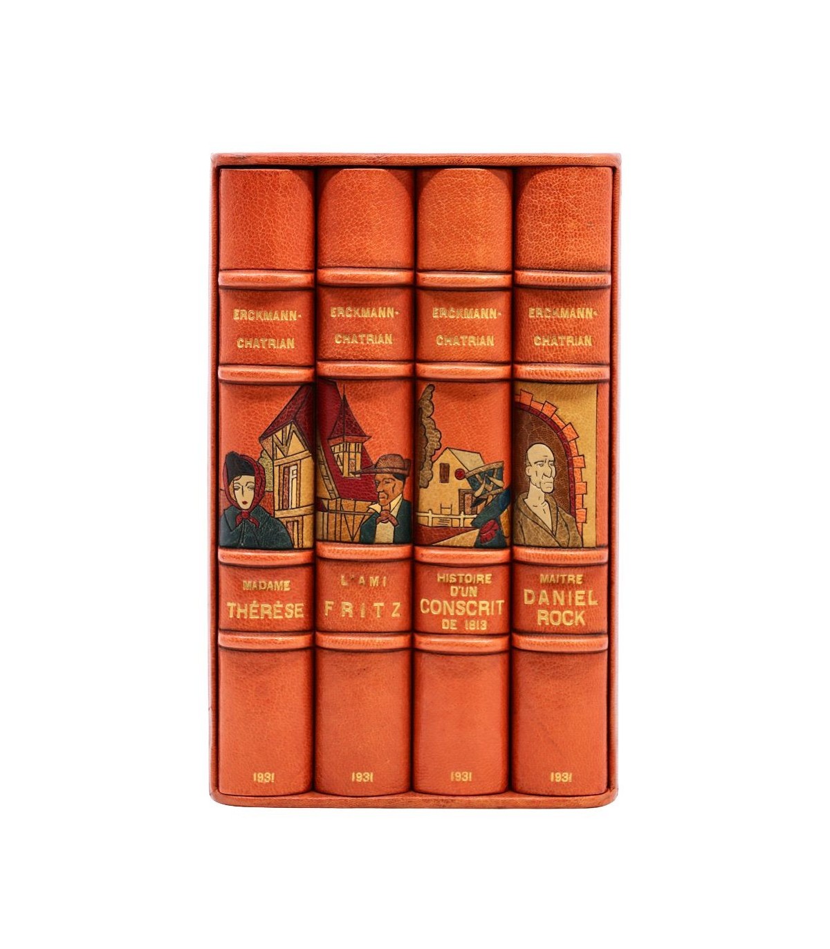 Demi-maroquin brique à coins, dos à 4 nerfs orné d’un décor mosaïqué (différent pour chaque volume), auteur, titre et date frappés or, filet doré sur les plats, tête dorée, couvertures et dos conservés, étui bordé commun.