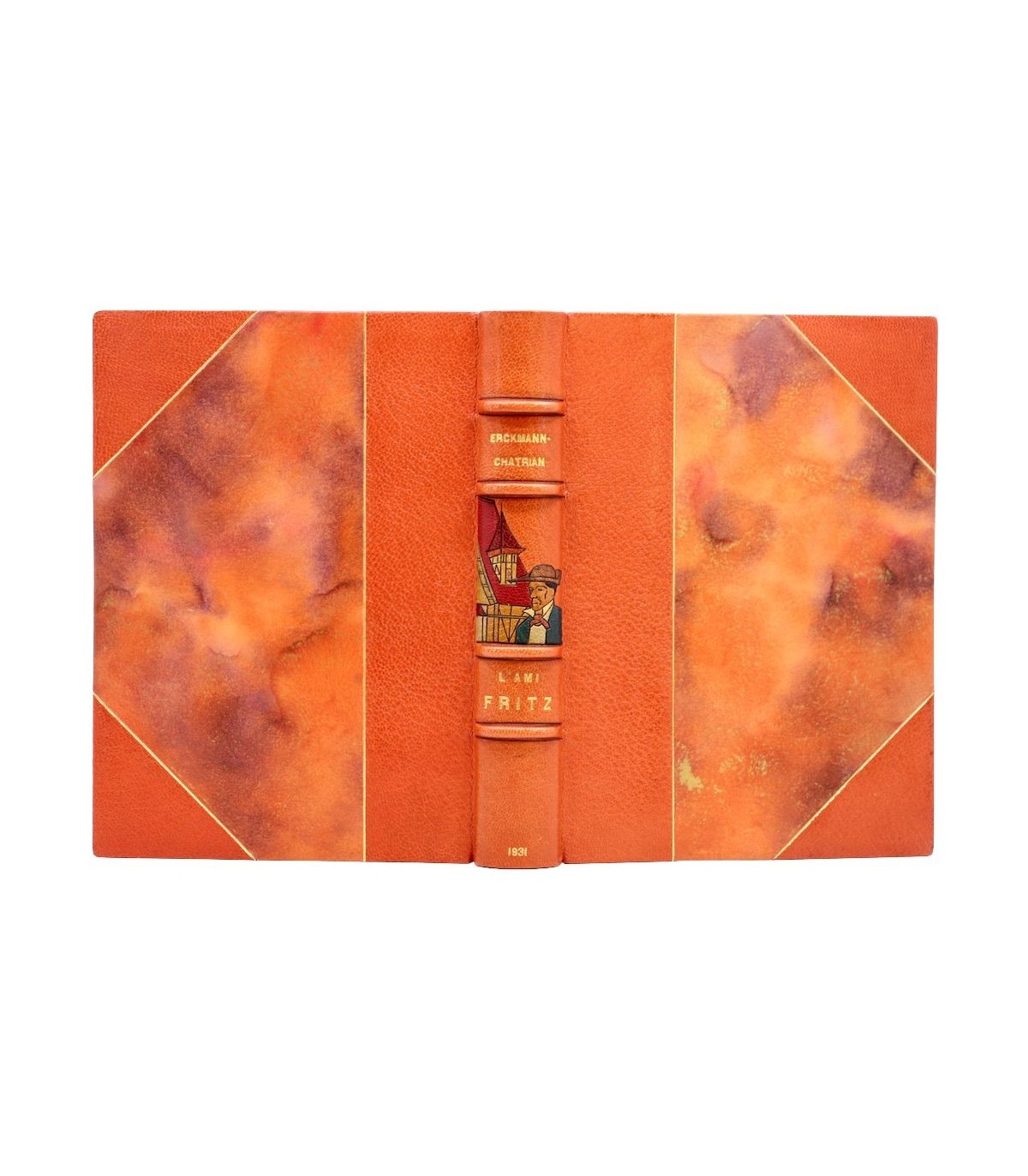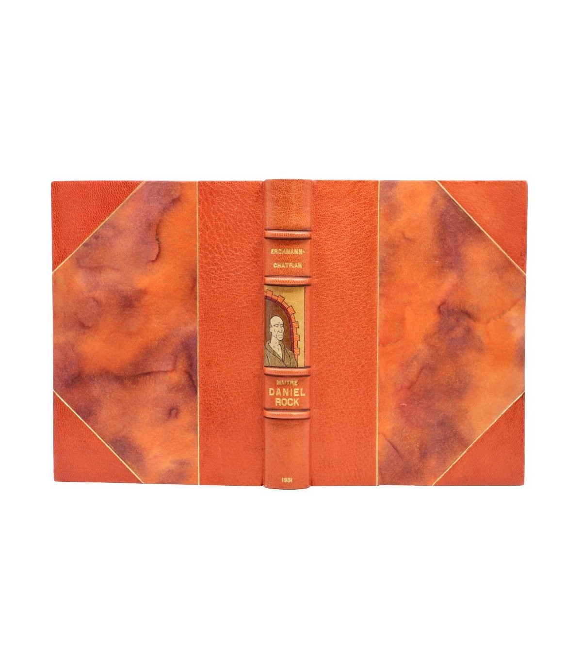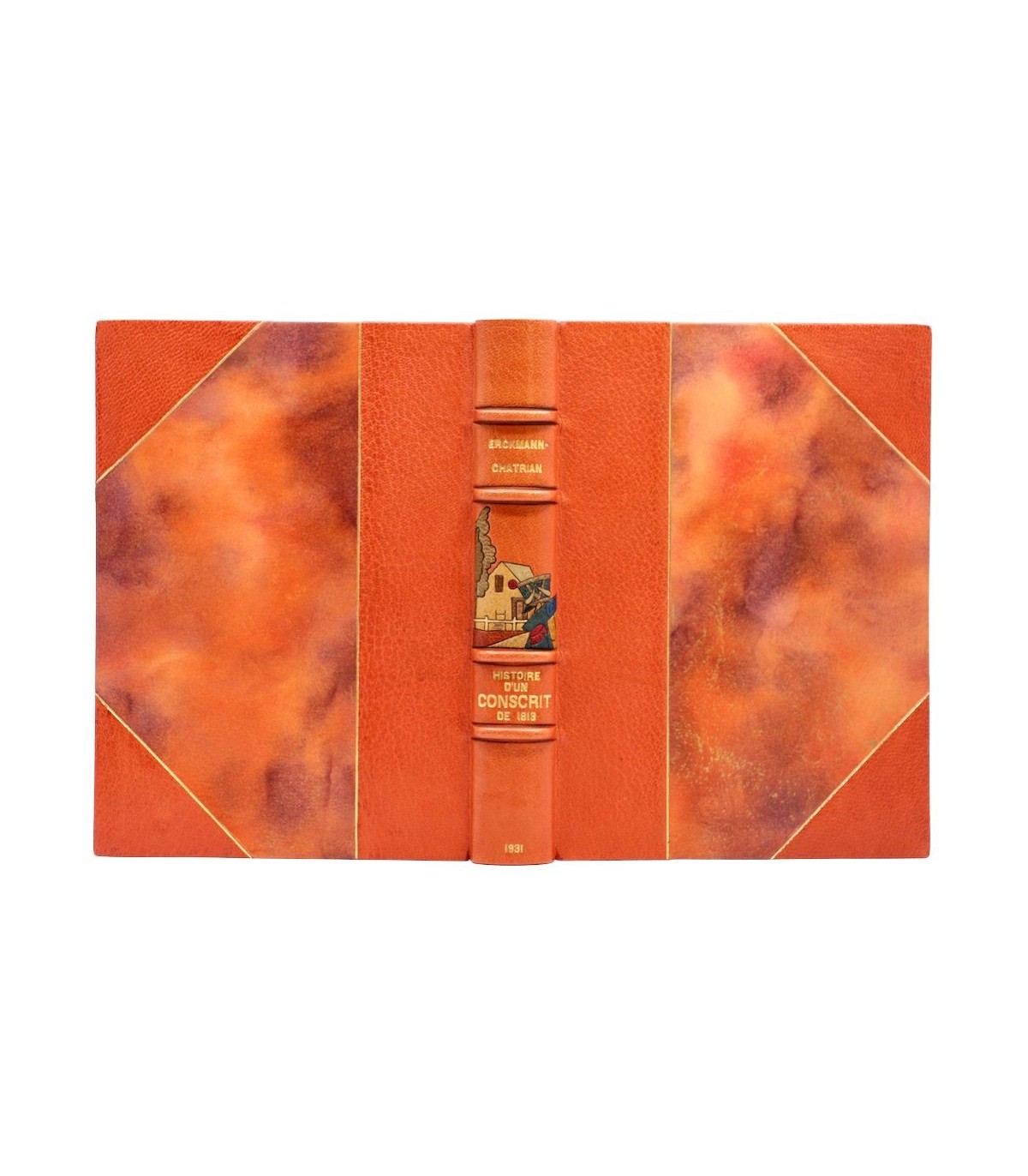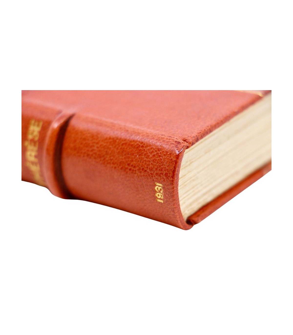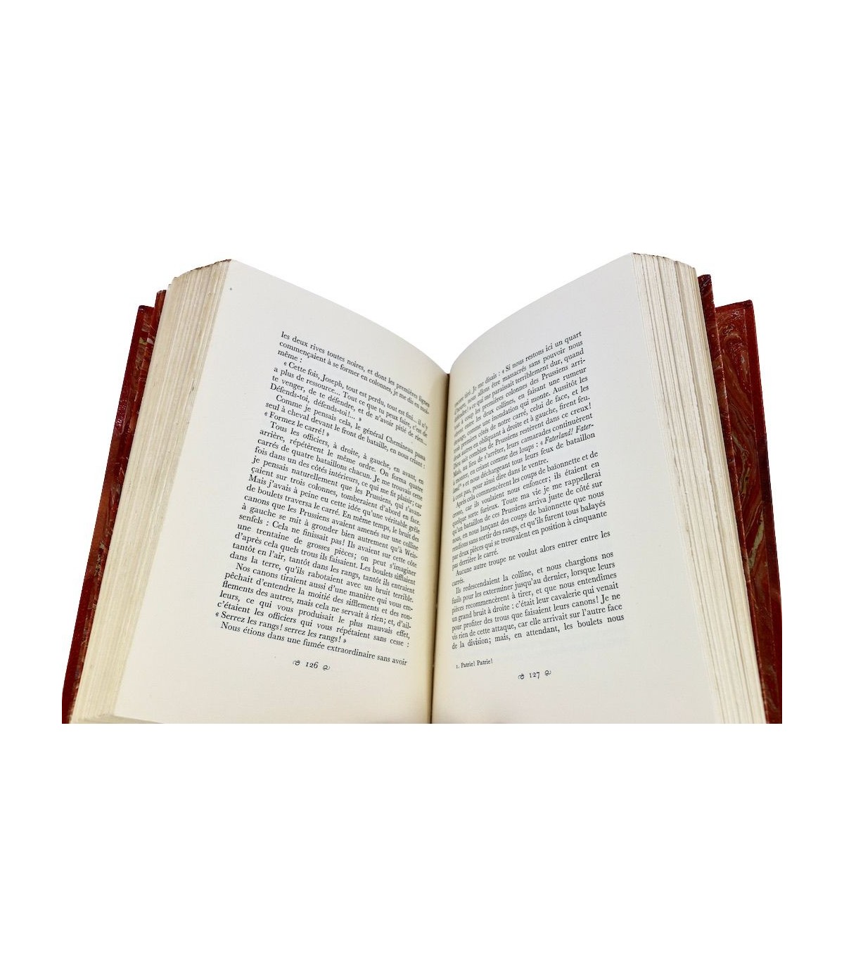 Demi-maroquin brique à coins, dos à 4 nerfs orné d’un décor mosaïqué (différent pour chaque volume), auteur, titre et date frappés or, filet doré sur les plats, tête dorée, couvertures et dos conservés, étui bordé commun.