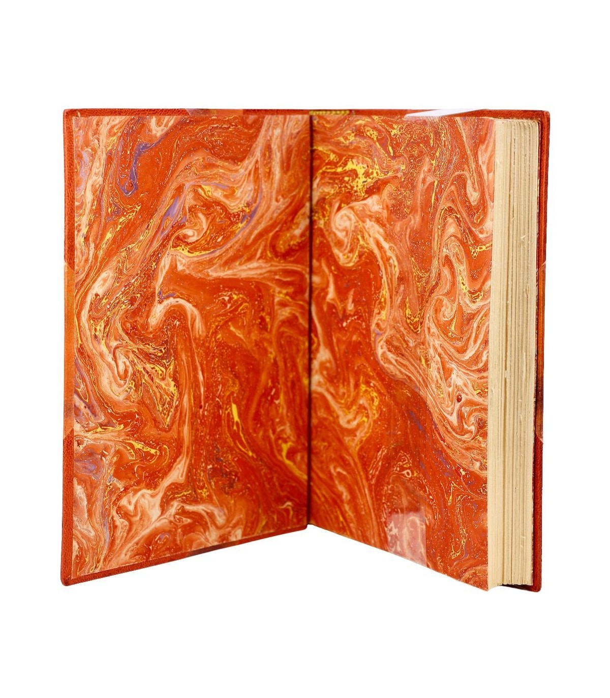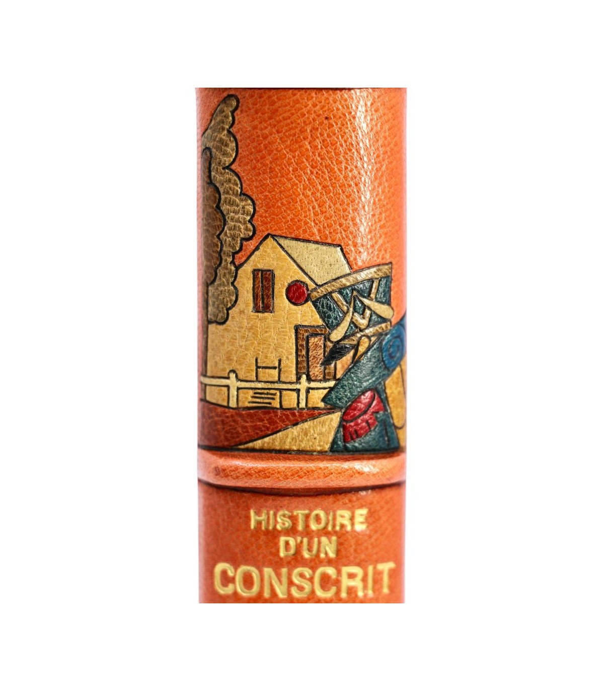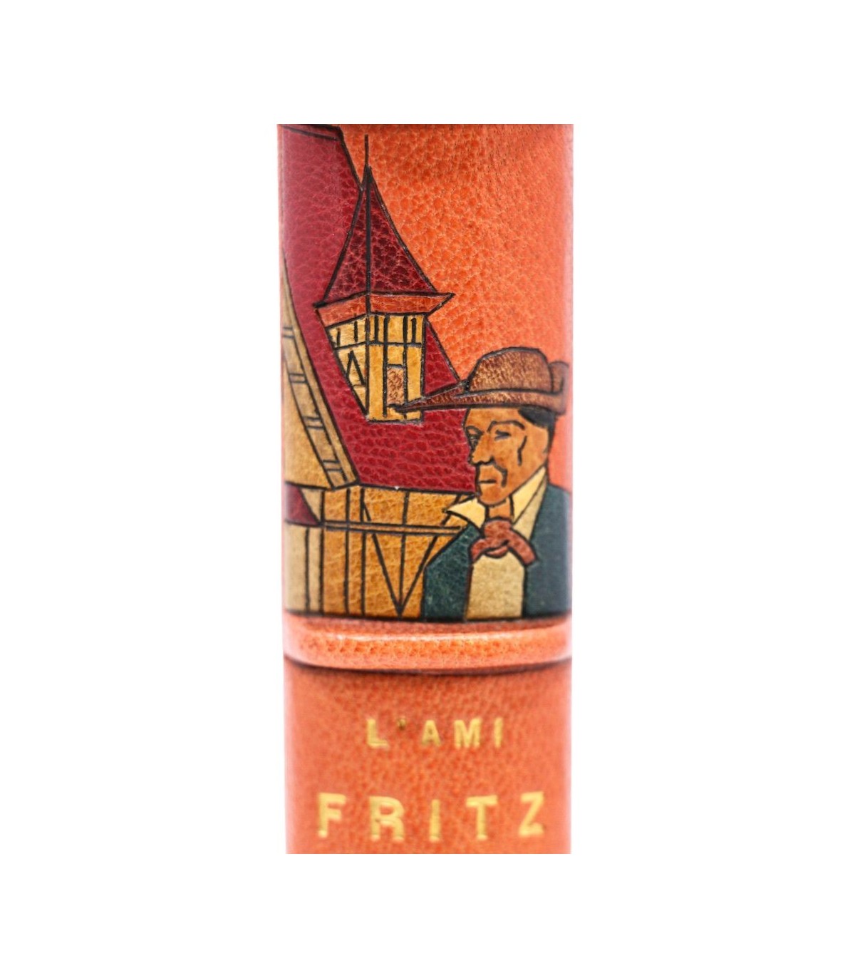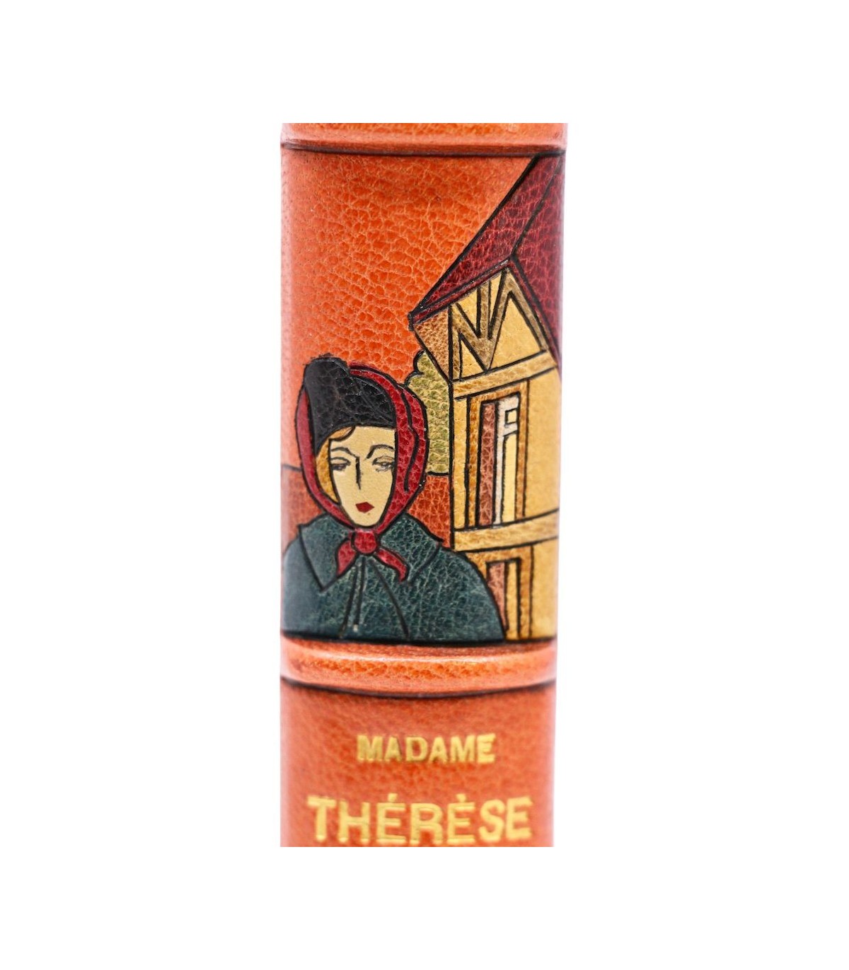 Demi-maroquin brique à coins, dos à 4 nerfs orné d’un décor mosaïqué (différent pour chaque volume), auteur, titre et date frappés or, filet doré sur les plats, tête dorée, couvertures et dos conservés, étui bordé commun.