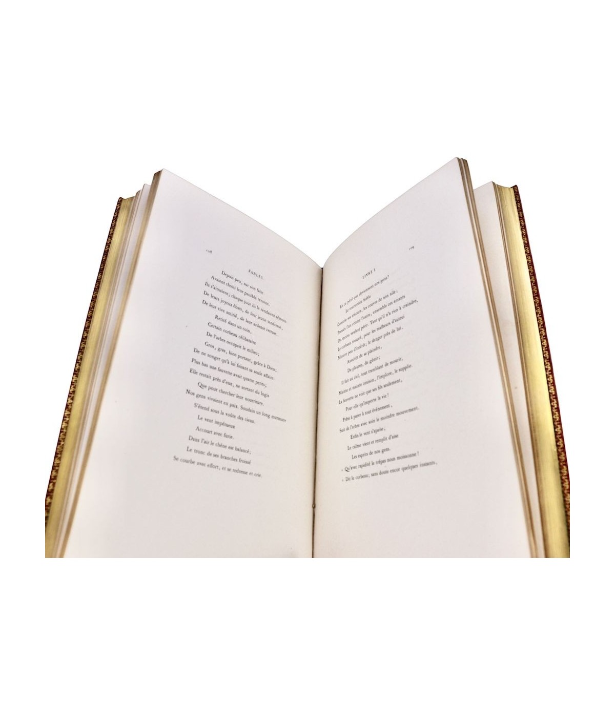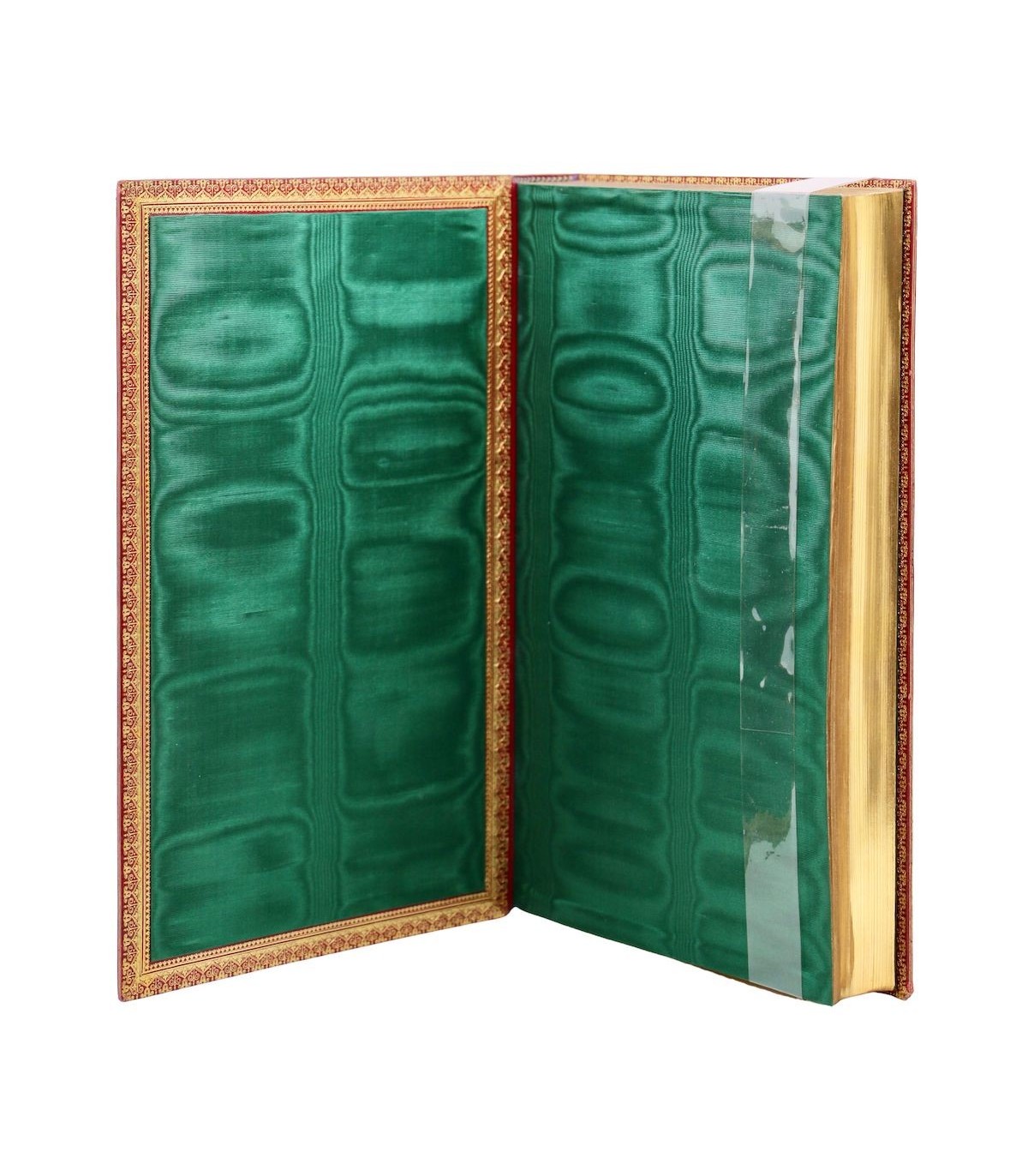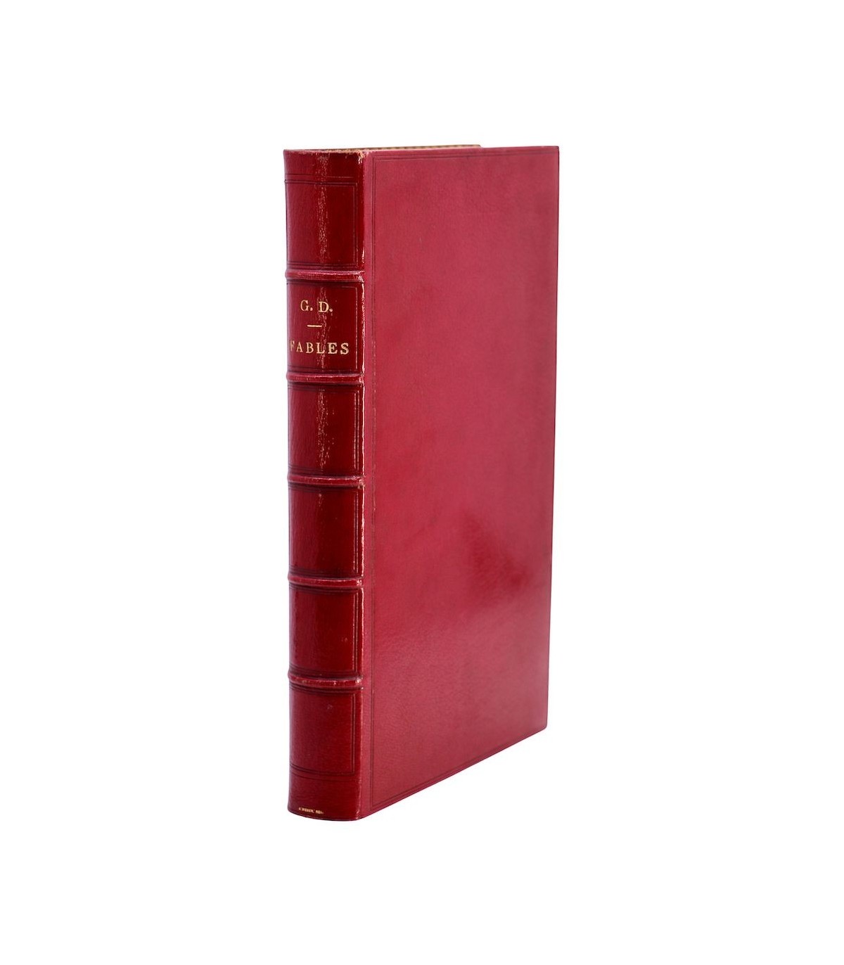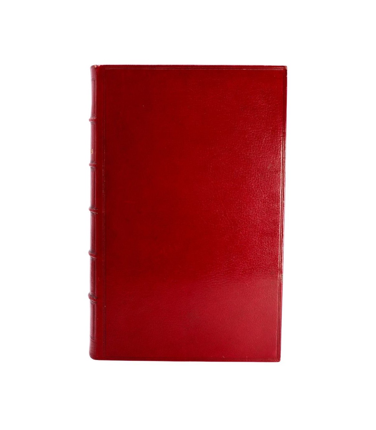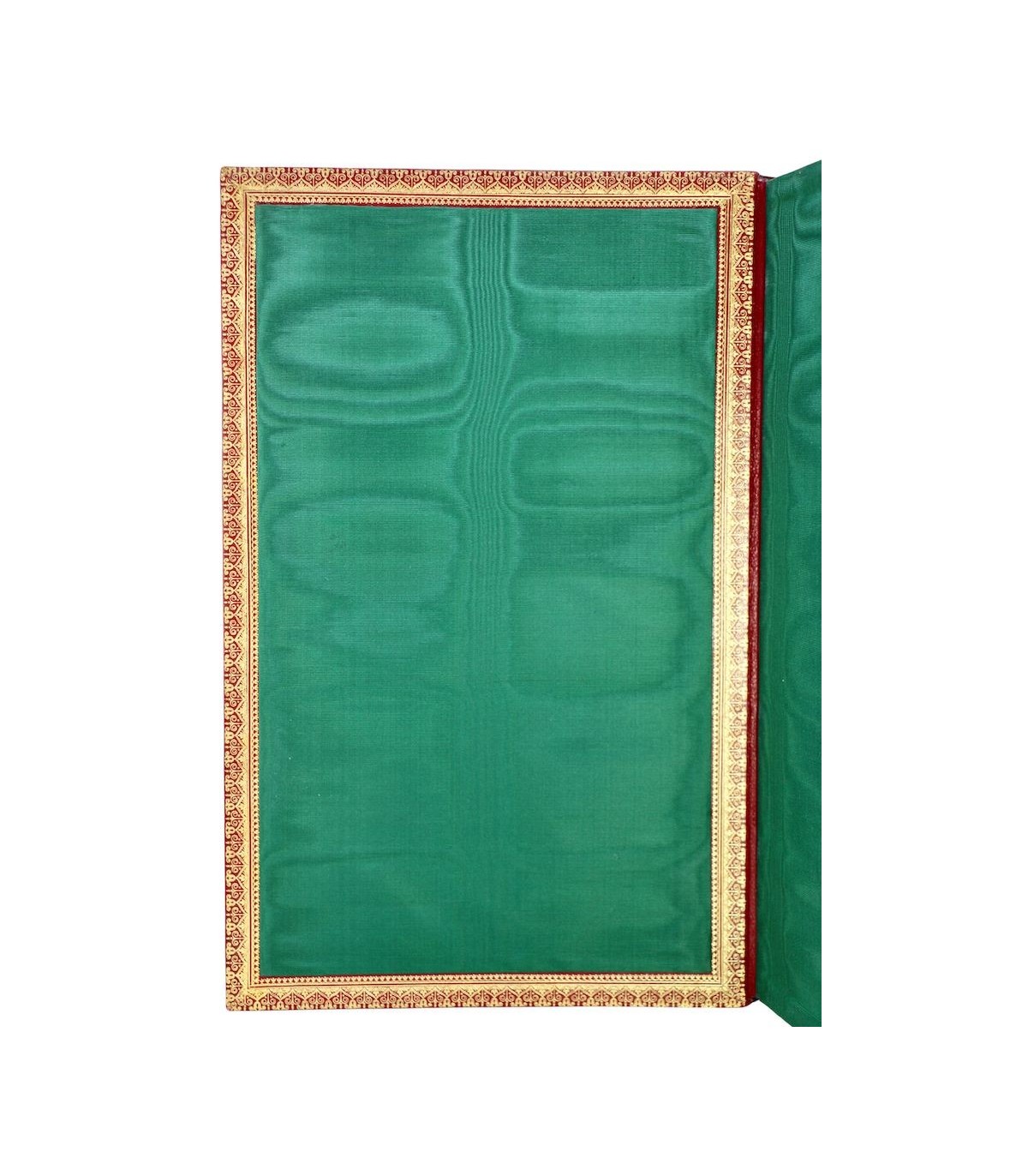 In-4 (27,5cm x 18,5cm) de 252pp. Plein maroquin rouge, dos à nerfs orné d’encadrements à froid, auteur et titre frappés or, coiffes guillochées, double filet doré parcourant les coupes, plats encadrés d’un double filet à froid, dentelle dorée encadrant les contreplats, doublures et gardes de soie moirée verte, tranches dorées (J. Weber).