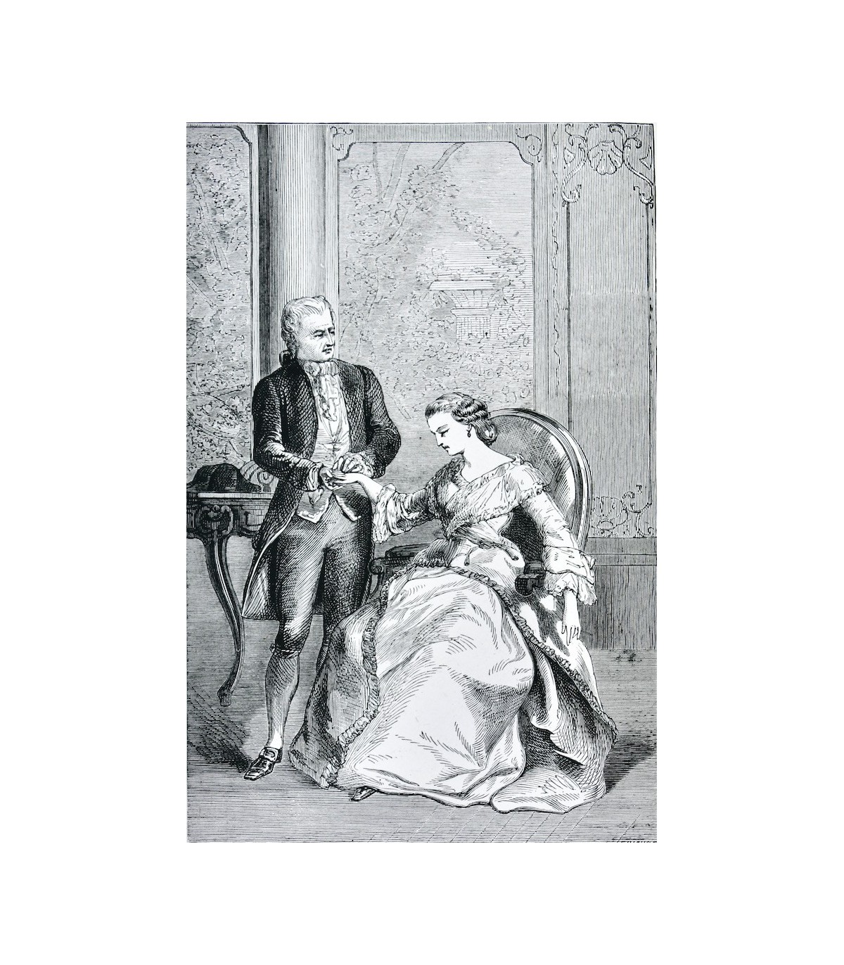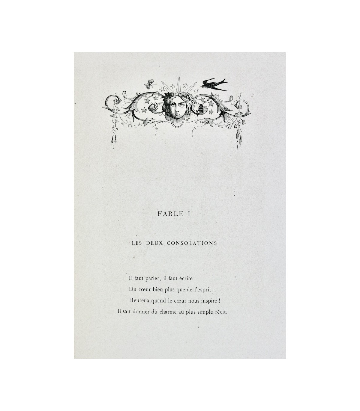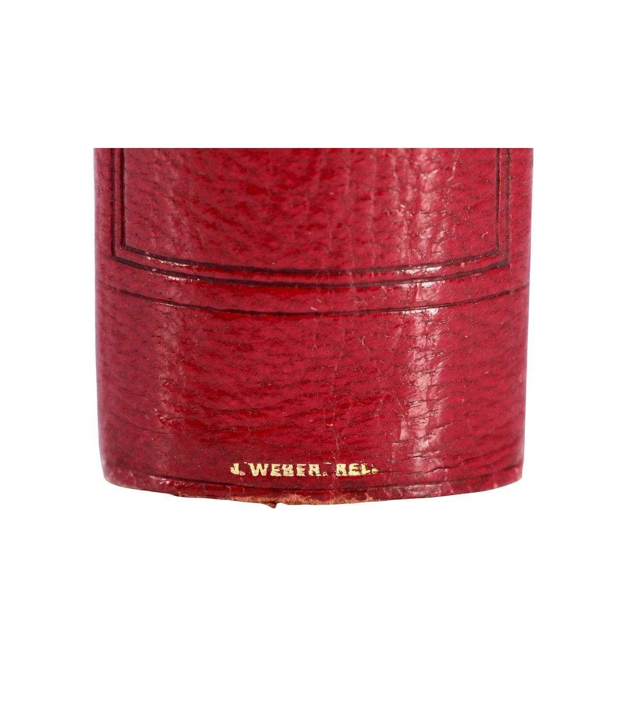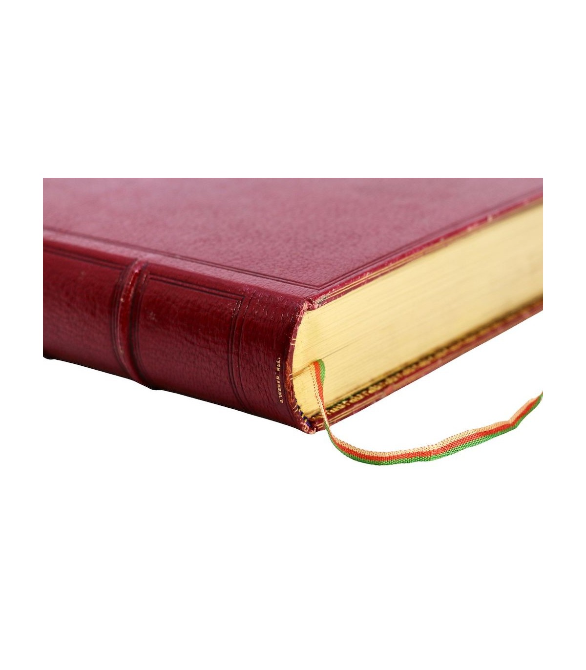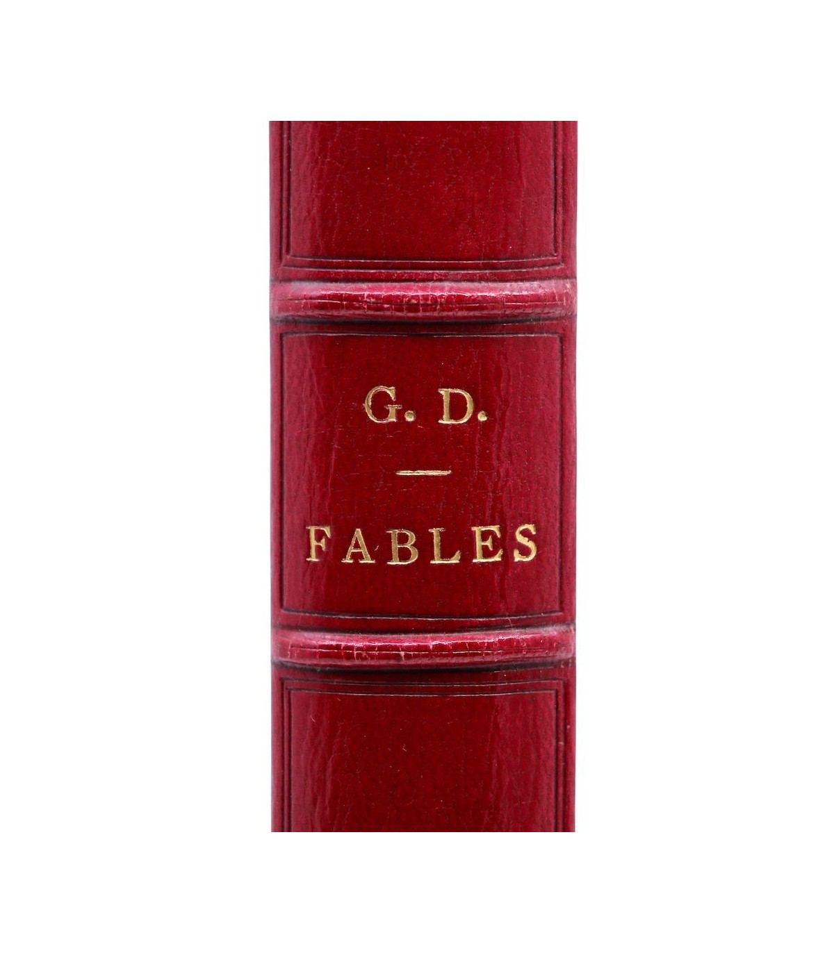 In-4 (27,5cm x 18,5cm) de 252pp. Plein maroquin rouge, dos à nerfs orné d’encadrements à froid, auteur et titre frappés or, coiffes guillochées, double filet doré parcourant les coupes, plats encadrés d’un double filet à froid, dentelle dorée encadrant les contreplats, doublures et gardes de soie moirée verte, tranches dorées (J. Weber).