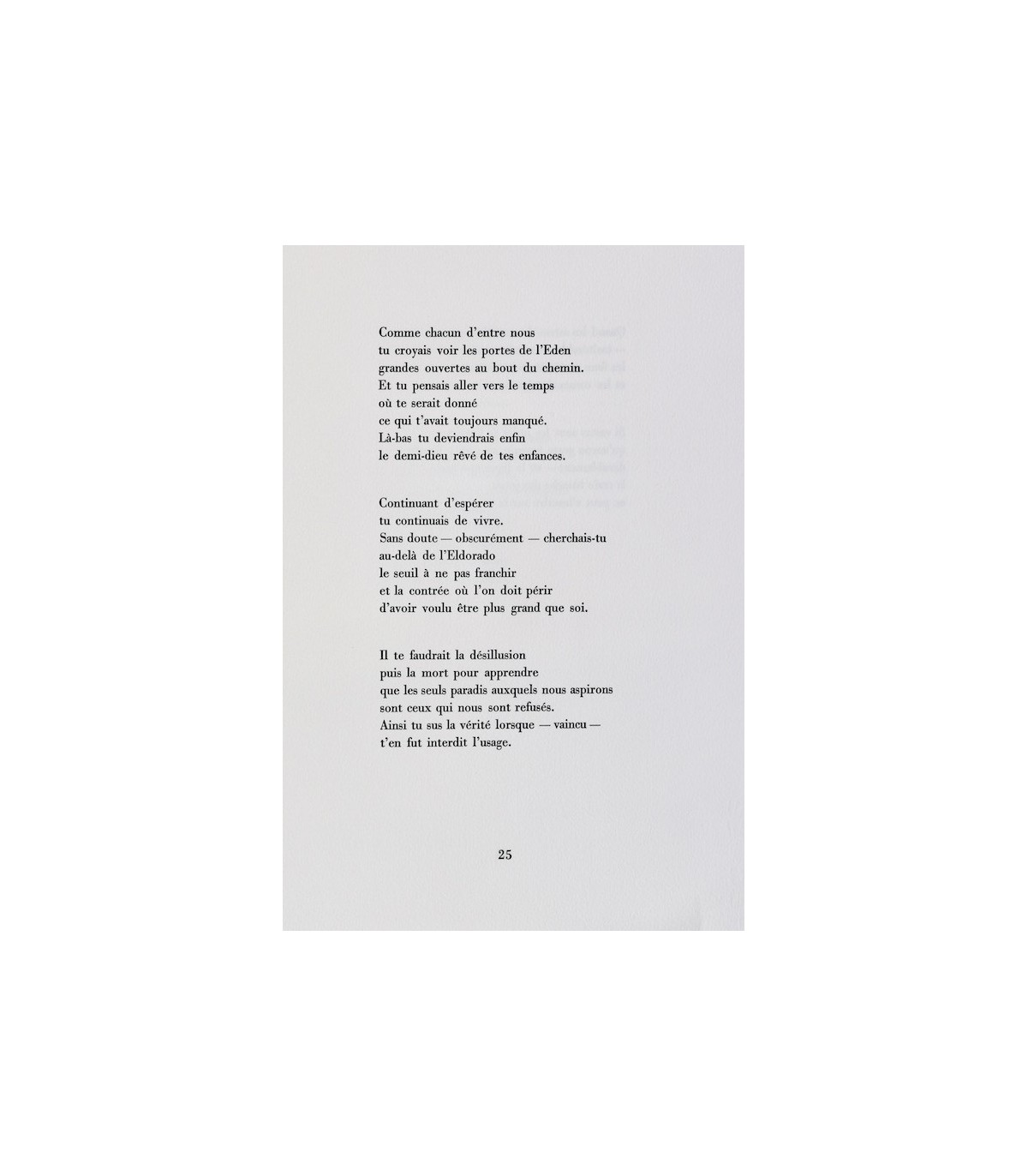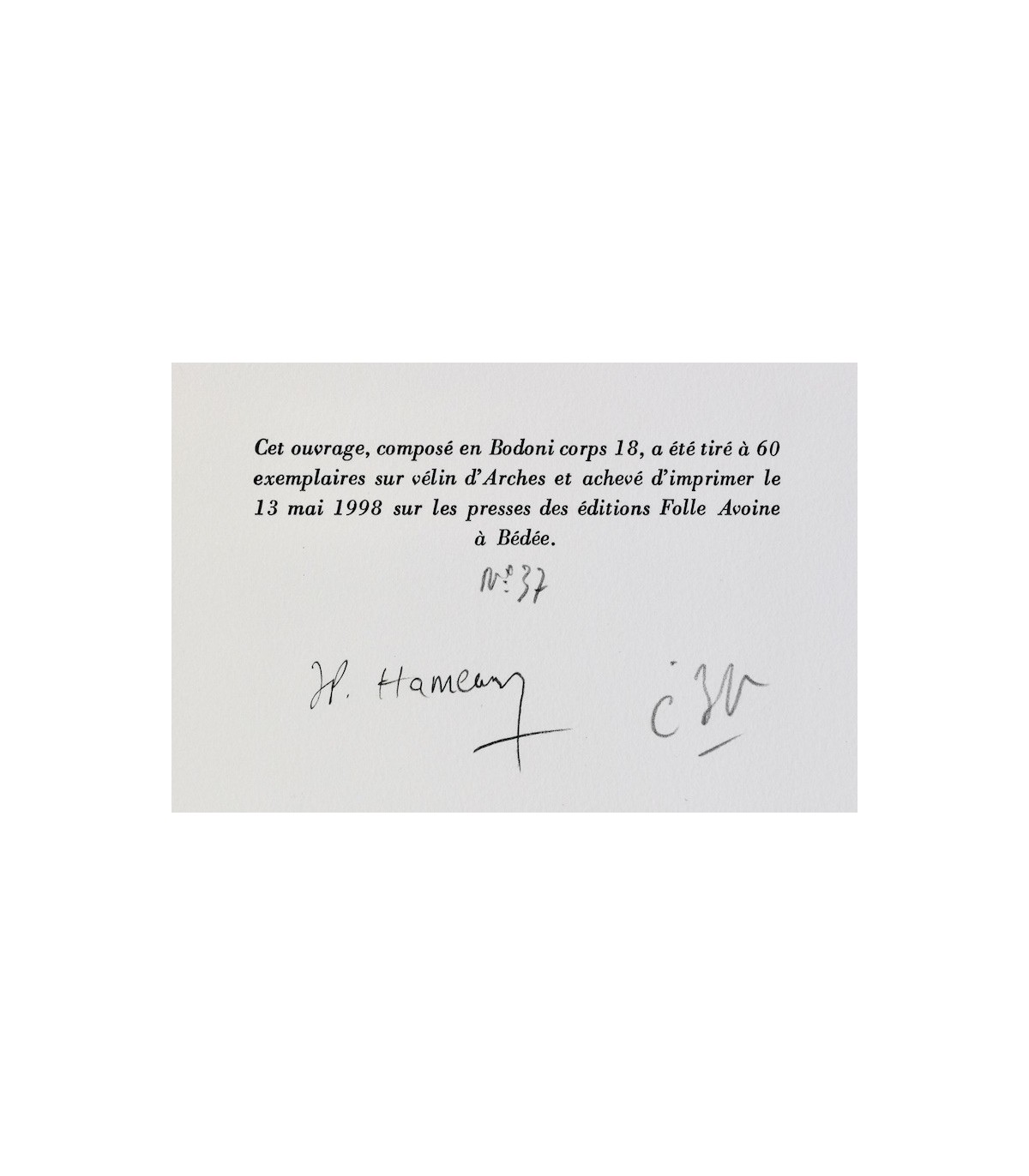 In-folio (38,8cm x 29cm) de 33-[2]pp. Tirage limité à 60 exemplaires numérotés sur vélin d’Arches. En feuilles sous couverture imprimée à rabats.