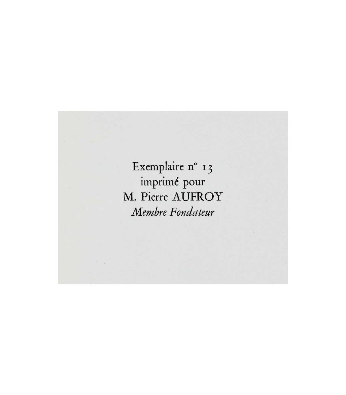 Ouvrage illustré de 22 pointes-sèches par Aymar de Lézardière, dont le frontispice, 2 doubles-pages, 8 hors-texte et 11 in-texte. Un des exemplaires numérotés, celui-ci n°13 imprimé pour M. Pierre Aufroy, membre fondateur.