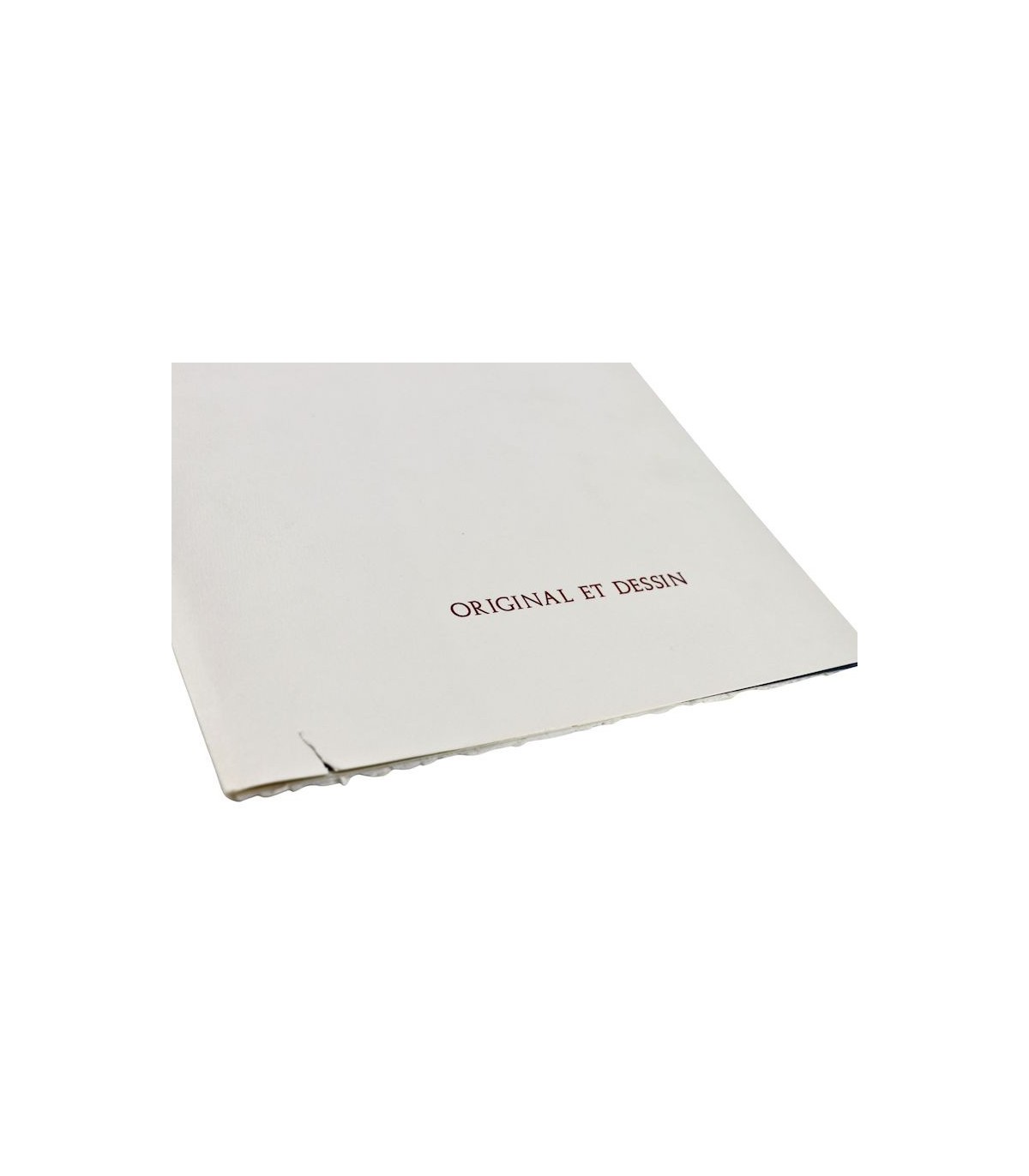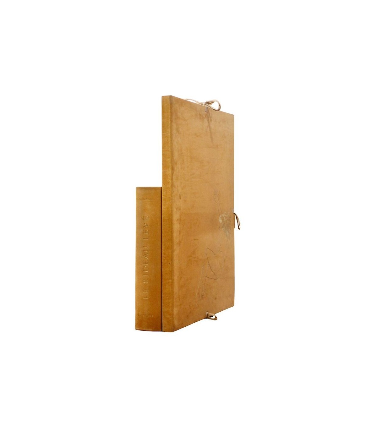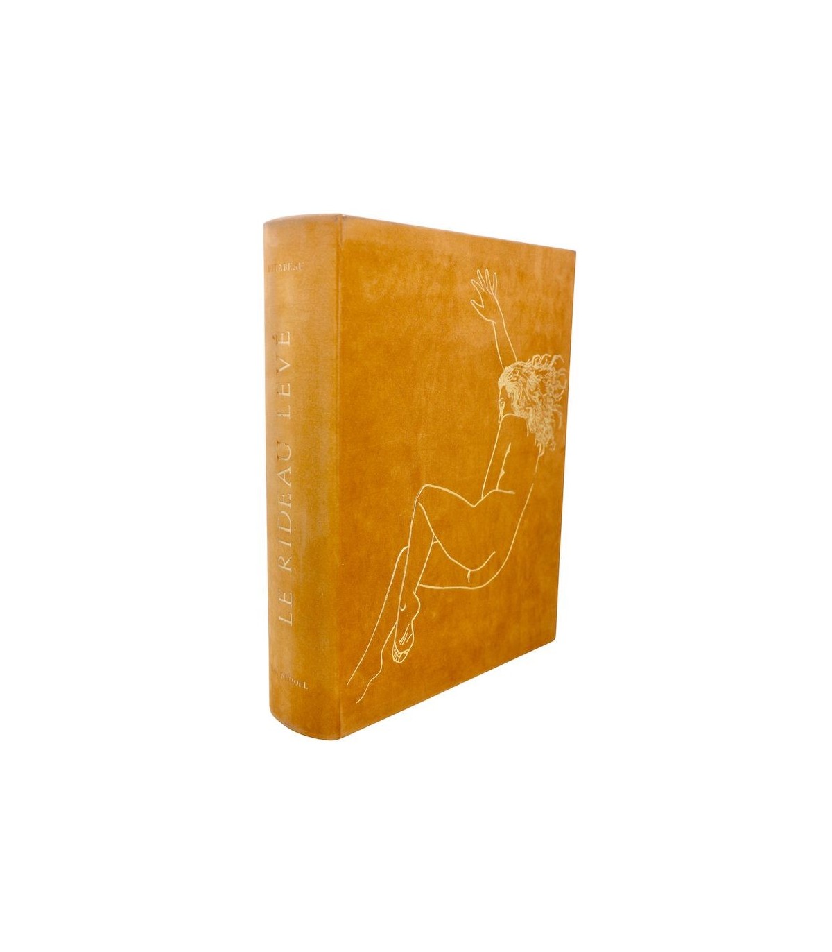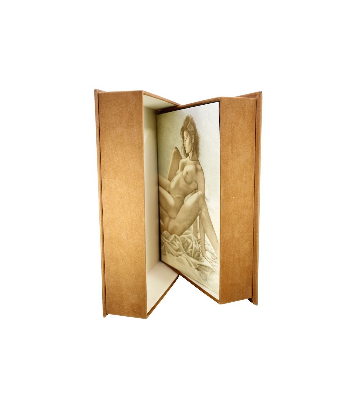 In-4 (33,2cm x 26cm) de 159-[8]pp. & portefeuille de suites in-plano (58,5cm x 41cm). Tirage à 310 exemplaires numérotés : 10 exemplaires sur Japon nacré et 300 exemplaires sur vélin pur chiffon d’Arches. En feuilles sous couverture illustrée signée, rempliée sous rhodoïd et emboitage de daim fauve orné de l’auteur, du titre et de l’illustrateur en lettres dorées au dos et d'un décor érotique doré sur le premier plat, portefeuille de suites assorti (reliure éditeur).