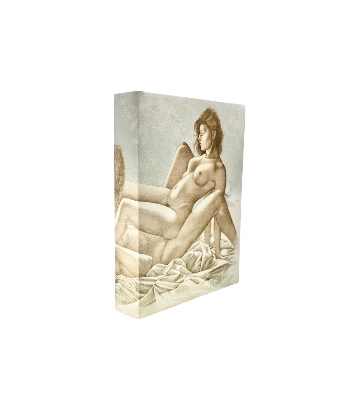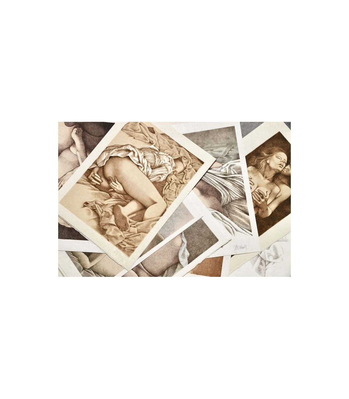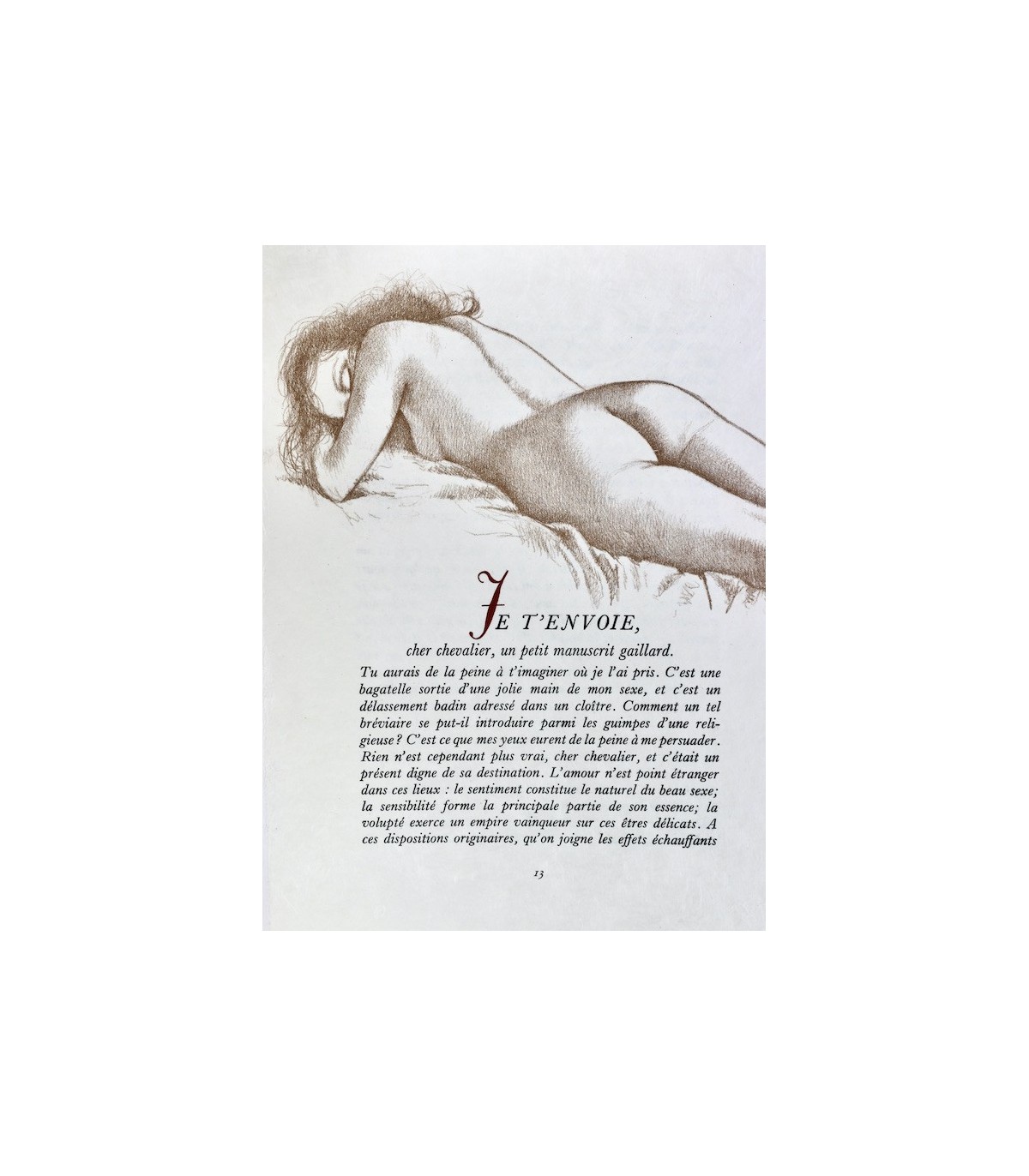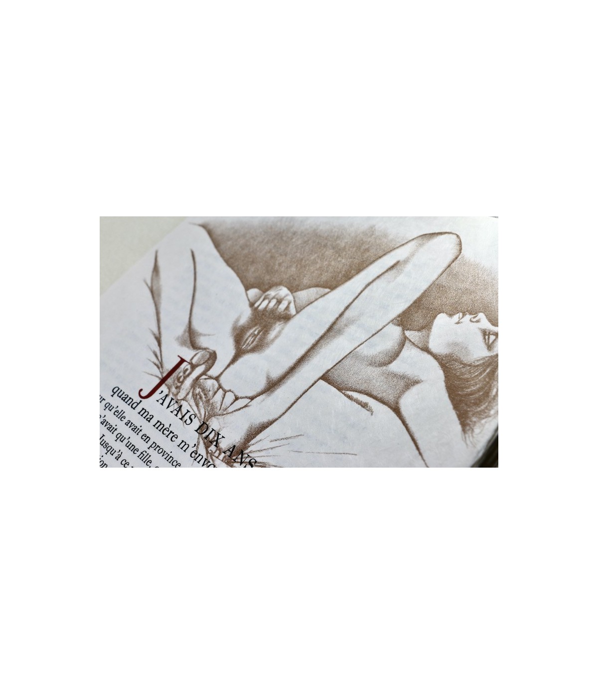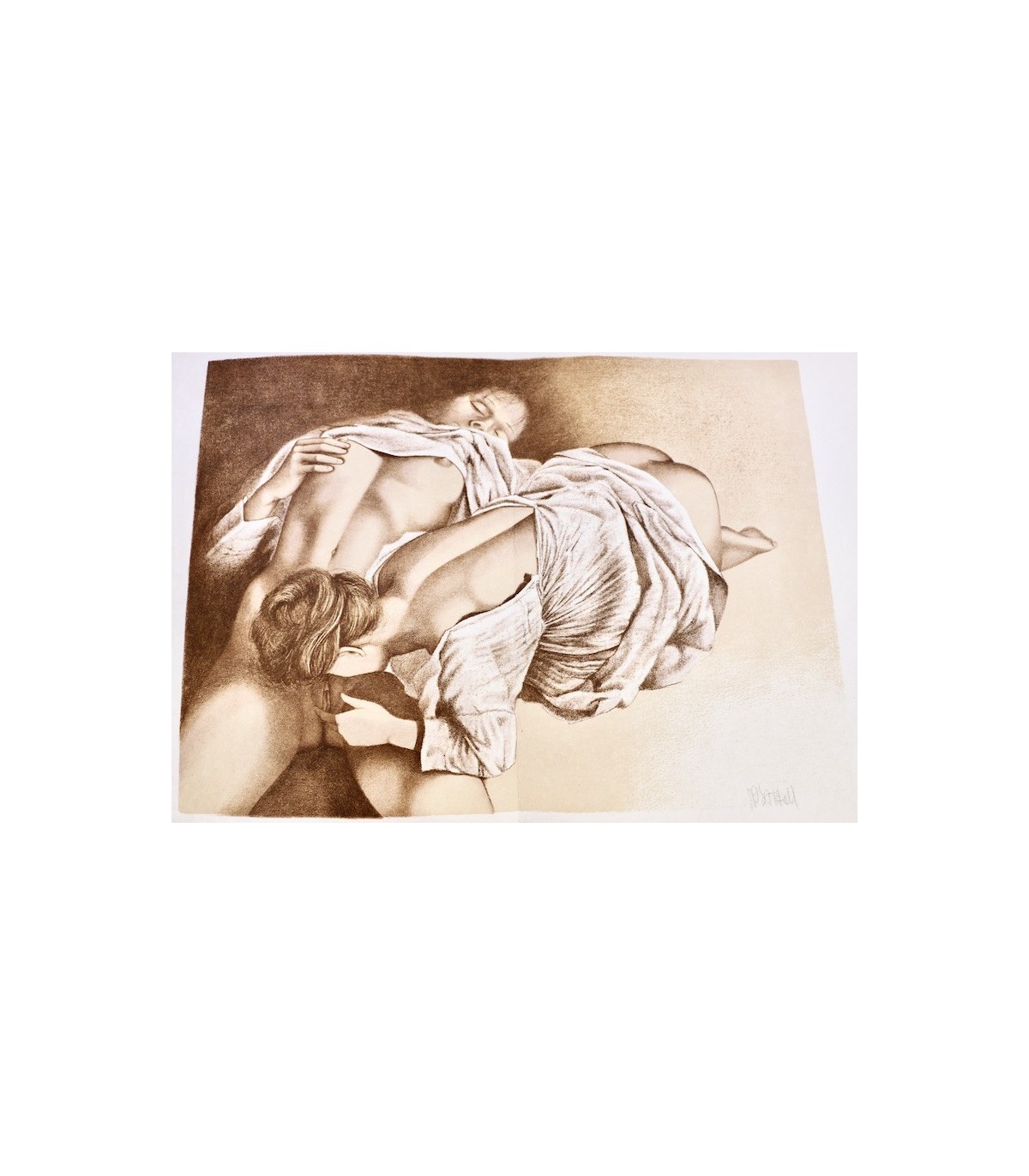 In-4 (33,2cm x 26cm) de 159-[8]pp. & portefeuille de suites in-plano (58,5cm x 41cm). Tirage à 310 exemplaires numérotés : 10 exemplaires sur Japon nacré et 300 exemplaires sur vélin pur chiffon d’Arches. En feuilles sous couverture illustrée signée, rempliée sous rhodoïd et emboitage de daim fauve orné de l’auteur, du titre et de l’illustrateur en lettres dorées au dos et d'un décor érotique doré sur le premier plat, portefeuille de suites assorti (reliure éditeur).
