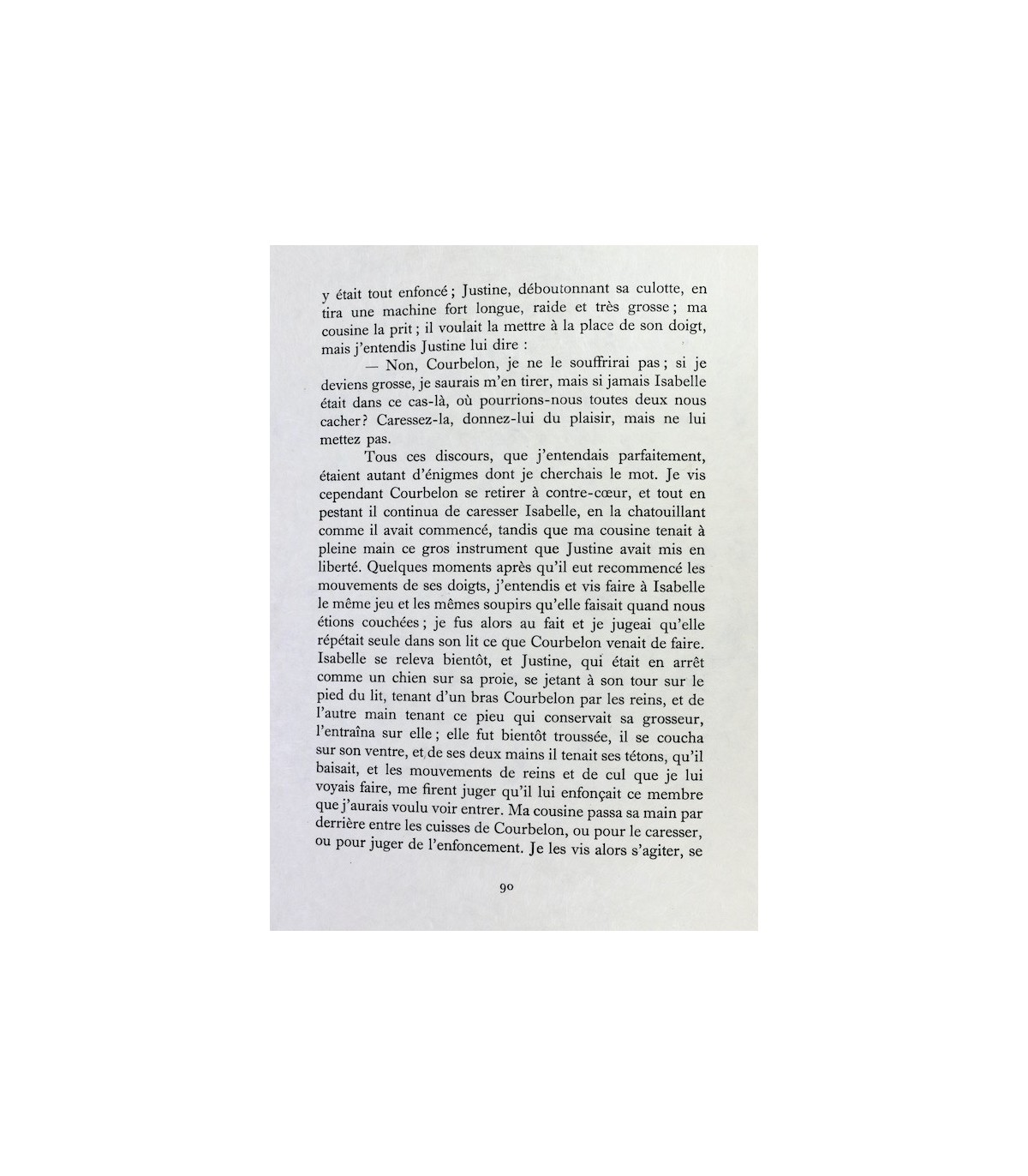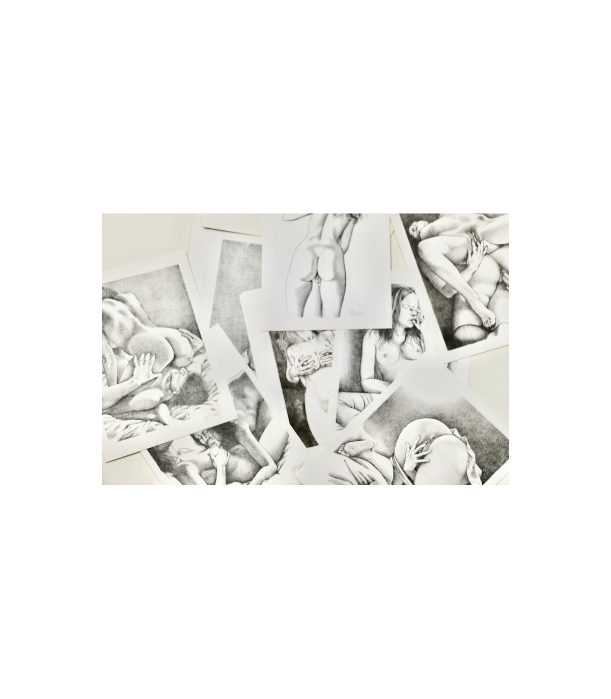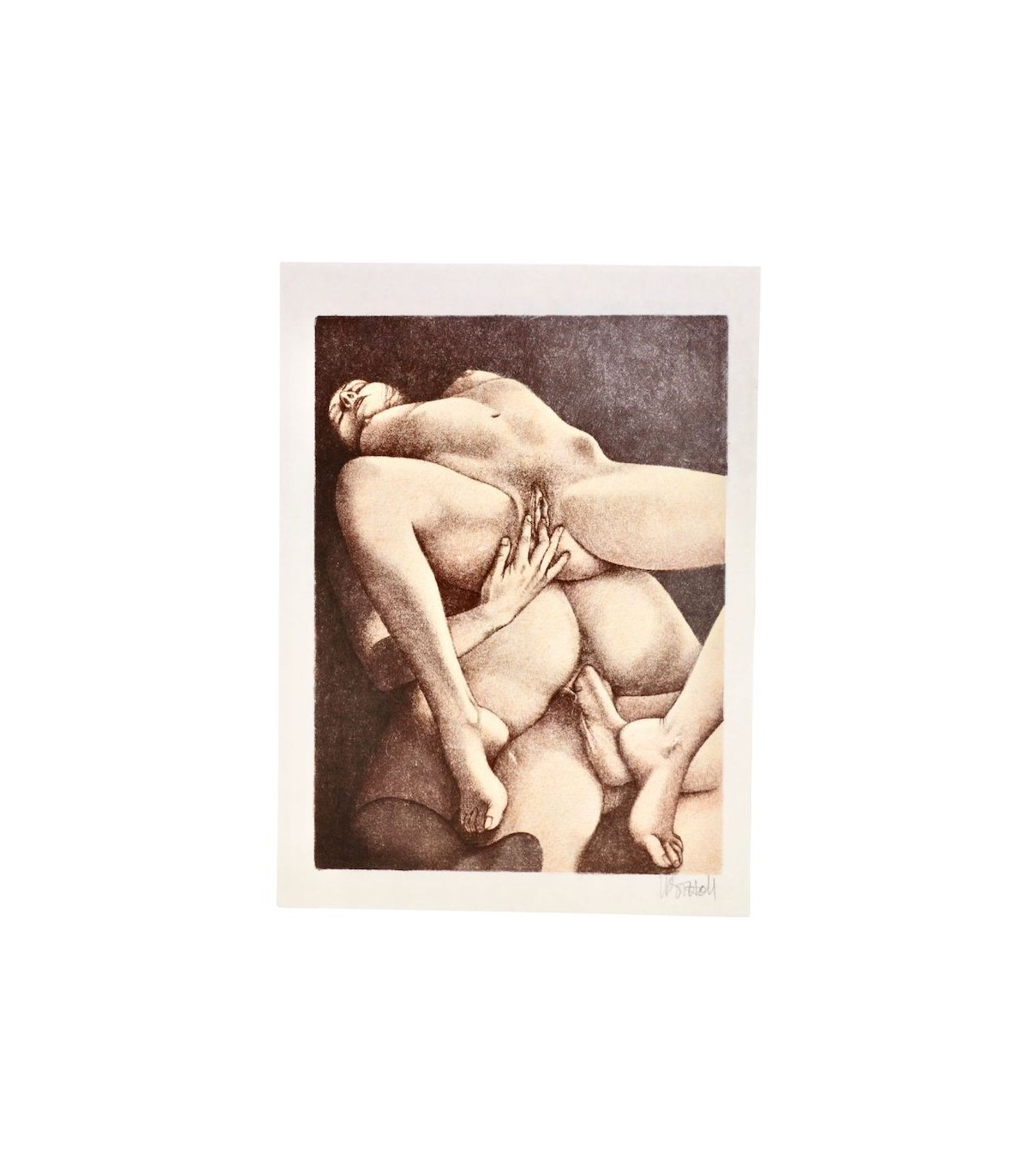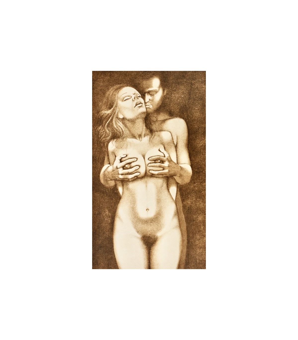In-4 (33,2cm x 26cm) de 159-[8]pp. & portefeuille de suites in-plano (58,5cm x 41cm). Tirage à 310 exemplaires numérotés : 10 exemplaires sur Japon nacré et 300 exemplaires sur vélin pur chiffon d’Arches. En feuilles sous couverture illustrée signée, rempliée sous rhodoïd et emboitage de daim fauve orné de l’auteur, du titre et de l’illustrateur en lettres dorées au dos et d'un décor érotique doré sur le premier plat, portefeuille de suites assorti (reliure éditeur).
