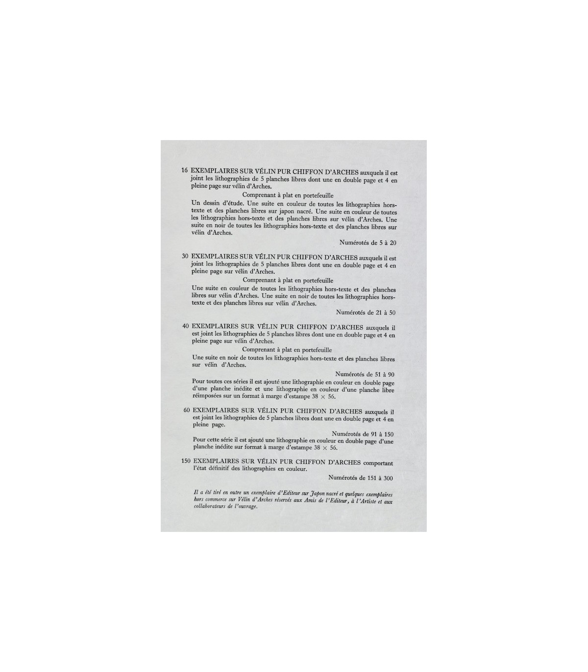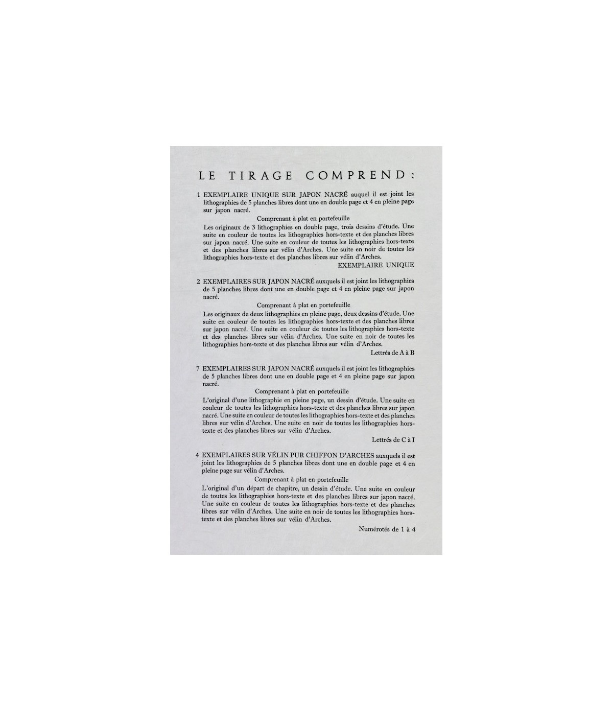 - une suite en noir de toutes les lithographies hors-texte et des planches libres sur vélin d'Arches, l’ensemble signé au crayon par l’artiste.