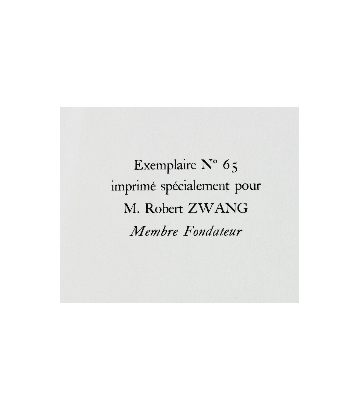 Ouvrage illustré de 46 pointes sèches par André Jacquemin, dont le frontispice, 23 in-texte et 22 culs-de-lampe. Un des 120 exemplaires numérotés et imprimés au nom des membres de la société, celui-ci n°65, imprimé spécialement pour M. Robert Zwang, membre fondateur, enrichi du menu illustré de la société.