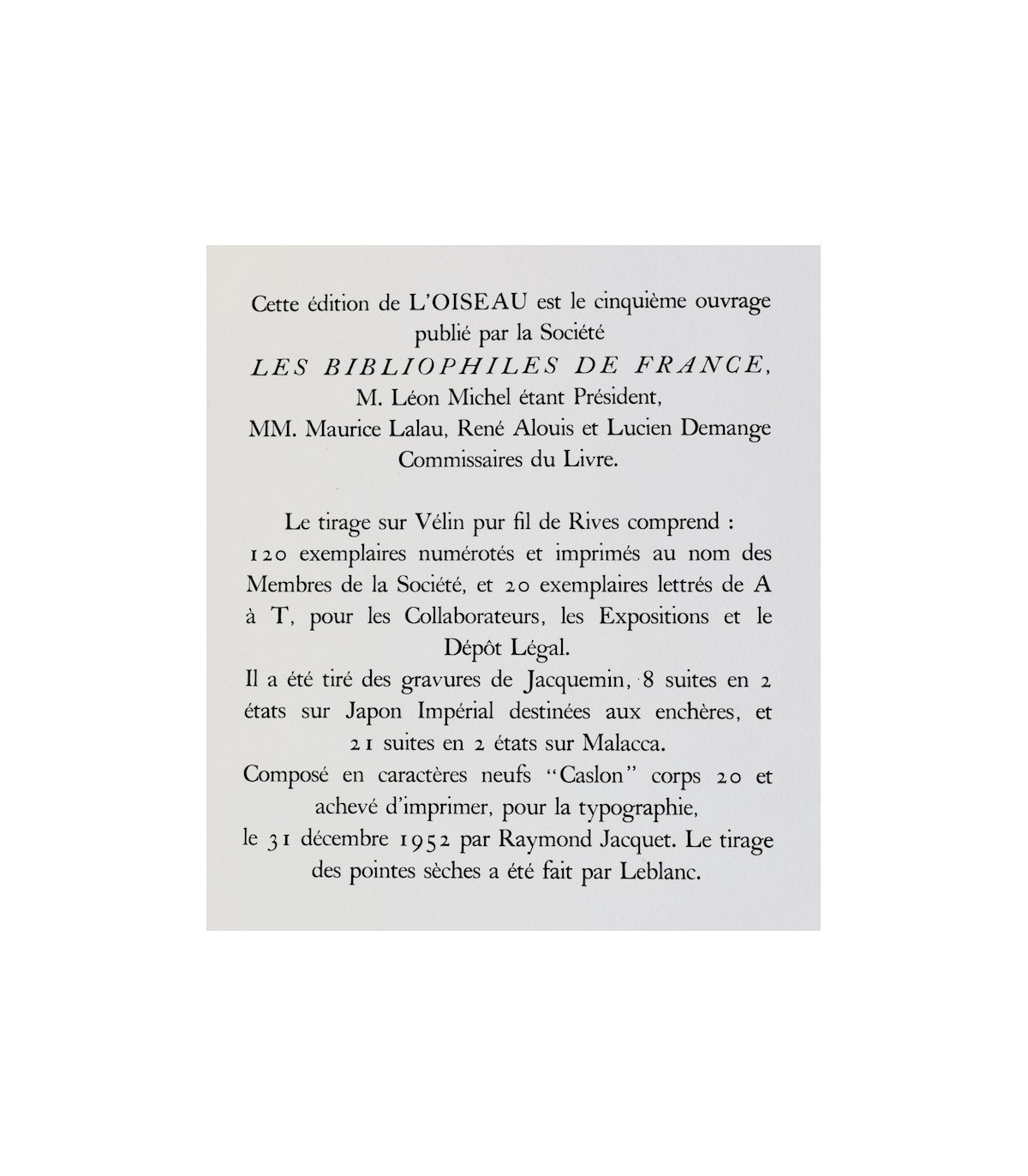 In-4 (33cm x 25,8cm) de 196-[3]pp. Tirage à 140 exemplaires numérotés sur vélin pur fil de Rives, dont 120 exemplaires pour les membres de la société et 20 exemplaires de collaborateurs. En feuilles sous couverture imprimée et rempliée, chemise et étui.