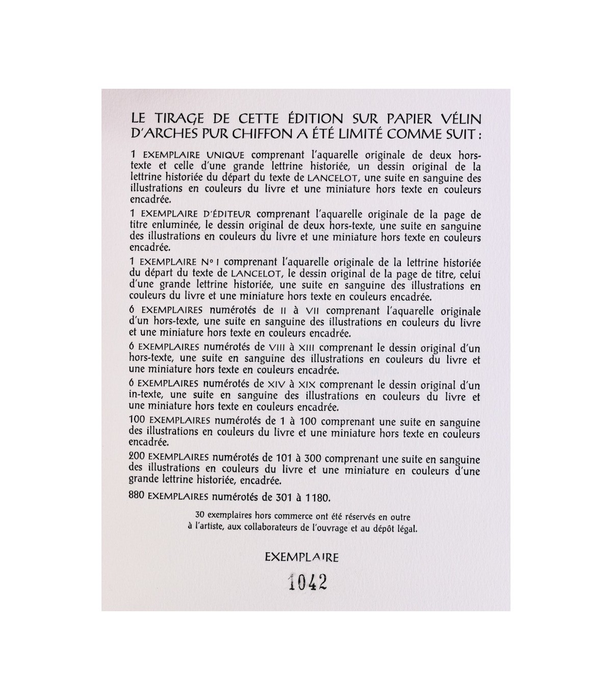 In-4 (30,3cm x 23,4cm) de 198-[11]pp. Tirage limité à 1231 exemplaires numérotés sur vélin d’Arches pur chiffon, dont 1 ex. unique, 1 ex. éditeur, 1 ex. avec une aquarelle, 2 dessins originaux, une suite et une miniature encadrée, 6 ex. avec une aquarelle, une suite et une miniature encadrée, 12 ex. avec un dessin original, une suite et une miniature encadrée, 100 ex. avec une suite et une miniature encadrée, 200 ex. avec une suite et une lettrine encadrée, 880 ex. non enrichis et 30 ex. hors-commerce.