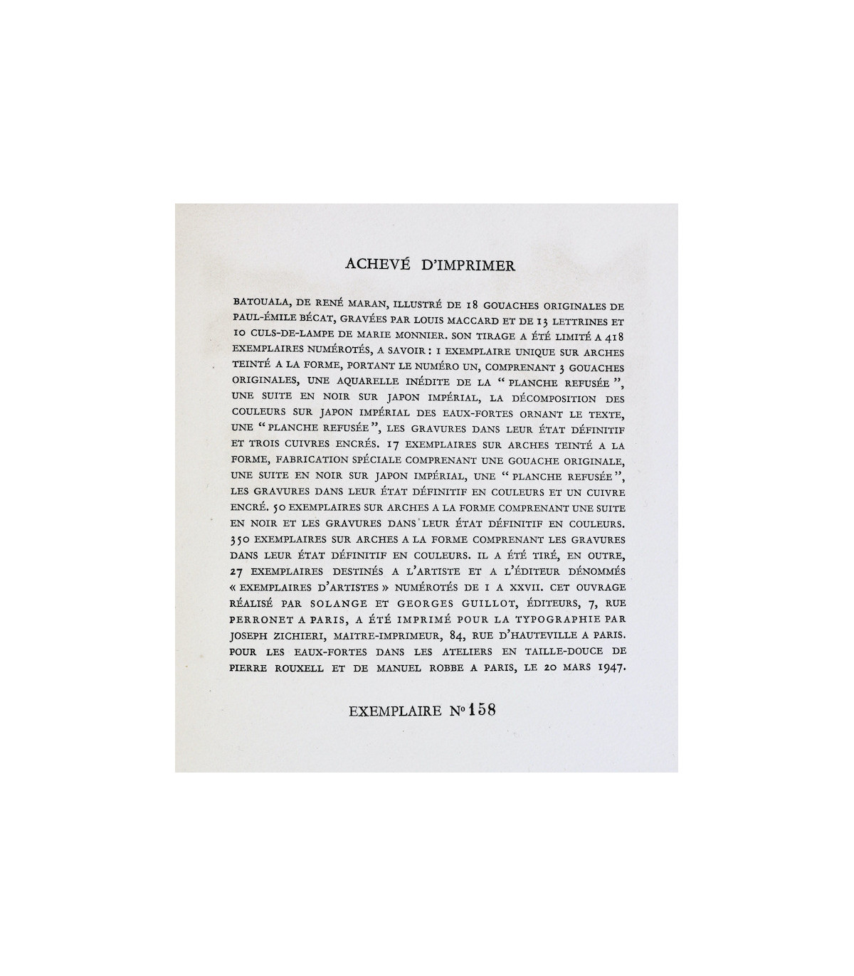 Ouvrage illustré de 18 gouaches originales de Paul-Émile Bécat, gravées par Louis Maccard et de 13 lettrines et 10 culs-de-lampe de Marie Monnier. Un des 350 exemplaires numérotés sur Arches à la forme avec les gravures dans leur état définitif en couleurs, celui-ci n°158.