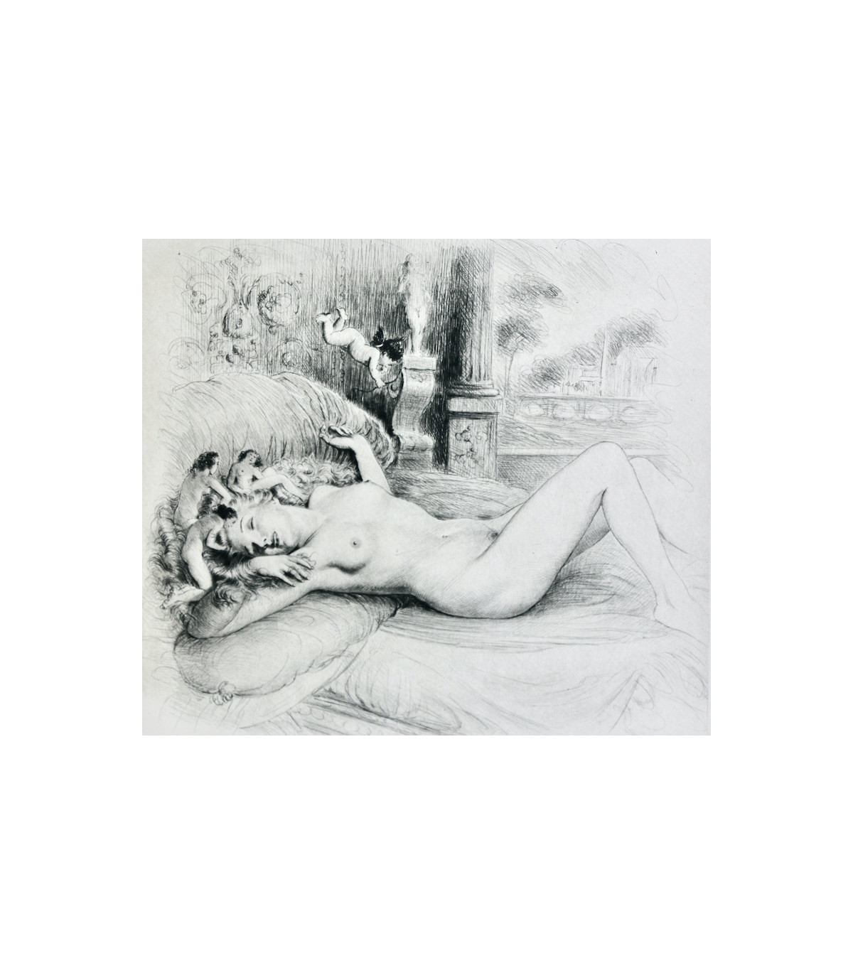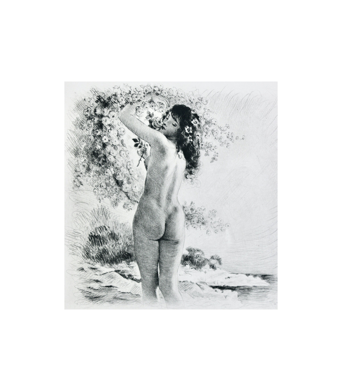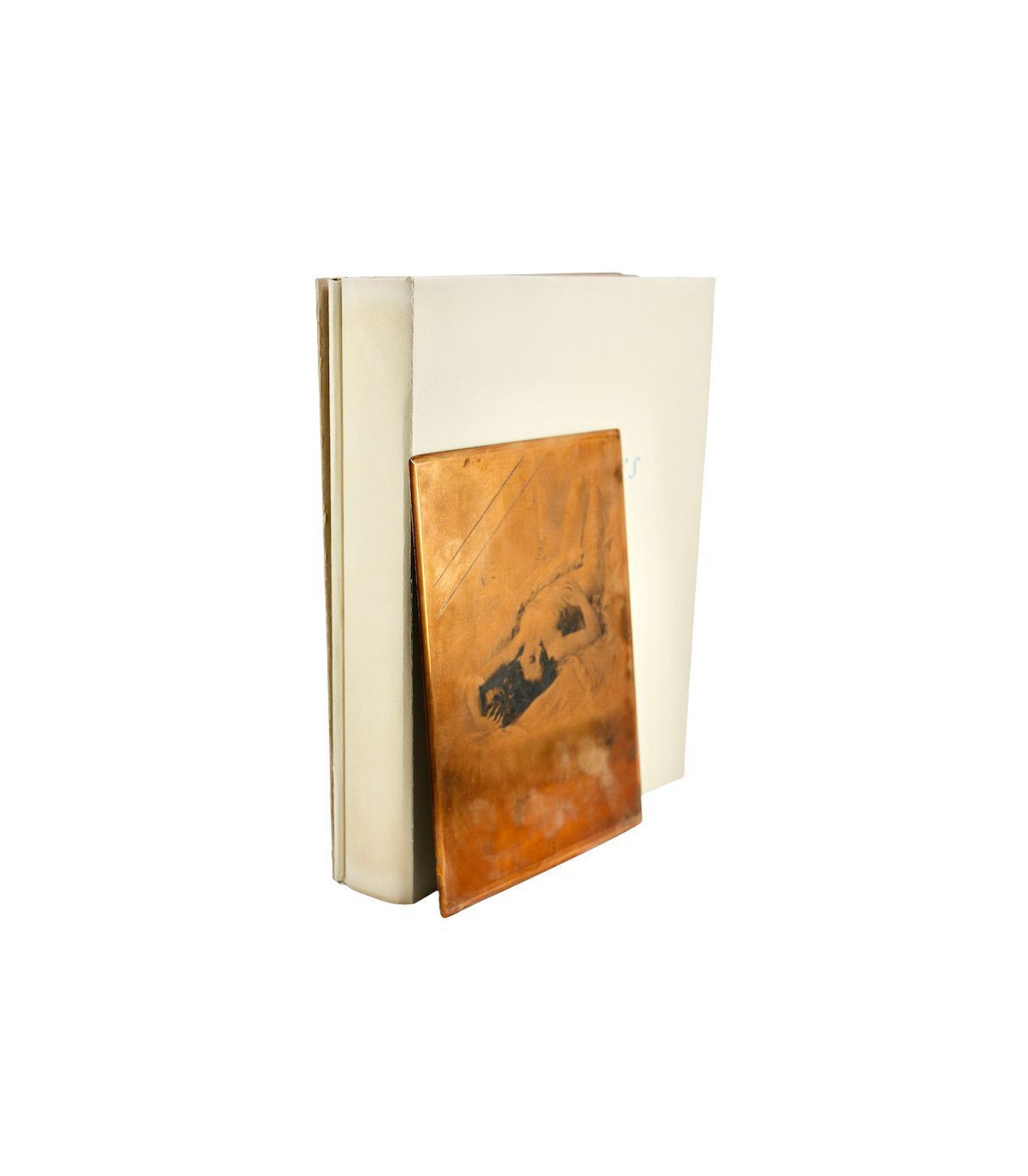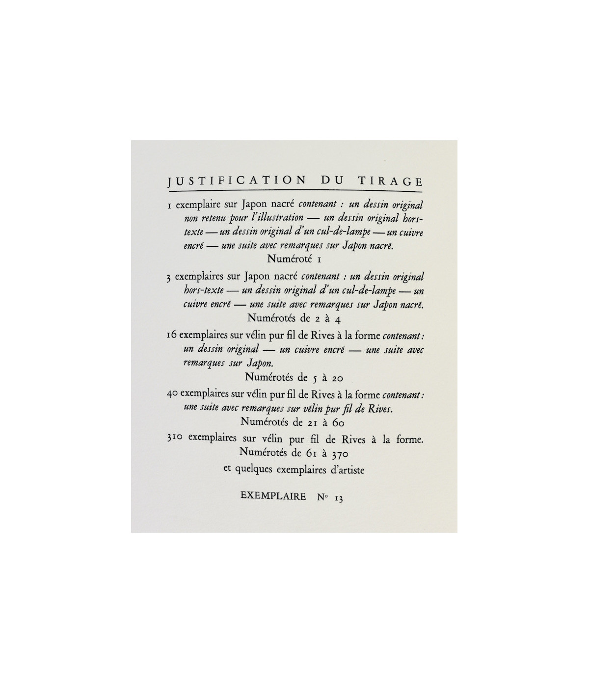 Un des 16 exemplaires numérotés sur vélin pur fil de Rives contenant un dessin original signé (du in-texte p.65 - 13,5cm x 12,5cm), un cuivre encré (du in-texte p.57) et une suite avec remarques sur Japon, celui-ci n°13, enrichi d’une gravure libre inédite avec remarques sur Japon et d’un spécimen de l’ouvrage de 12 pages.