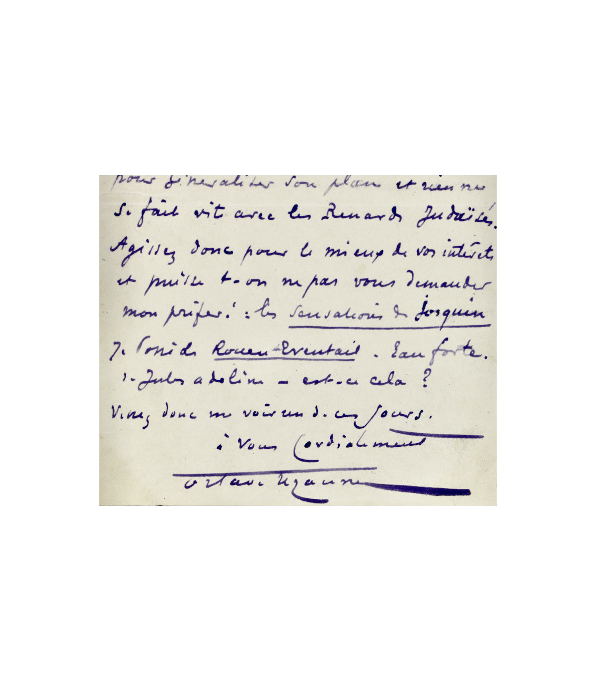 Lettre autographe signée d’Octave Uzanne, adressée à un ami proche du milieu littéraire et éditorial. L’écrivain y évoque ses relations professionnelles avec les éditeurs Quantin et Lévy, témoignant de l’effervescence du monde de l’édition parisienne des années 1880.