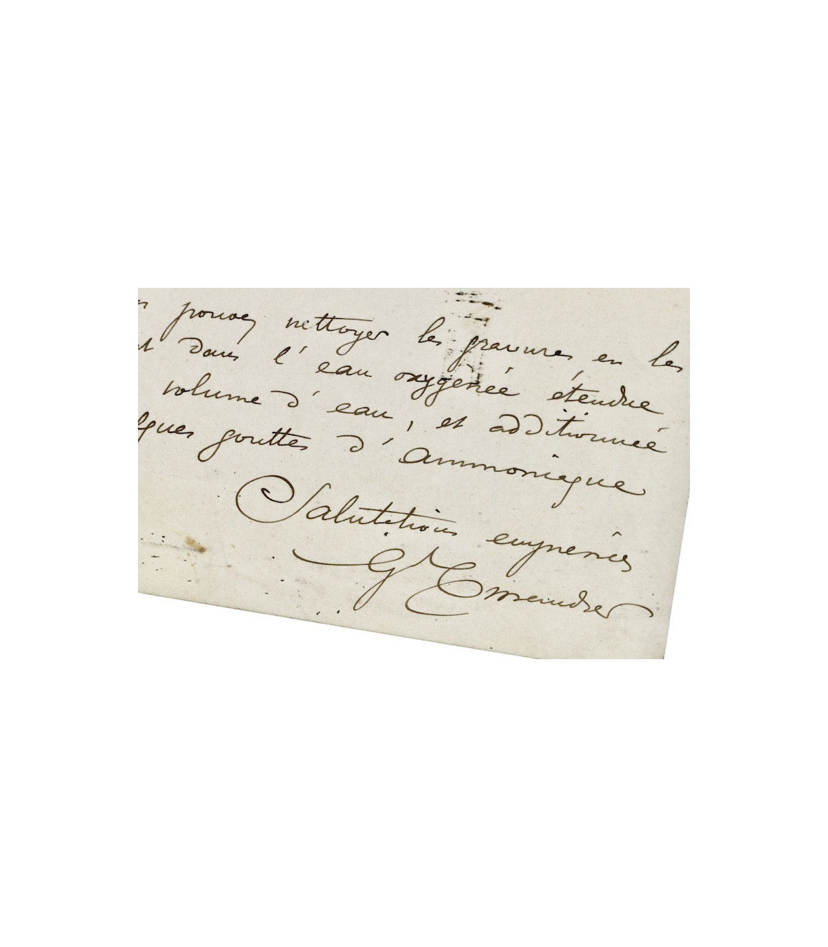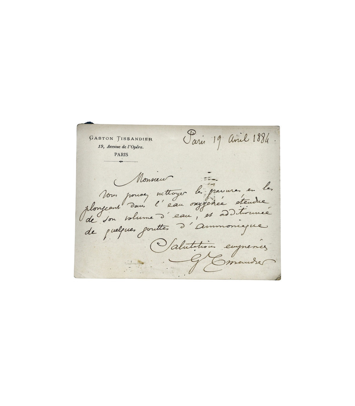 Lettre autographe signée de Gaston Tissandier, datée du 19 avril 1884. L’aéronaute et vulgarisateur scientifique répond à un correspondant en lui donnant une méthode précise pour nettoyer des gravures, utilisant eau oxygénée et ammoniaque. Courrier bref mais technique, illustrant l’expertise scientifique pratique de Tissandier.